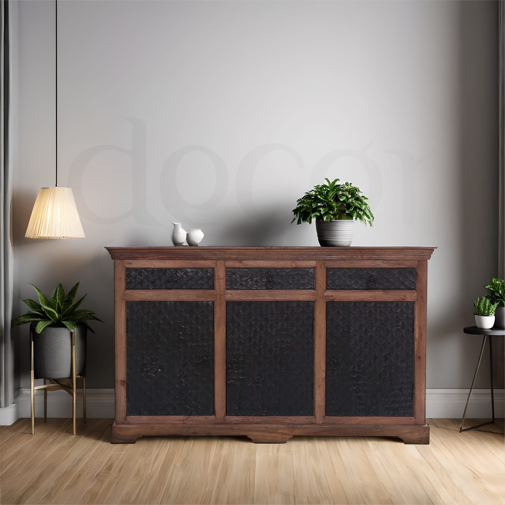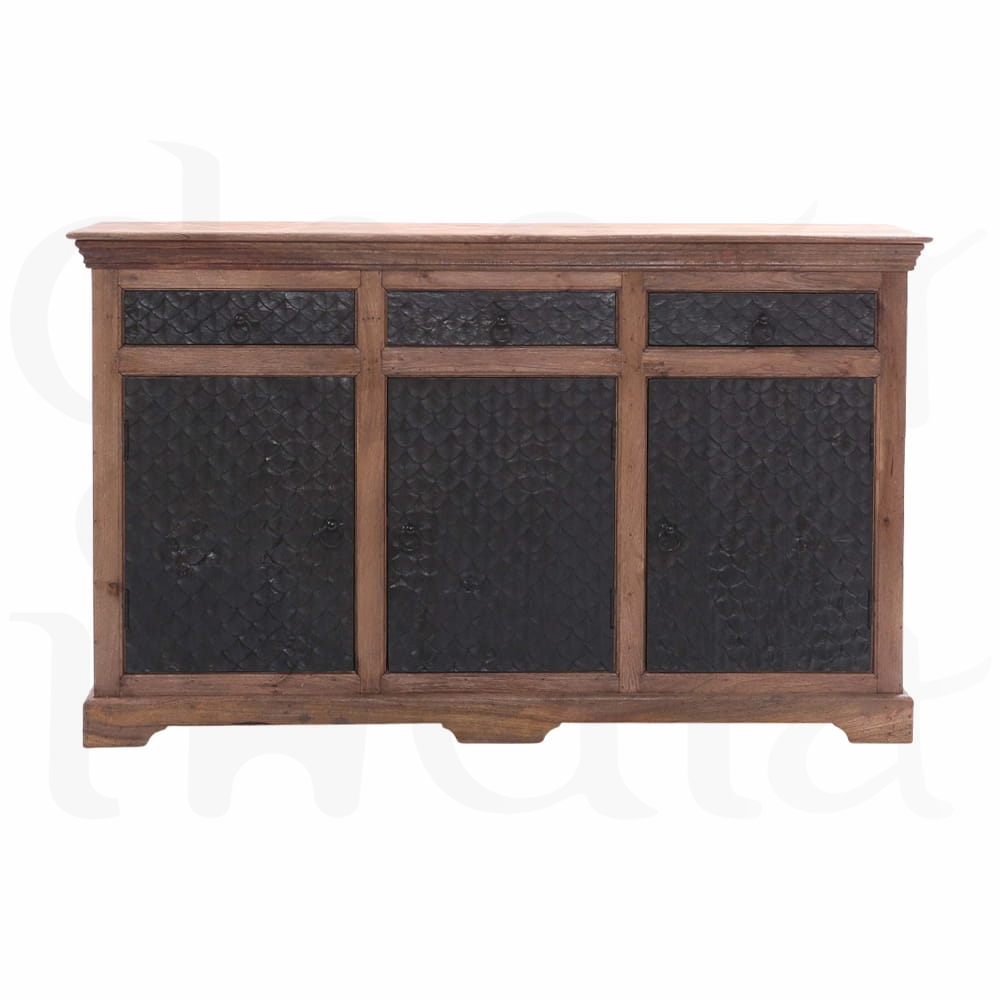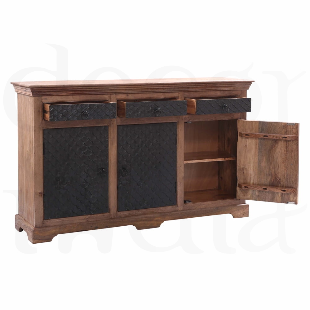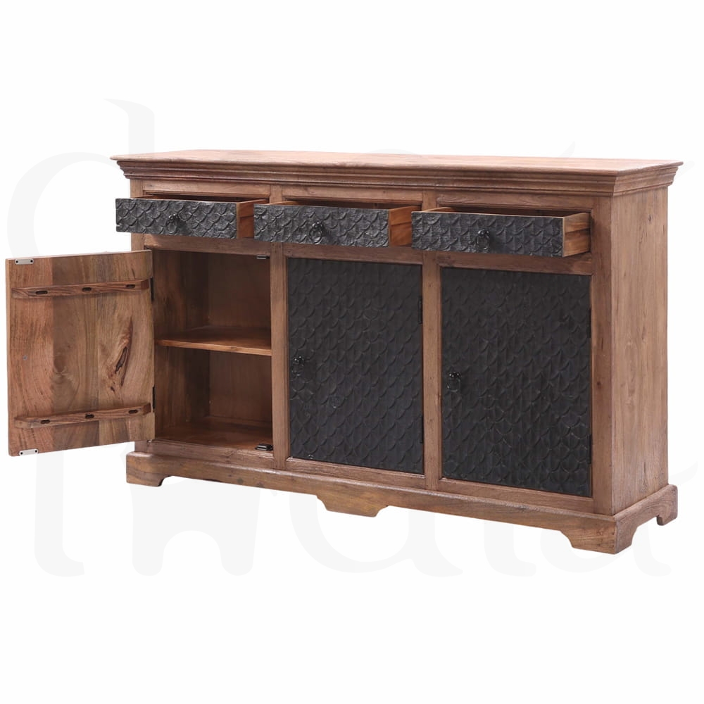 Przyciągający wzrok front komody, ozdobiony unikalną, rzeźbioną fakturą, nadaje jej głębi i charakteru. Czarny kolor drzwi kontrastuje z ciepłym odcieniem naturalnego drewna, tworząc wyjątkowe połączenie, które podkreśla autentyczność mebla.