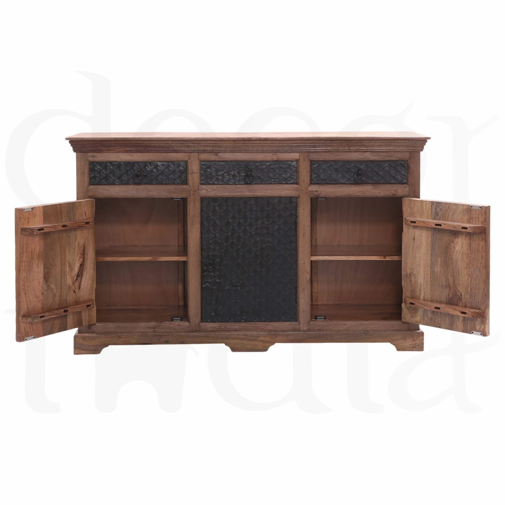 Ta meble indyjskie komoda oferuje nie tylko stylowy wygląd, ale także praktyczną funkcjonalność. Za pięknie zdobionymi drzwiami kryje się wystarczająco dużo miejsca do przechowywania, co czyni ją idealnym rozwiązaniem do przechowywania zarówno codziennych przedmiotów, jak i cenionych skarbów.