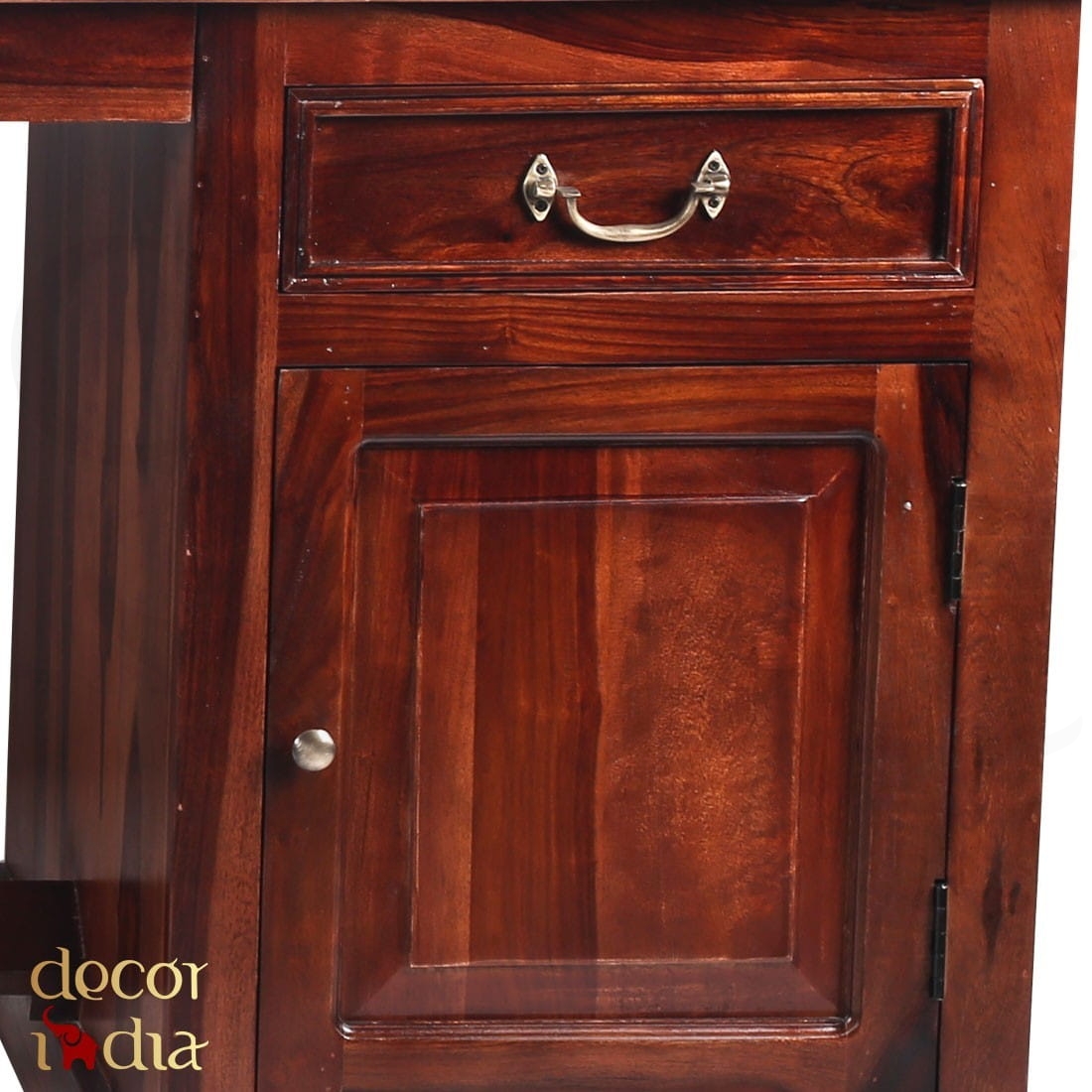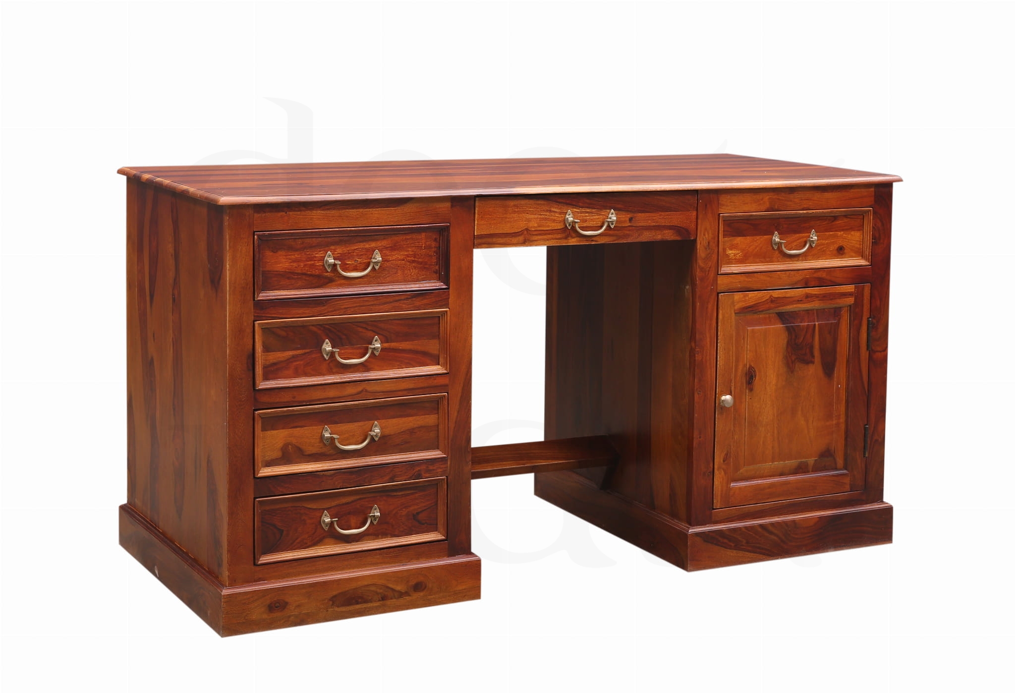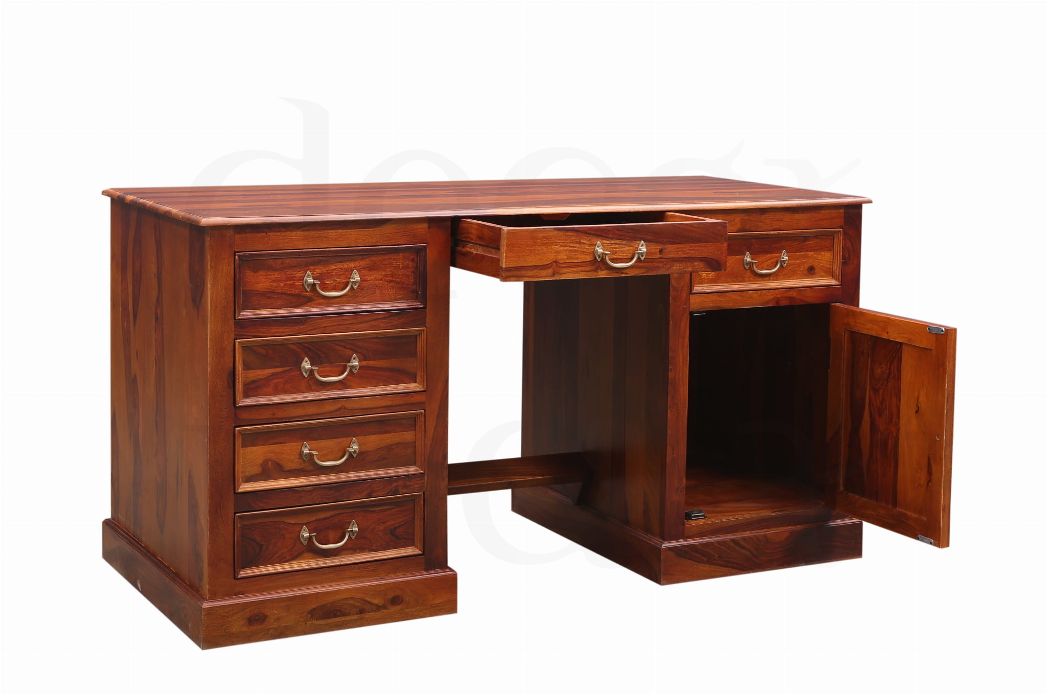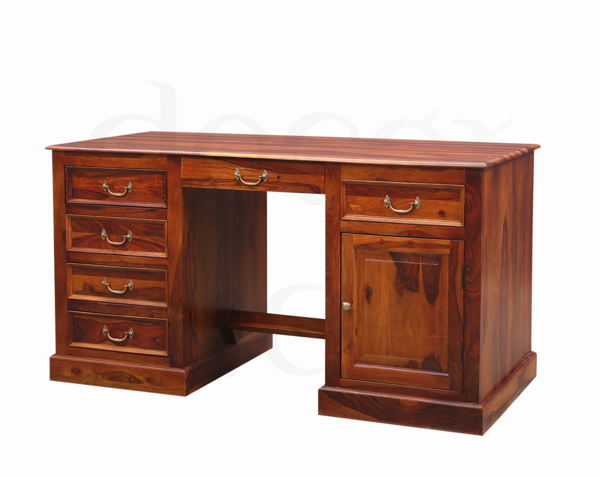 To eleganckie biurko zostało wykonane z wysokogatunkowego drewna palisandrowego, znanego z wyjątkowej trwałości oraz pięknego, głębokiego rysunku słojów. Precyzyjne, ręczne wykonanie podkreśla dbałość o każdy detal, łącząc funkcjonalność z klasycznym pięknem.