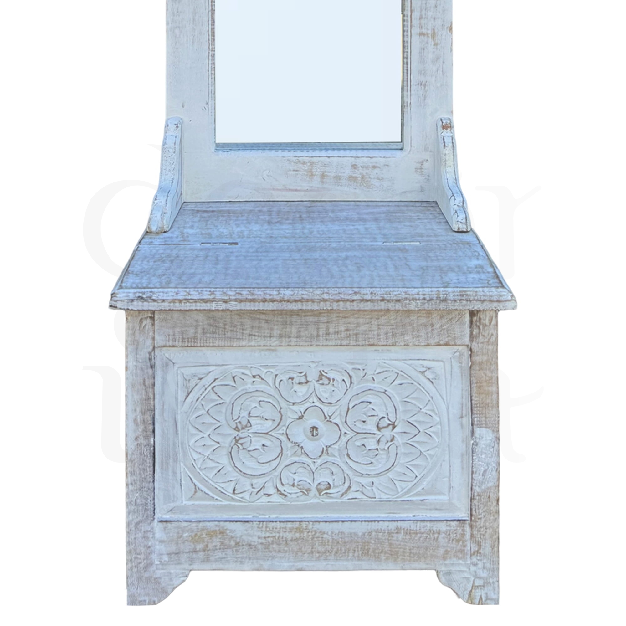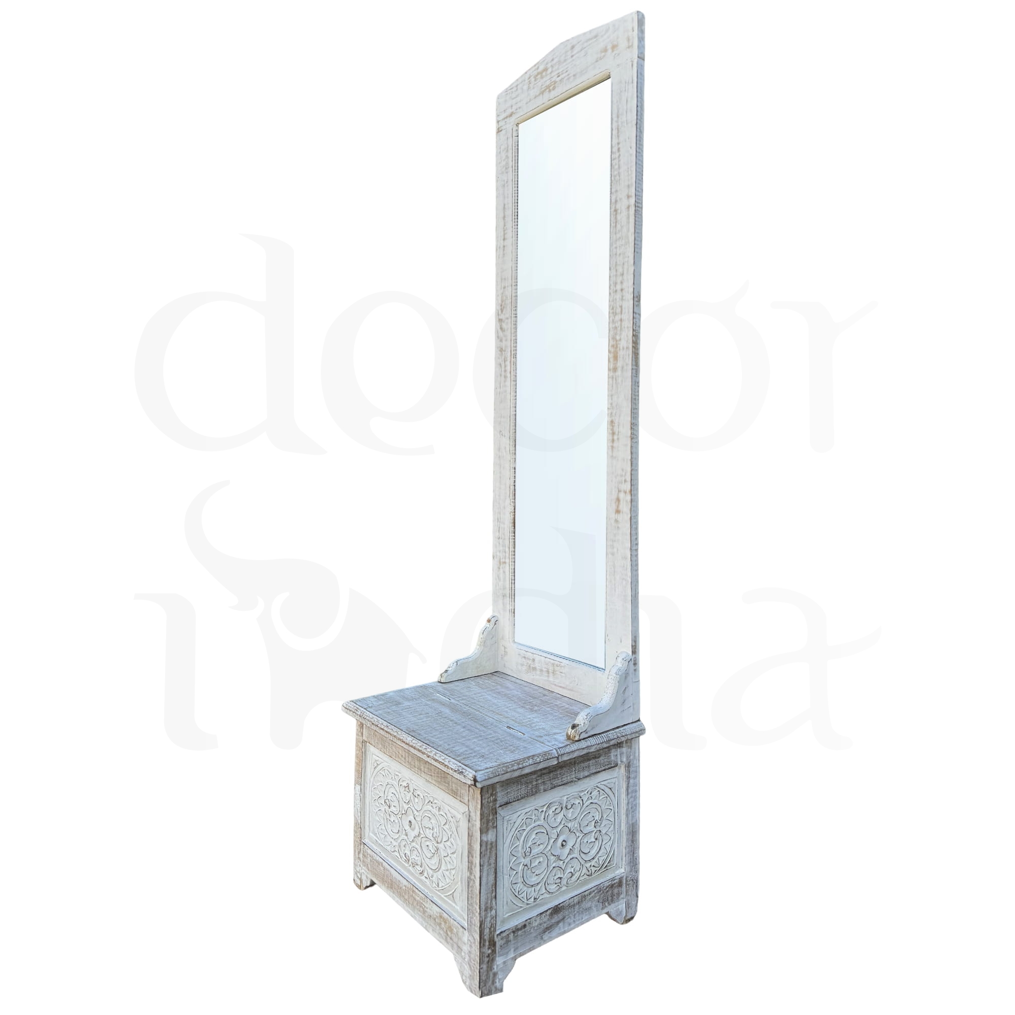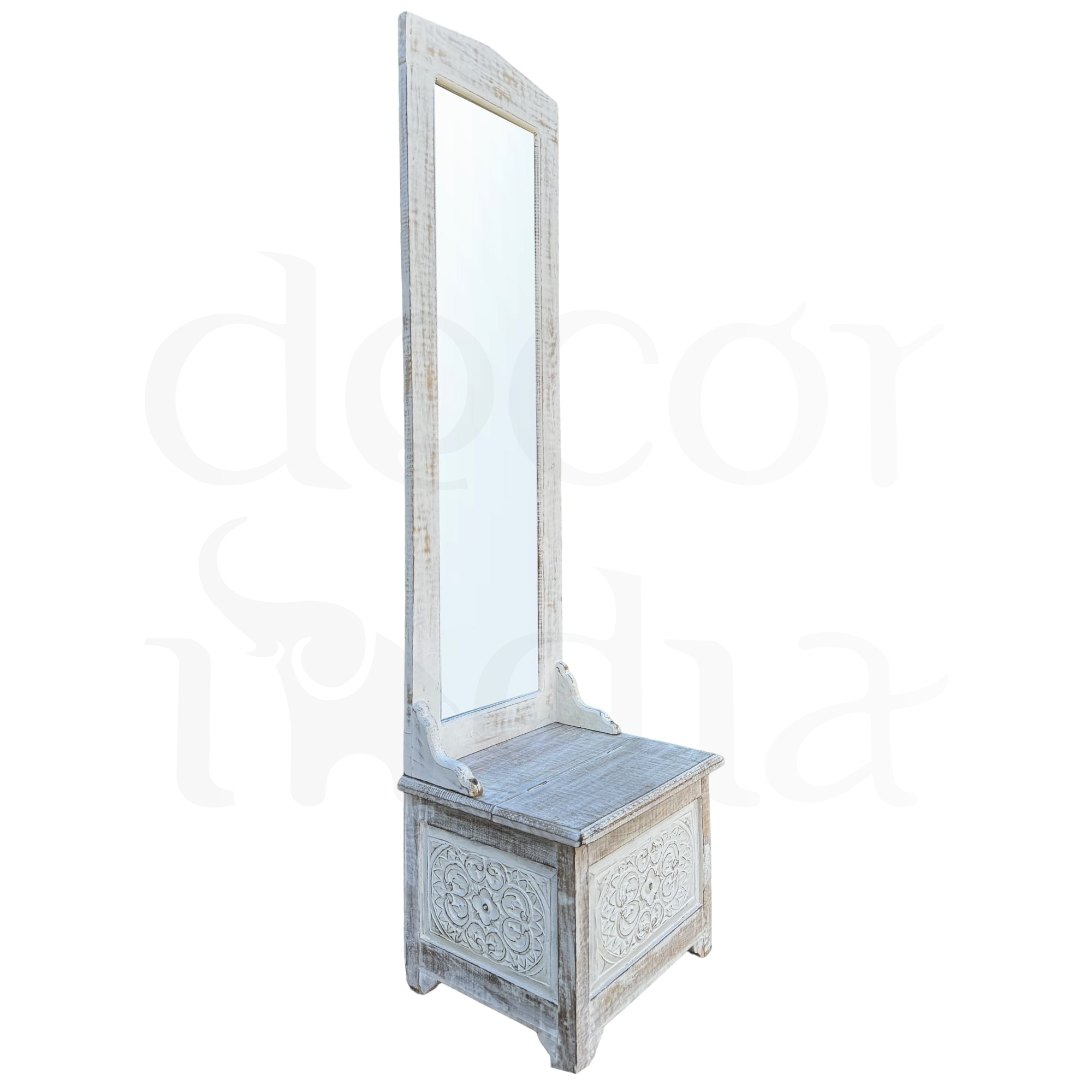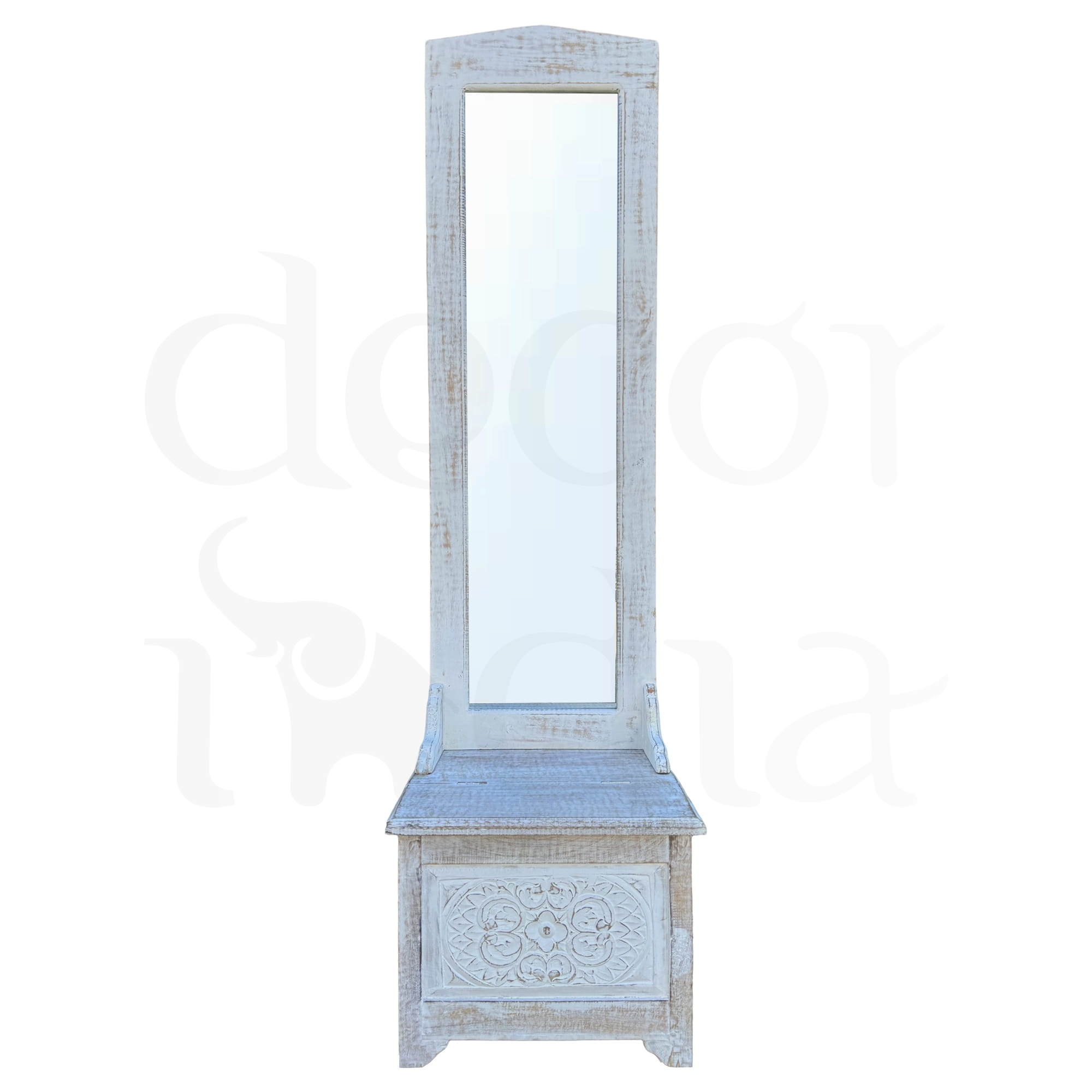 Ta indyjska drewniana skrzynia z lustrem to doskonały dodatek do każdego przedpokoju, łączący funkcjonalność z subtelnym stylem. Wykonana z wysokiej jakości litego drewna mango, ta minimalistyczna skrzynia cechuje się trwałością i solidnością, typowymi dla mebli indyjskich.