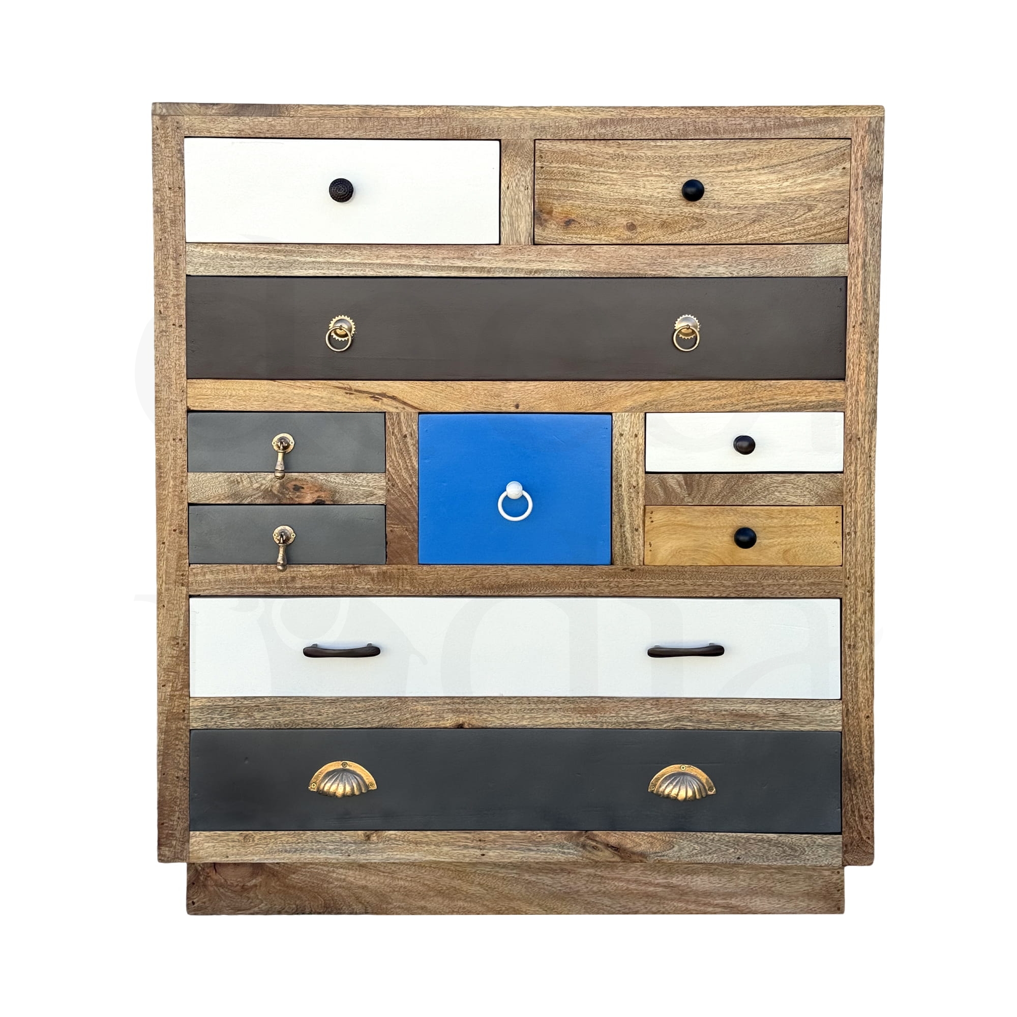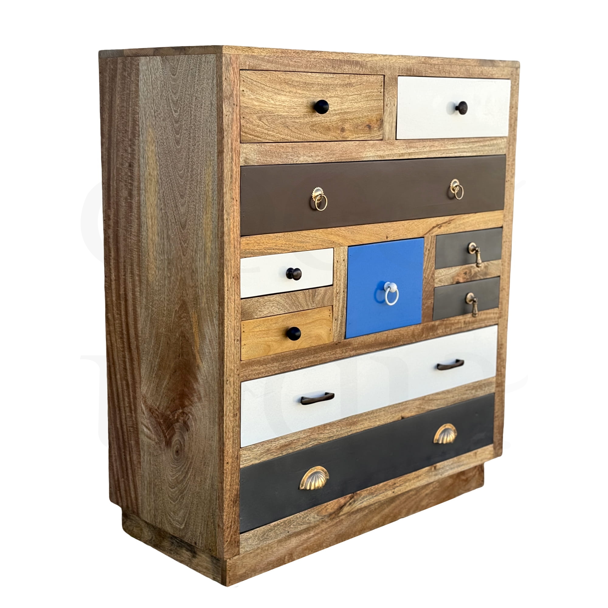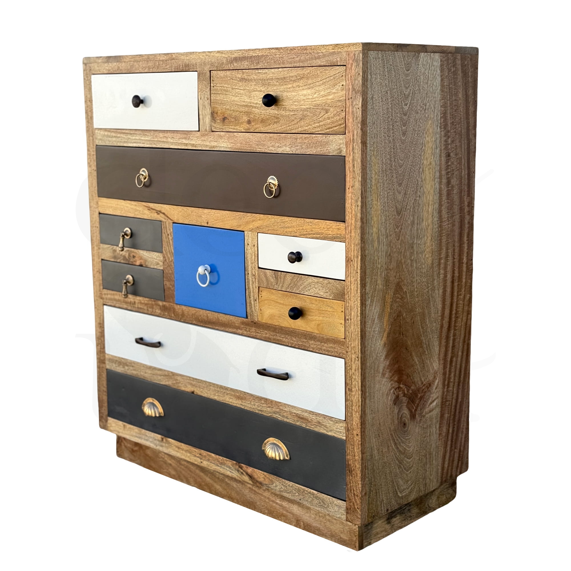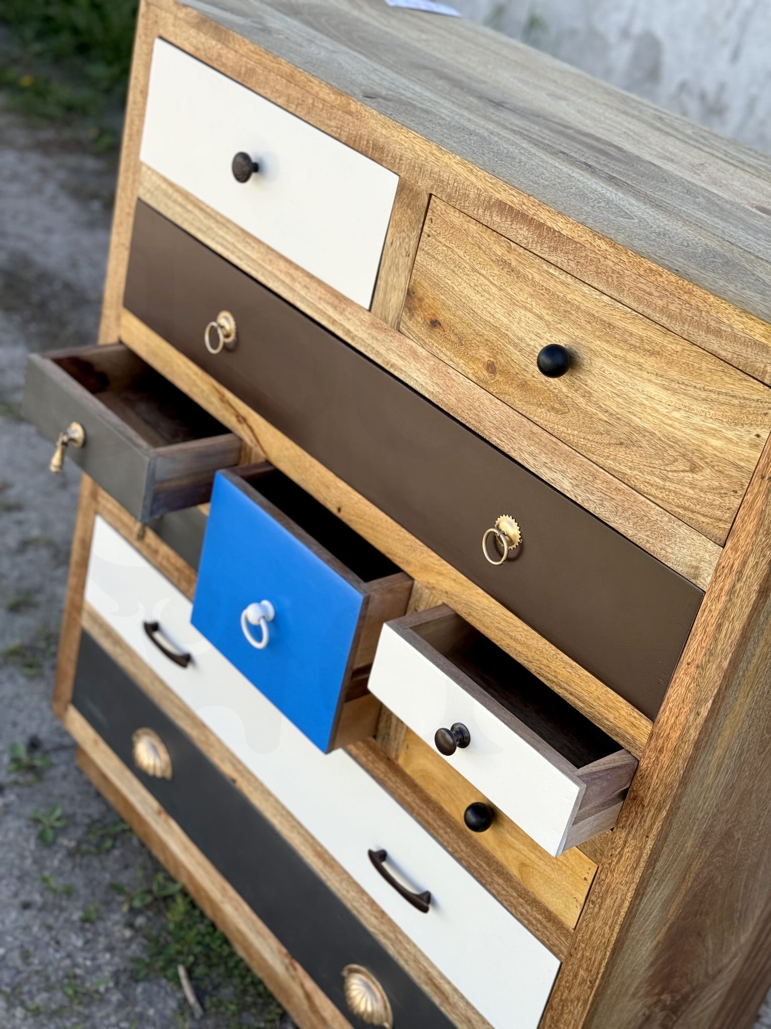 Ta indyjska drewniana komoda z szufladami to idealny wybór dla osób poszukujących wyrazistego i funkcjonalnego mebla do swojego domu. wykonana z wysokiej jakości drewna akacjowego, które słynie ze swojej trwałości i naturalnego piękna.Kolorowa drewniana komoda ta jest zarówno trwała, jak i stylowa, oferując mnóstwo przestrzeni do przechowywania dzięki swoim różnorodnym i kolorowym szufladom.