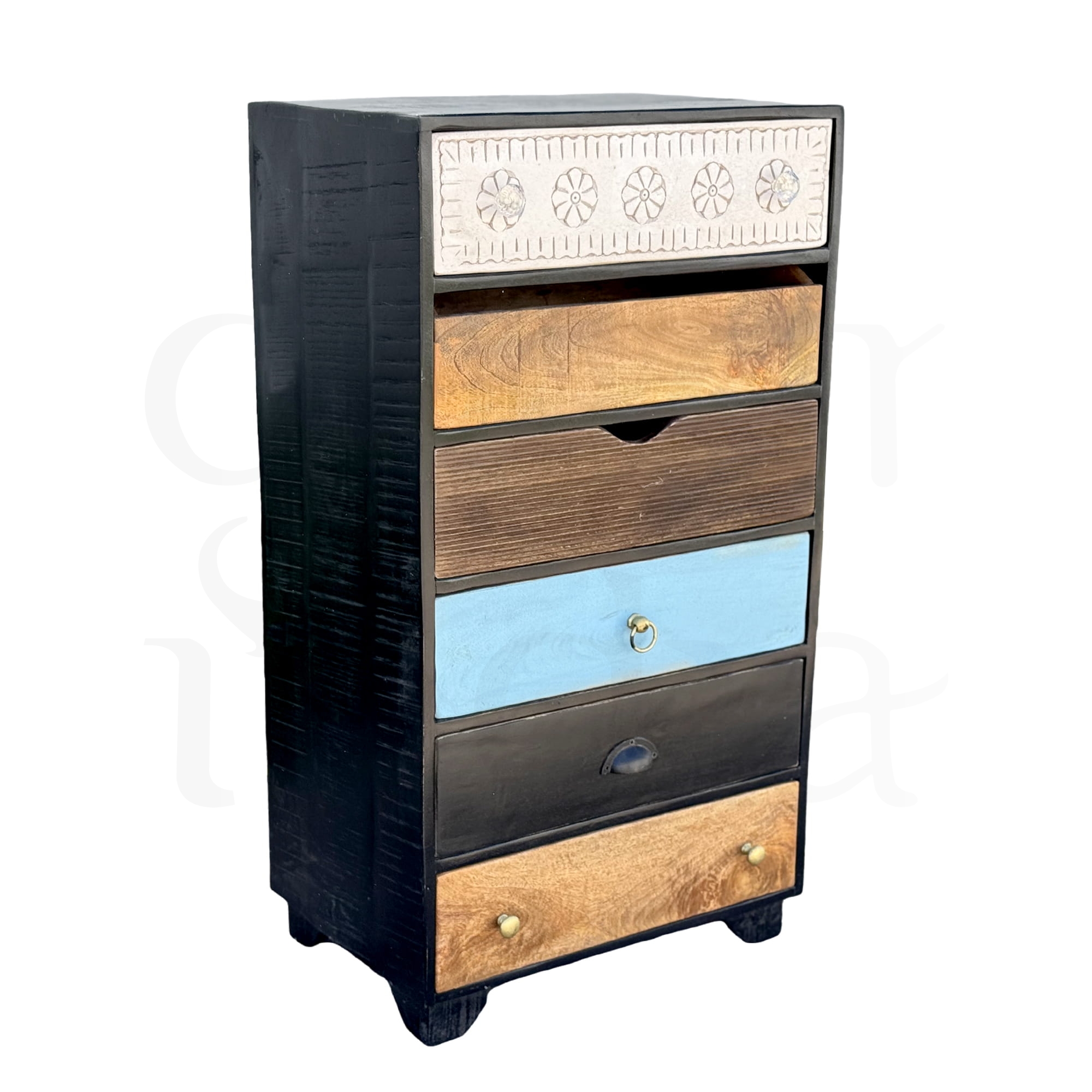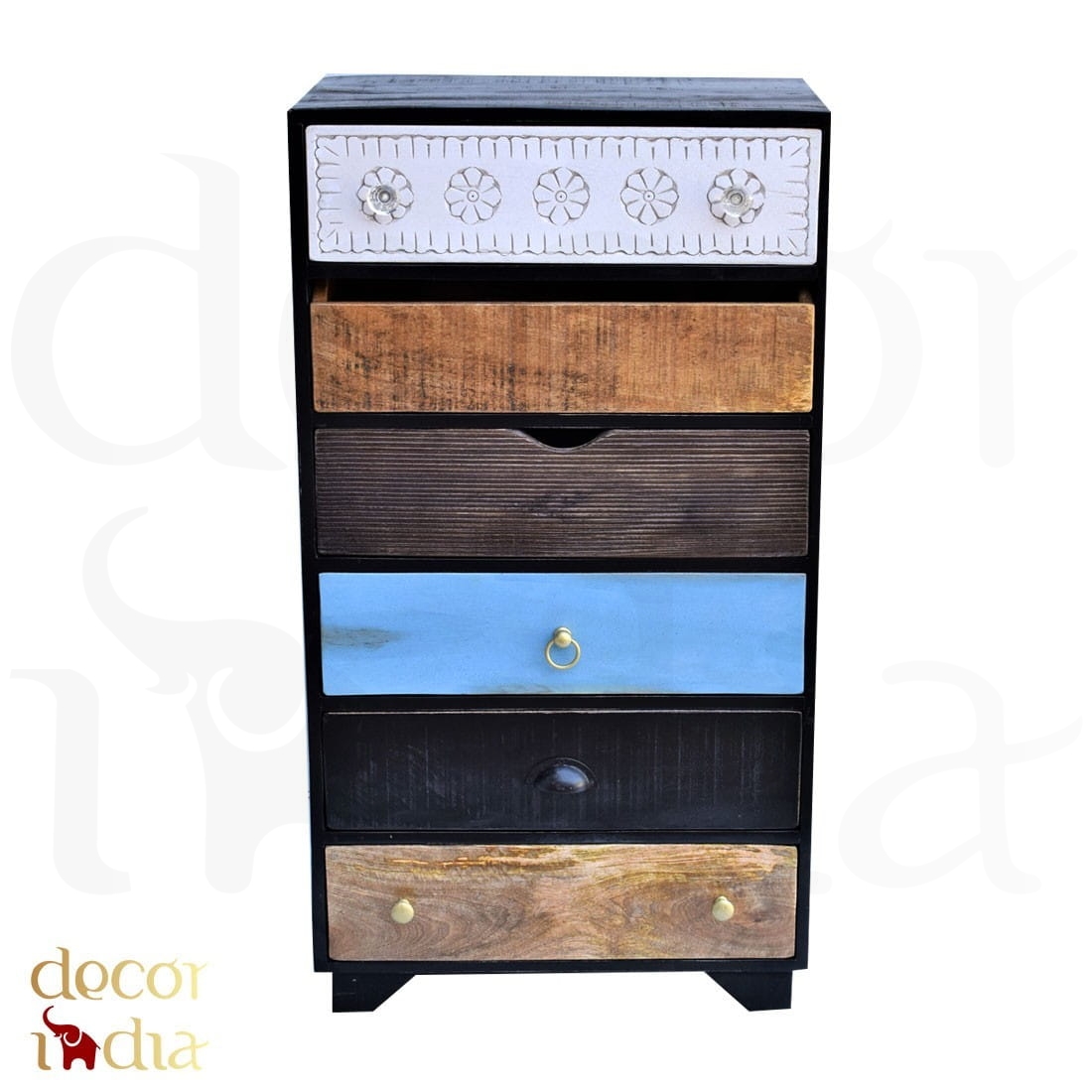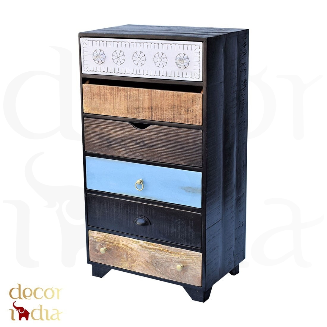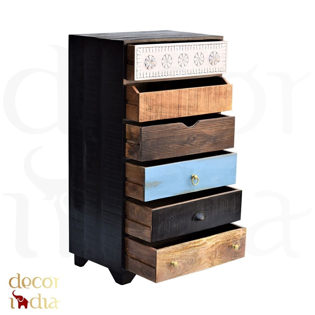 indyjska drewniana komoda zawiera kilka szuflad o różnych rozmiarach i kolorach, co nie tylko dodaje jej estetycznego uroku, ale również czyni ją niezwykle praktycznym rozwiązaniem do przechowywania. Każda szuflada jest wykończona unikalnym uchwytem, co dodatkowo podkreśla indywidualny charakter mebla.