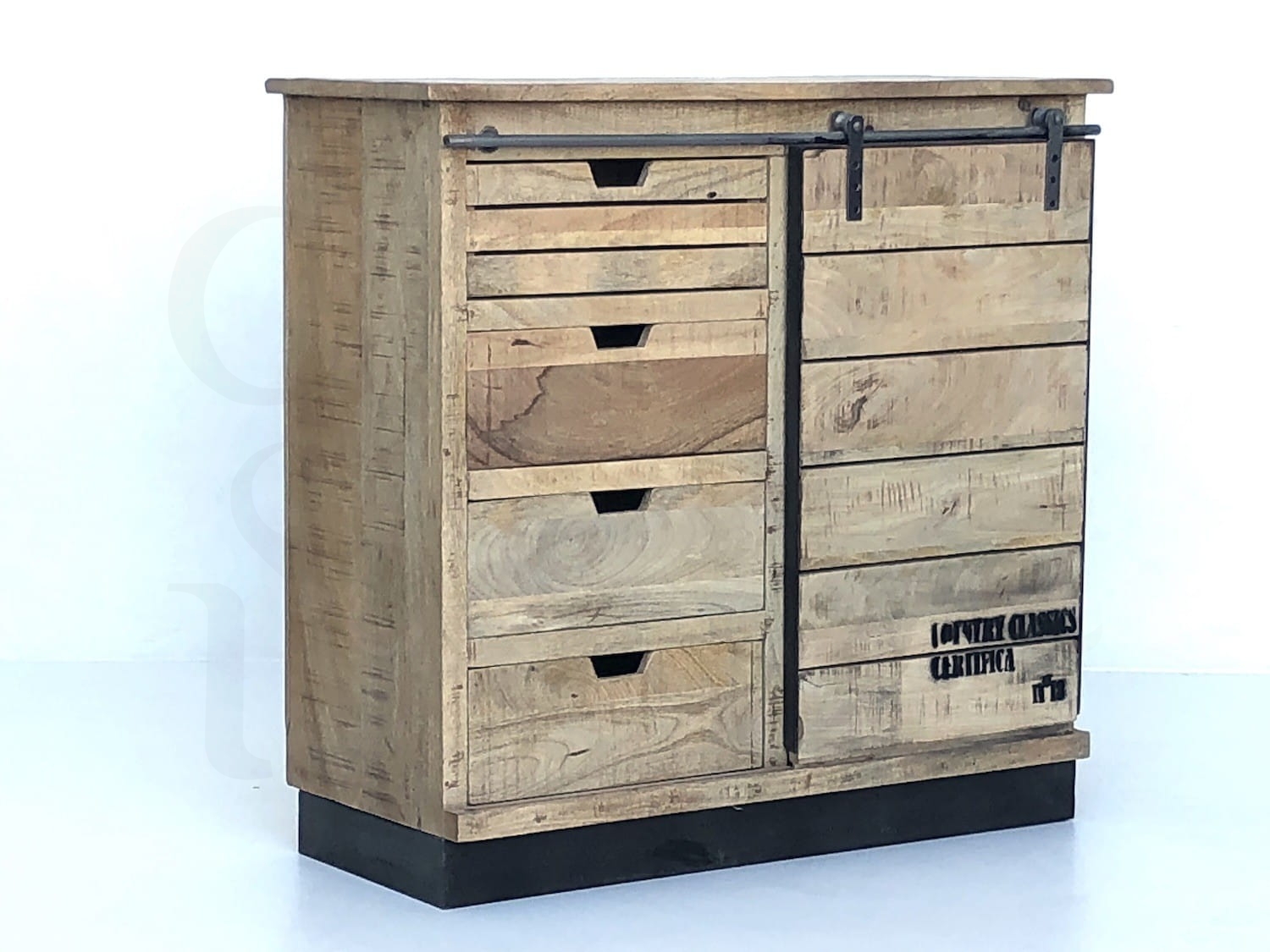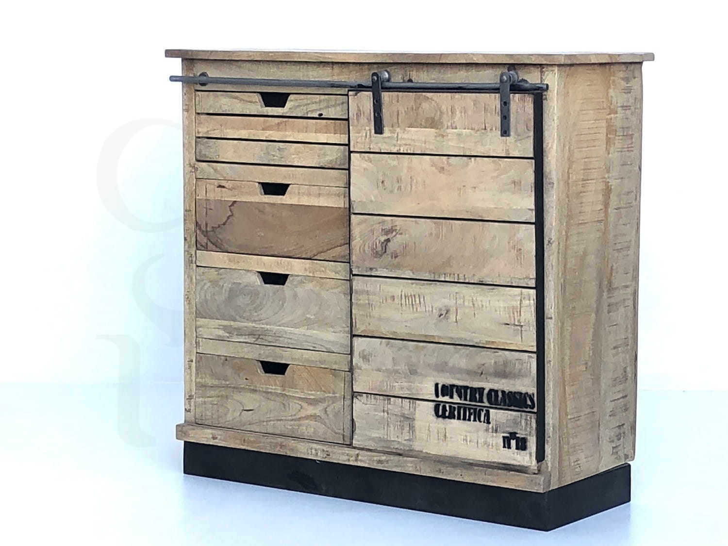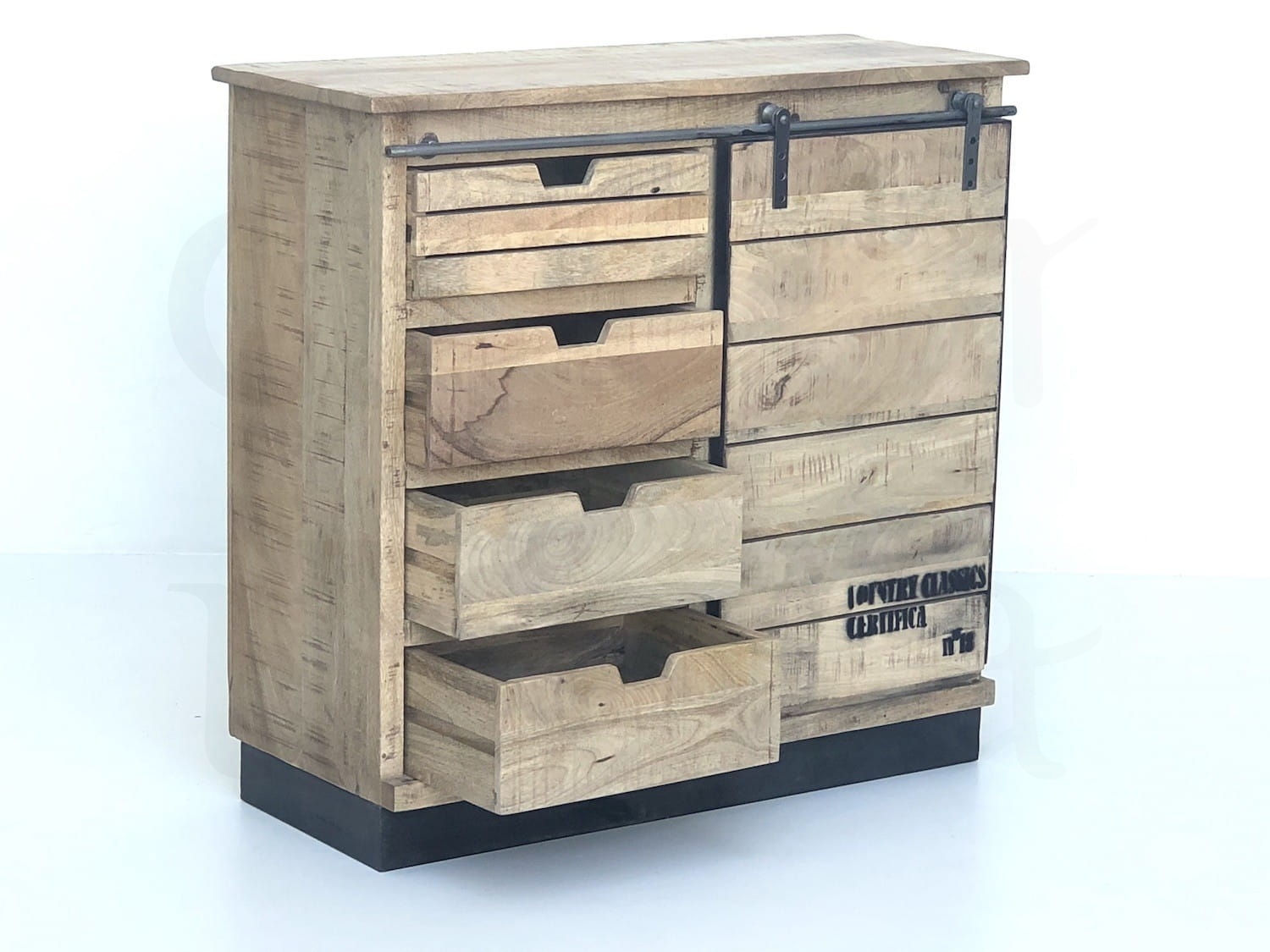Piękna drewniana komoda w stylu industrialnym, wykonana z drewna mango, które jest solidne i trwałe. Naturalna struktura egzotycznego drewna dodaje komodzie rustykalnego wdzięku i sprawia, że mebel jest wyjątkowy, szafka osadzona jest solidnych na metalowych stelażach.