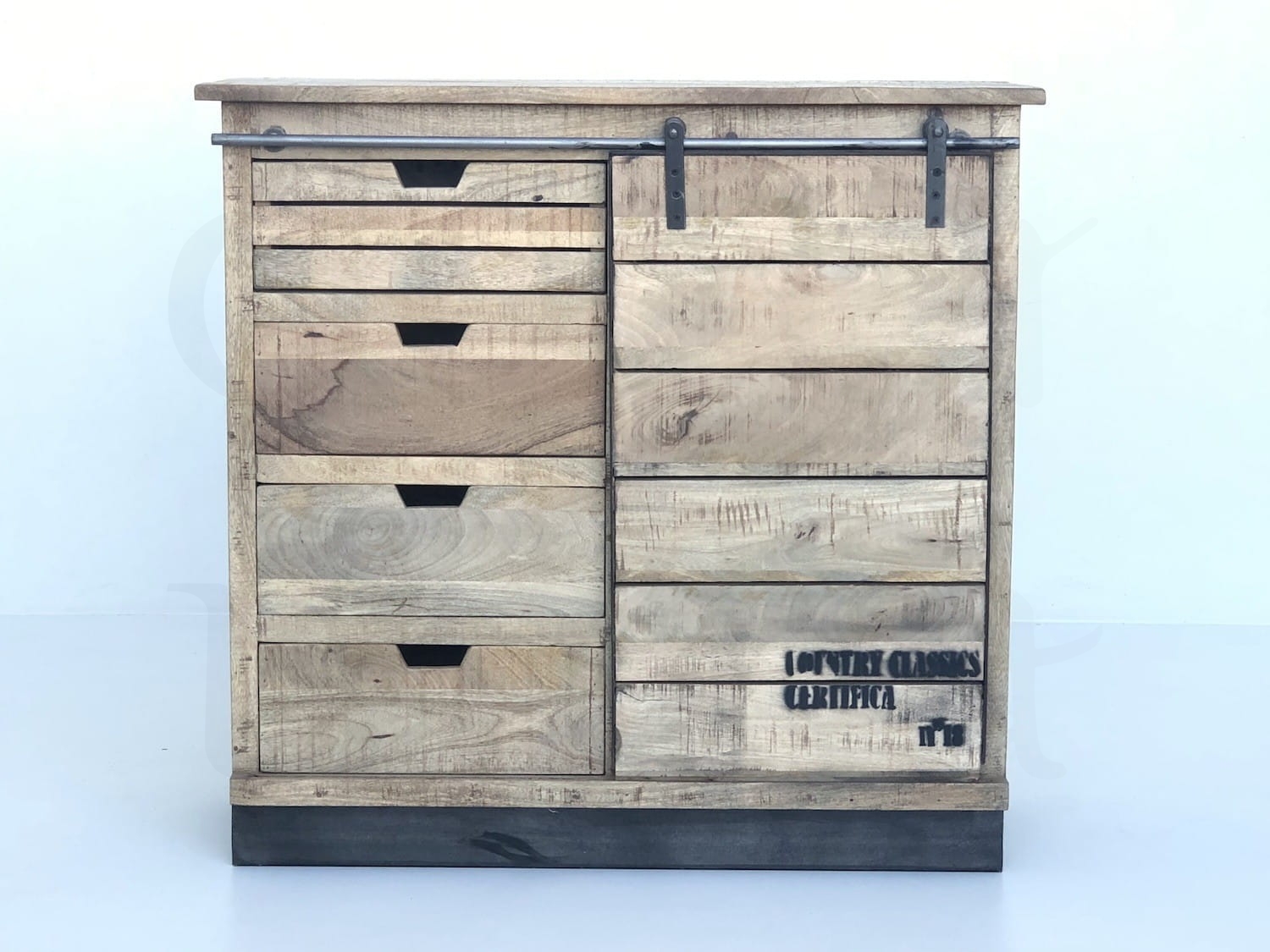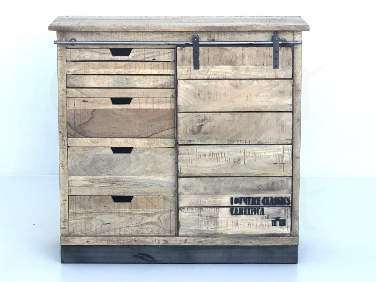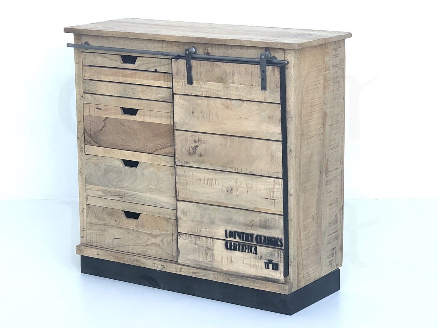 Piękna drewniana komoda w stylu industrialnym, wykonana z drewna mango, które jest solidne i trwałe. Naturalna struktura egzotycznego drewna dodaje komodzie rustykalnego wdzięku i sprawia, że mebel jest wyjątkowy, szafka osadzona jest solidnych na metalowych stelażach.