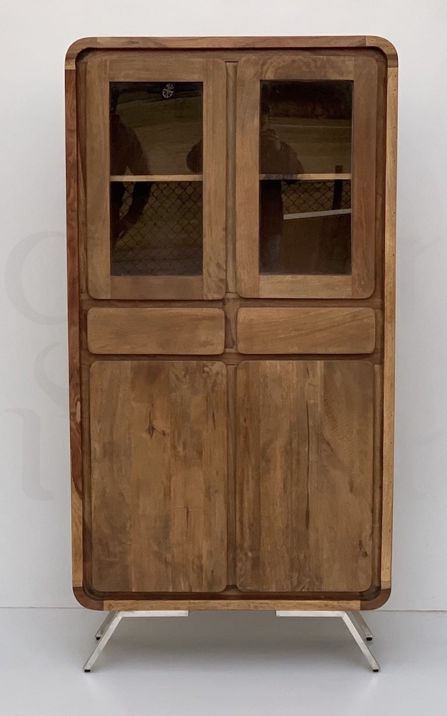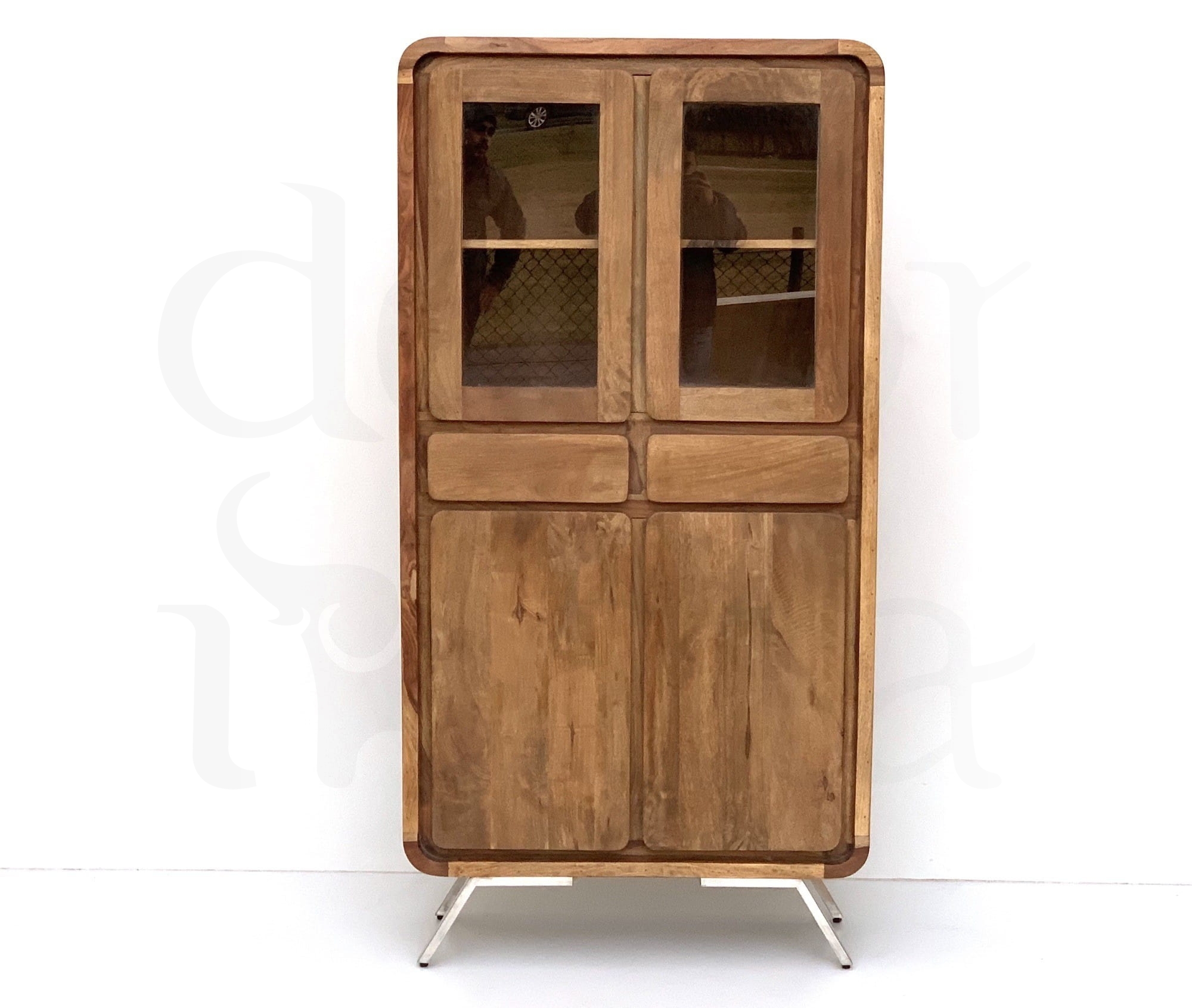 Minimalistyczny mebel wykonany z Akacja indyjskiego. Na kredensie został zachowany naturalny odcień tego drewna i do tego metalowym nogi kolory srebrny , widnieją na nim oryginalne słoje, dzięki którym kredens wygląda interesująco.