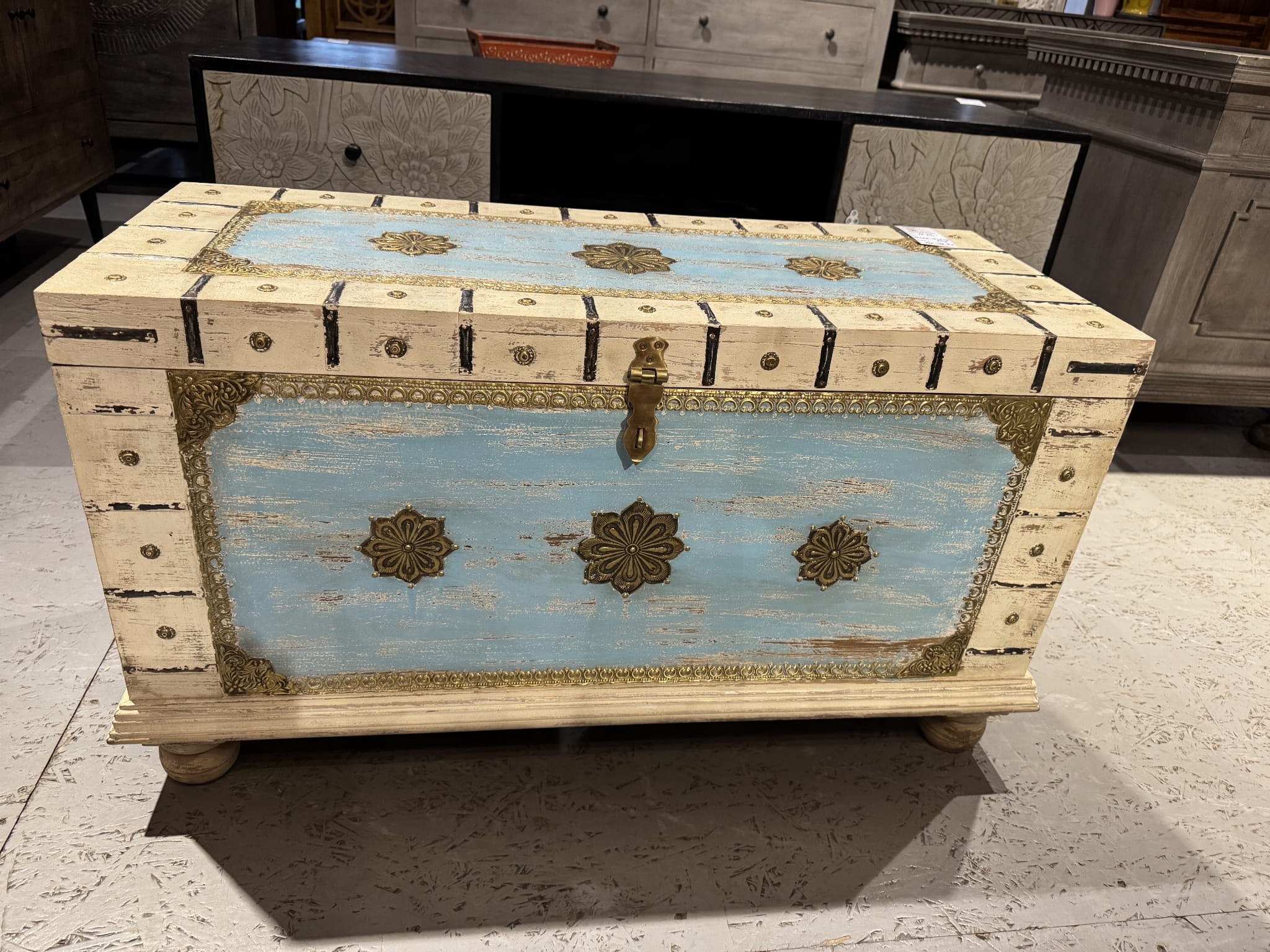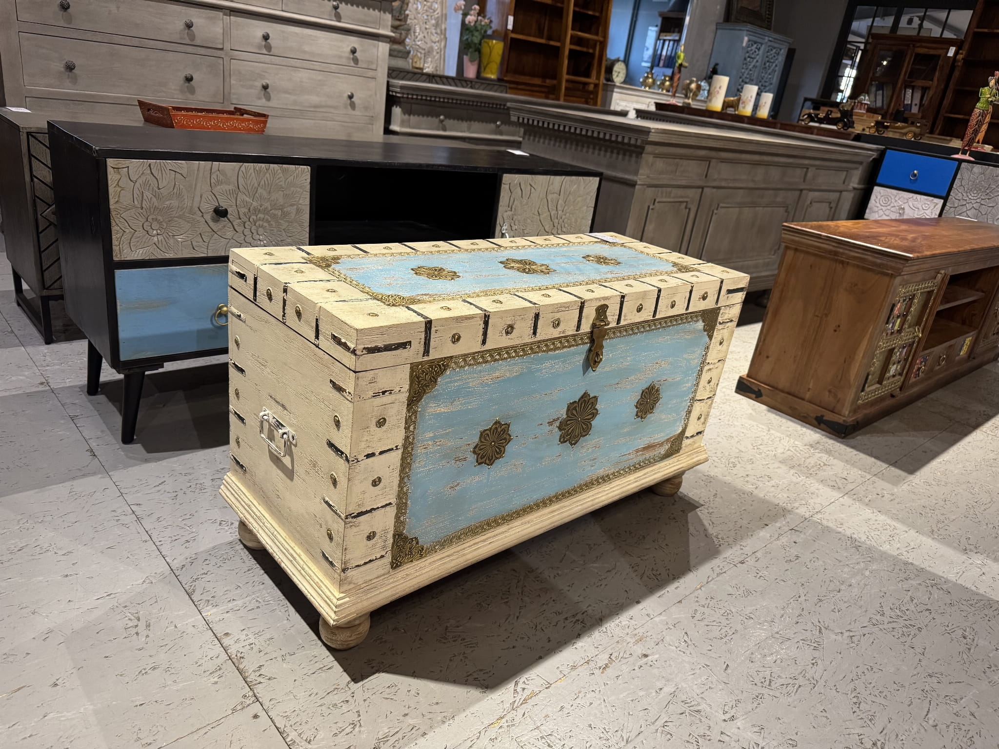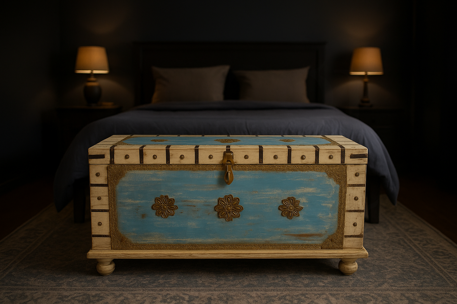 „Indyjska Antyczna Skrzynia – Drewno Mango i Ręczne Zdobienia Metalowe”