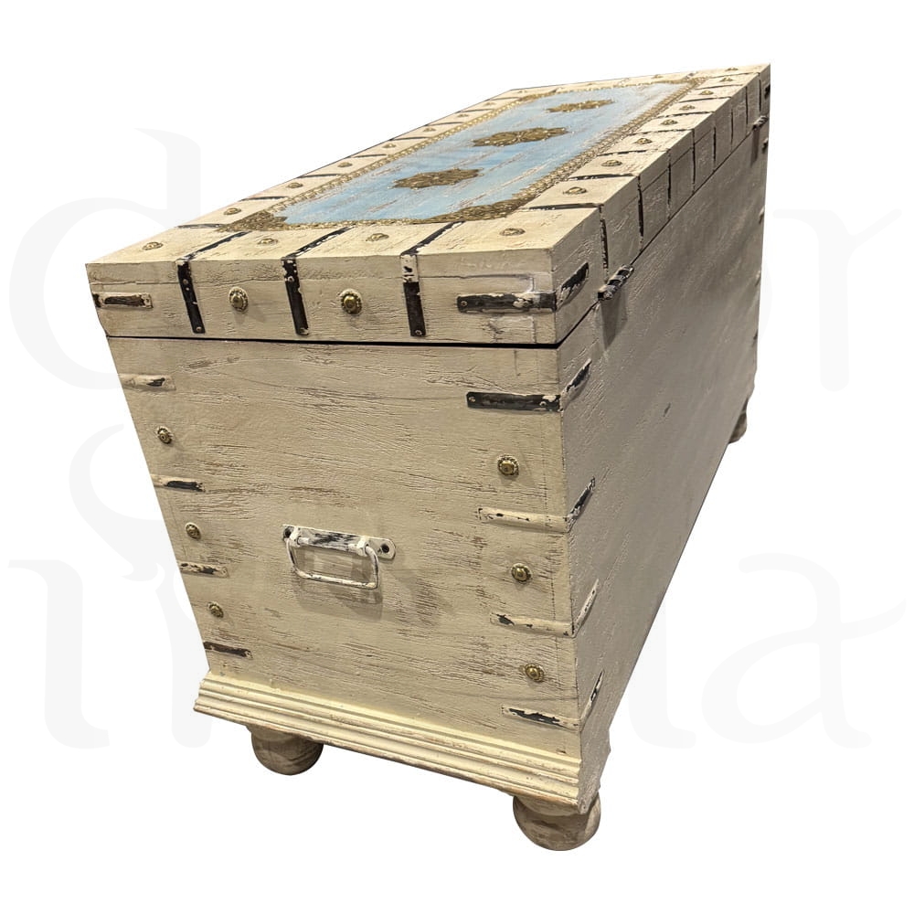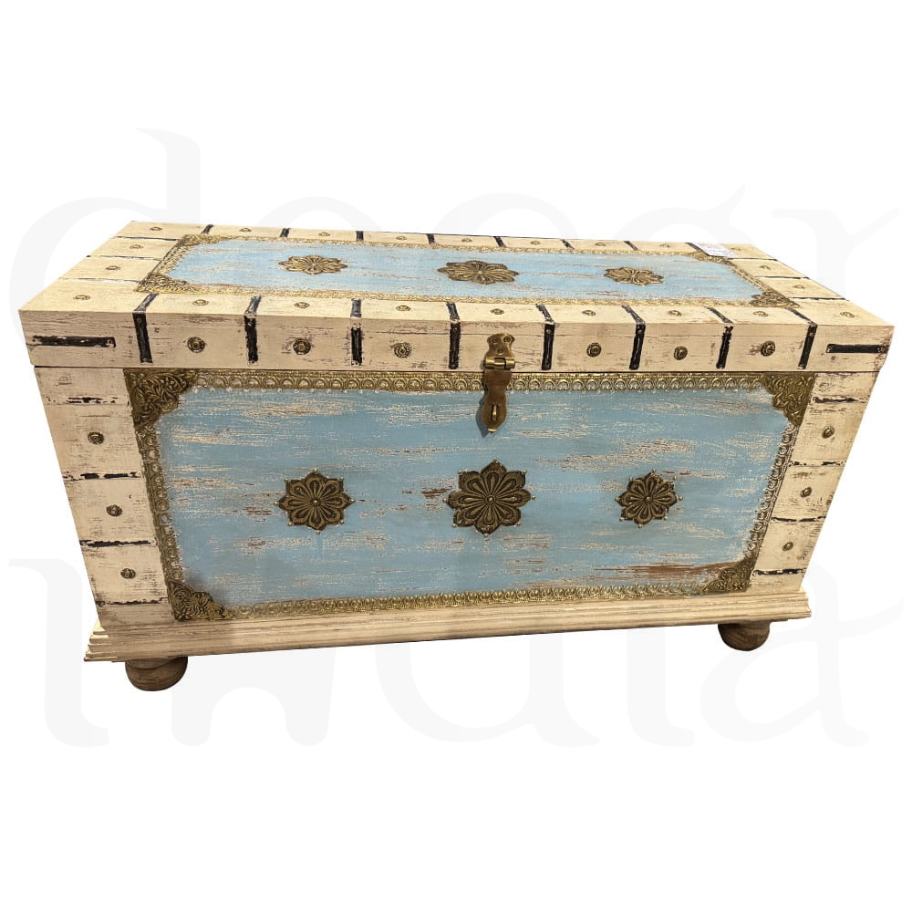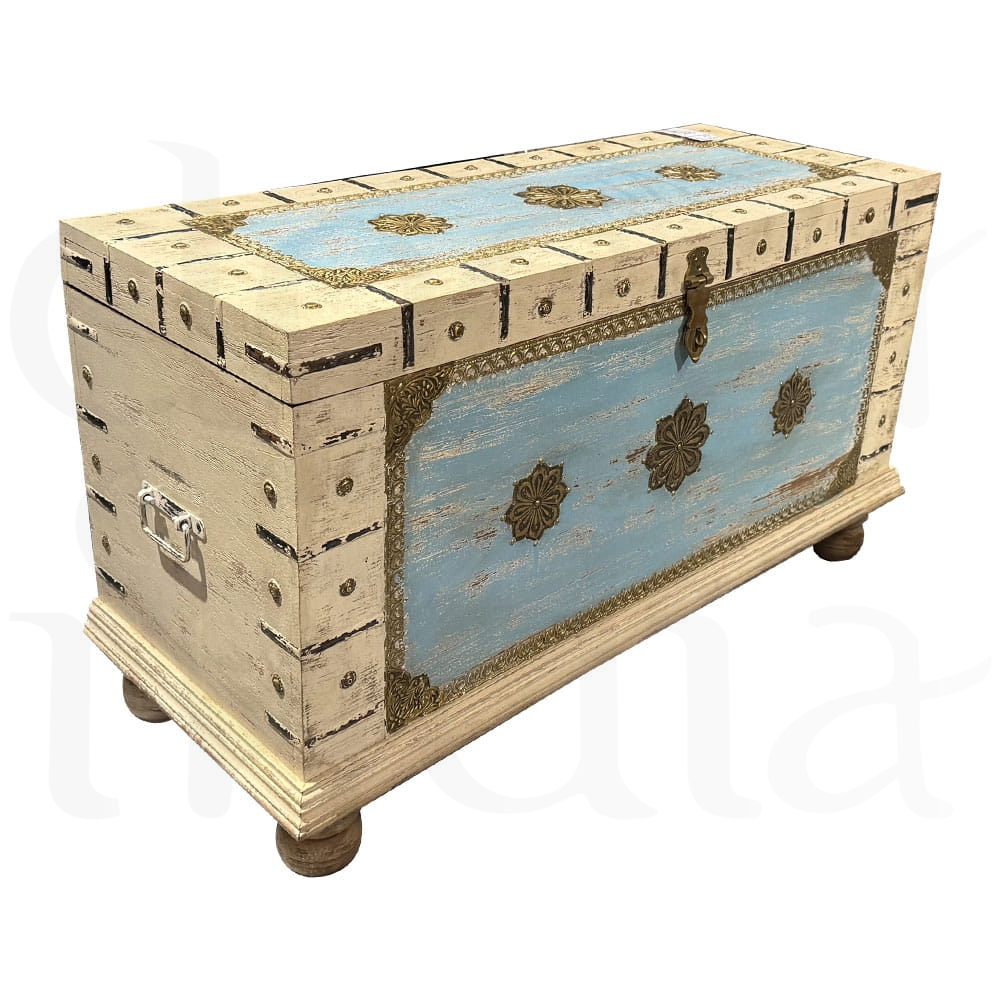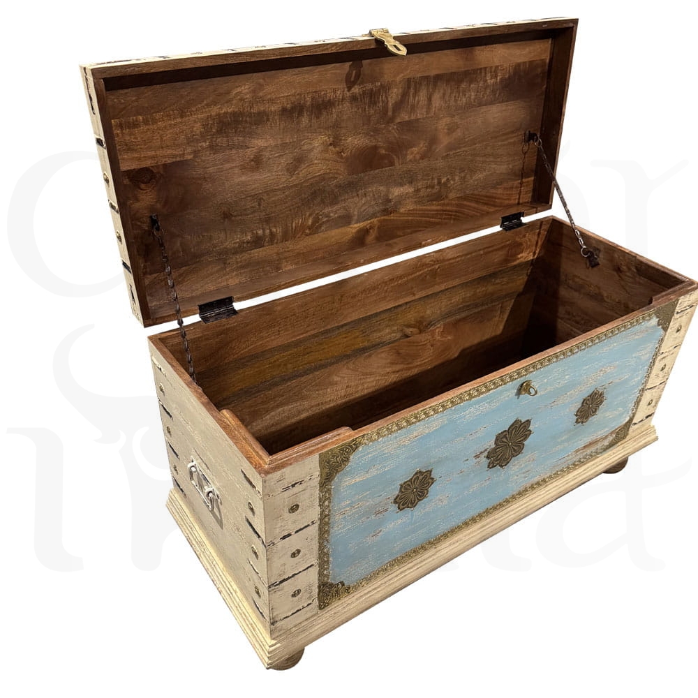 Odkryj urok Orientu w wyjątkowej formie! Nasza indyjska, antyczna skrzynia wykonana jest z solidnego drewna mango i ozdobiona misterną, ręczną metaloplastyką. To niezwykłe połączenie naturalnego ciepła drewna i chłodnego blasku metalu nadaje meblowi unikalny charakter rodem z dawnych pałaców Maharadżów.