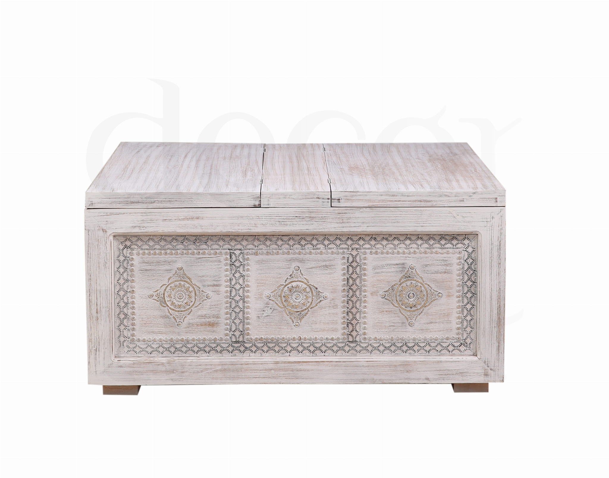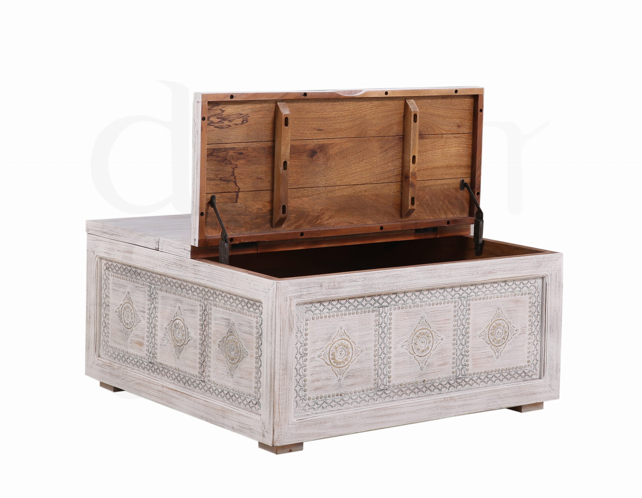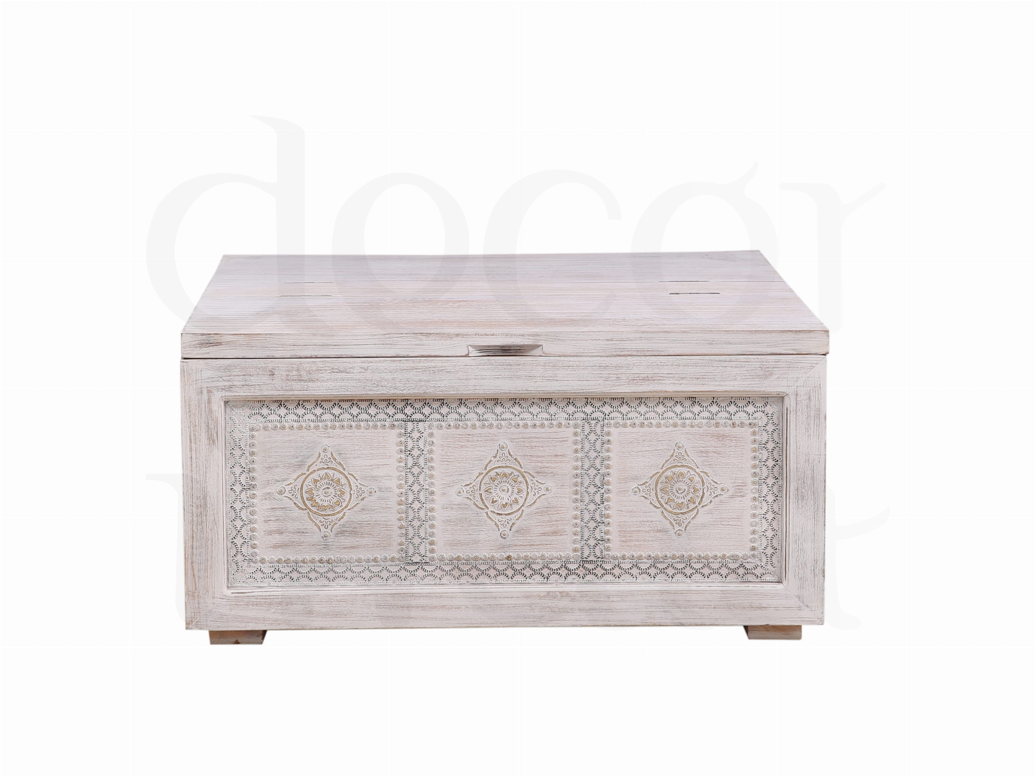 Stylowa, ręcznie wykonana skrzynia z litego drewna mango w antycznym, białym wykończeniu. Ozdobiona eleganckimi metalowymi dekoracjami, które podkreślają jej orientalny charakter.