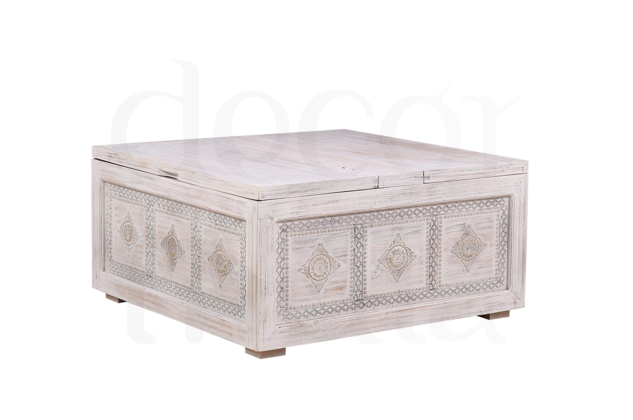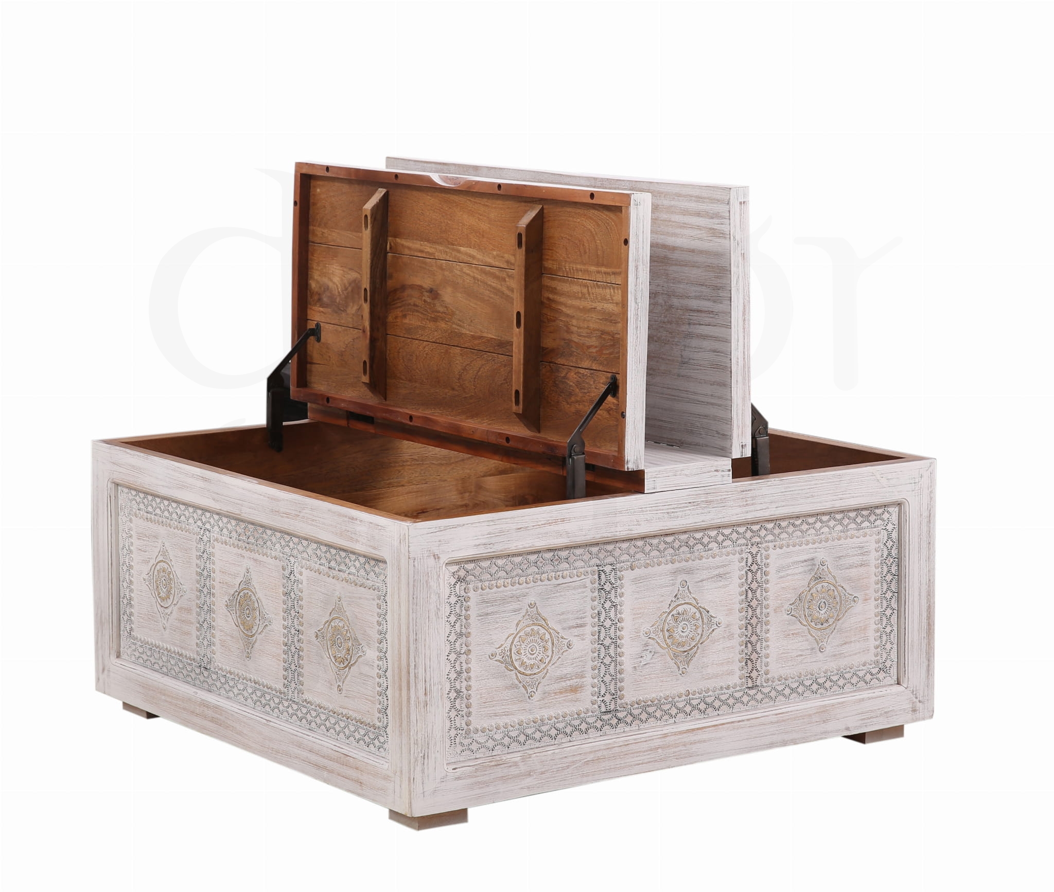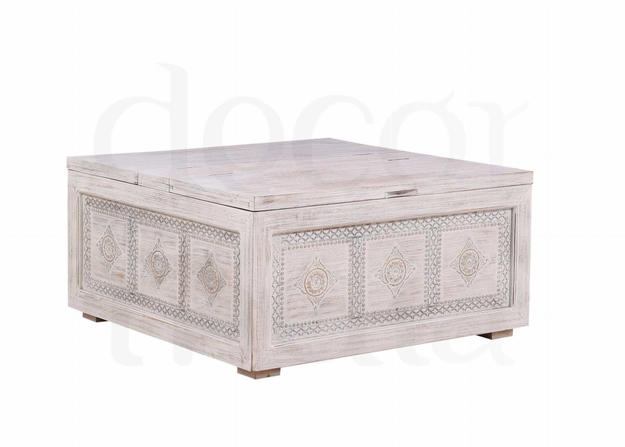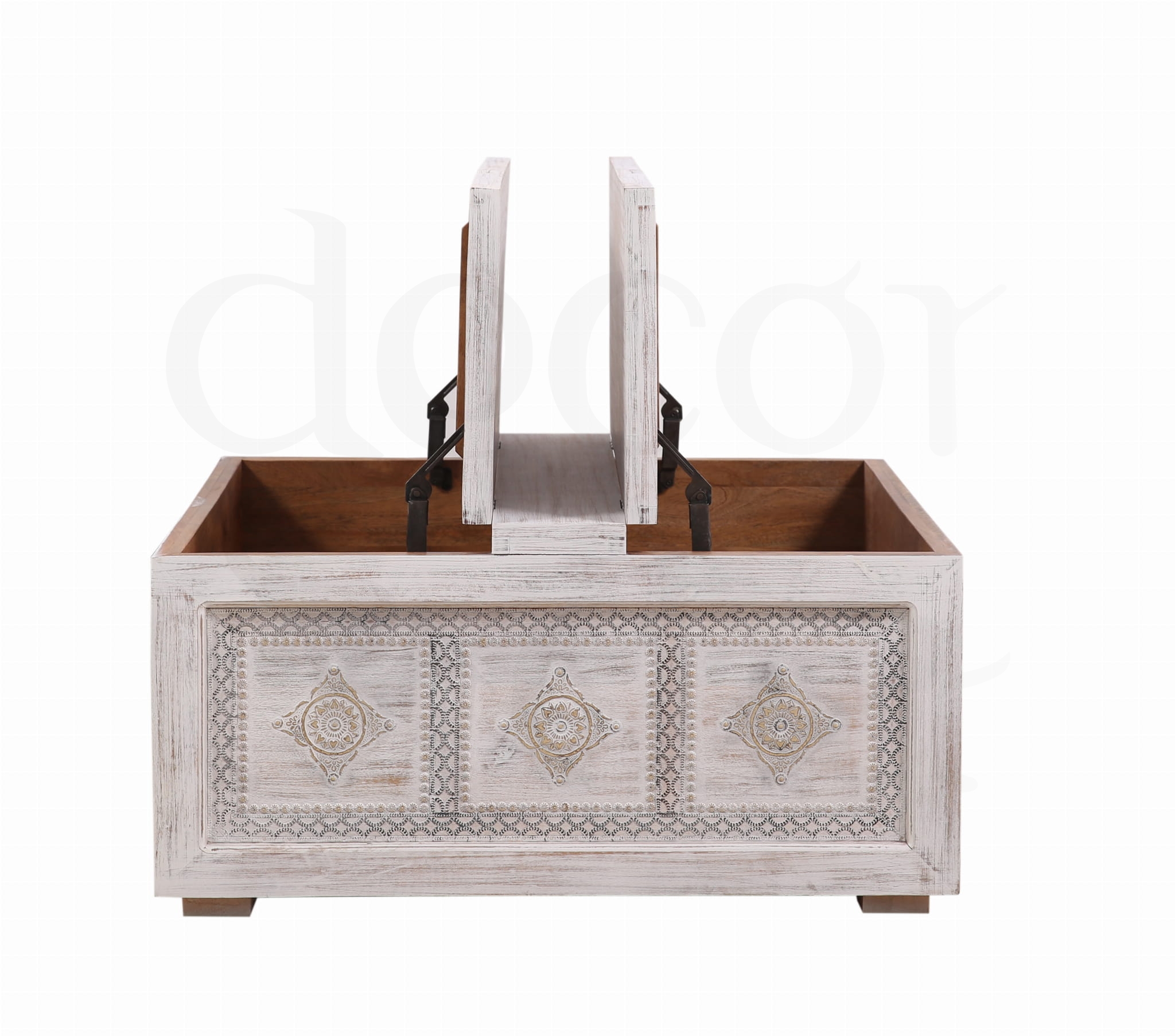 Stylowa, ręcznie wykonana skrzynia z litego drewna mango w antycznym, białym wykończeniu. Ozdobiona eleganckimi metalowymi dekoracjami, które podkreślają jej orientalny charakter.