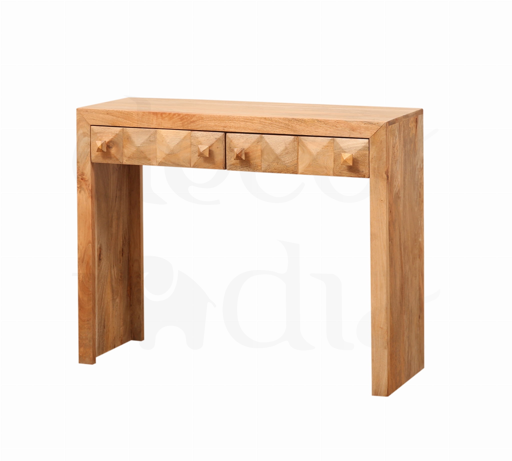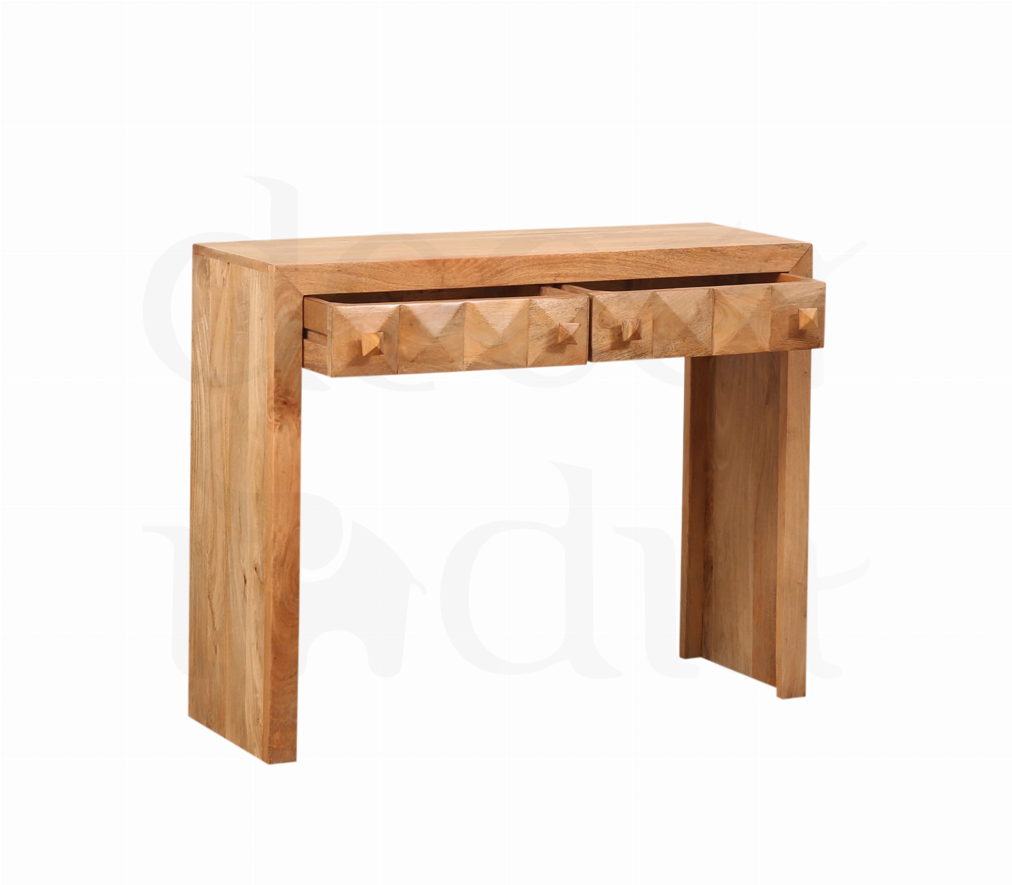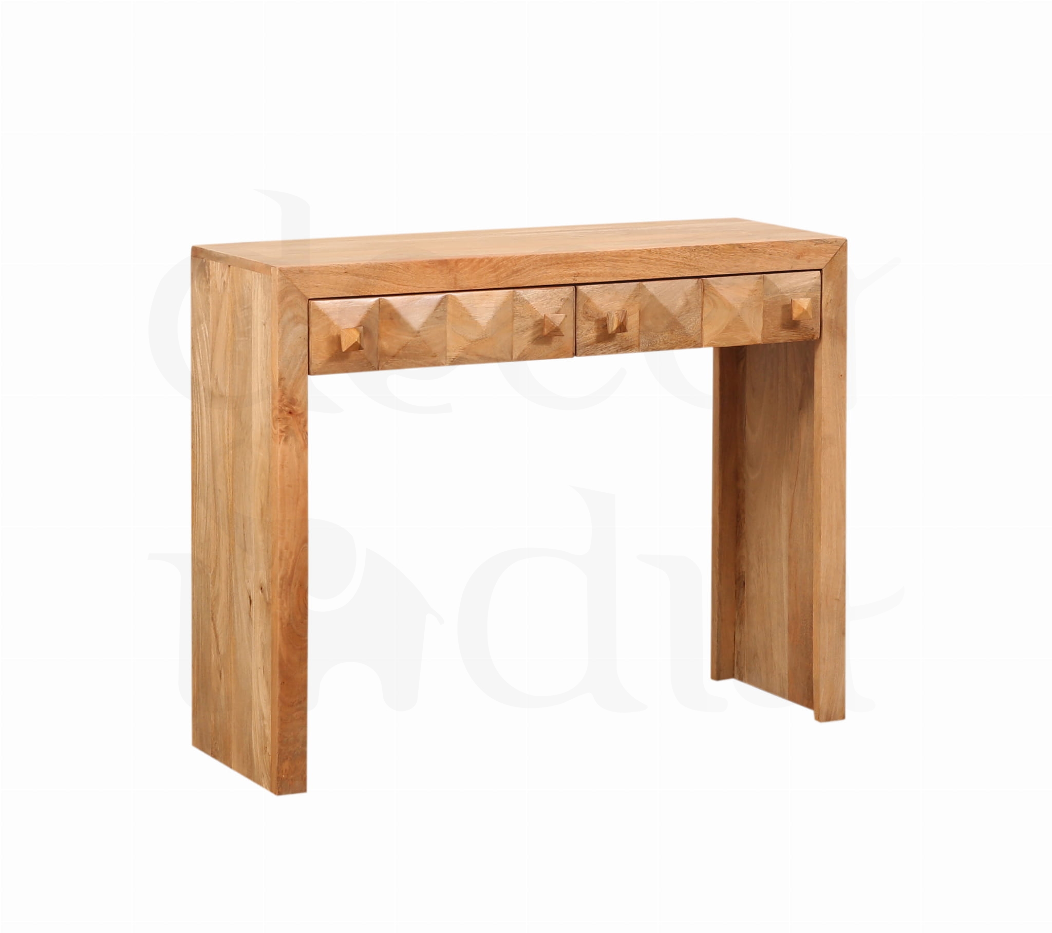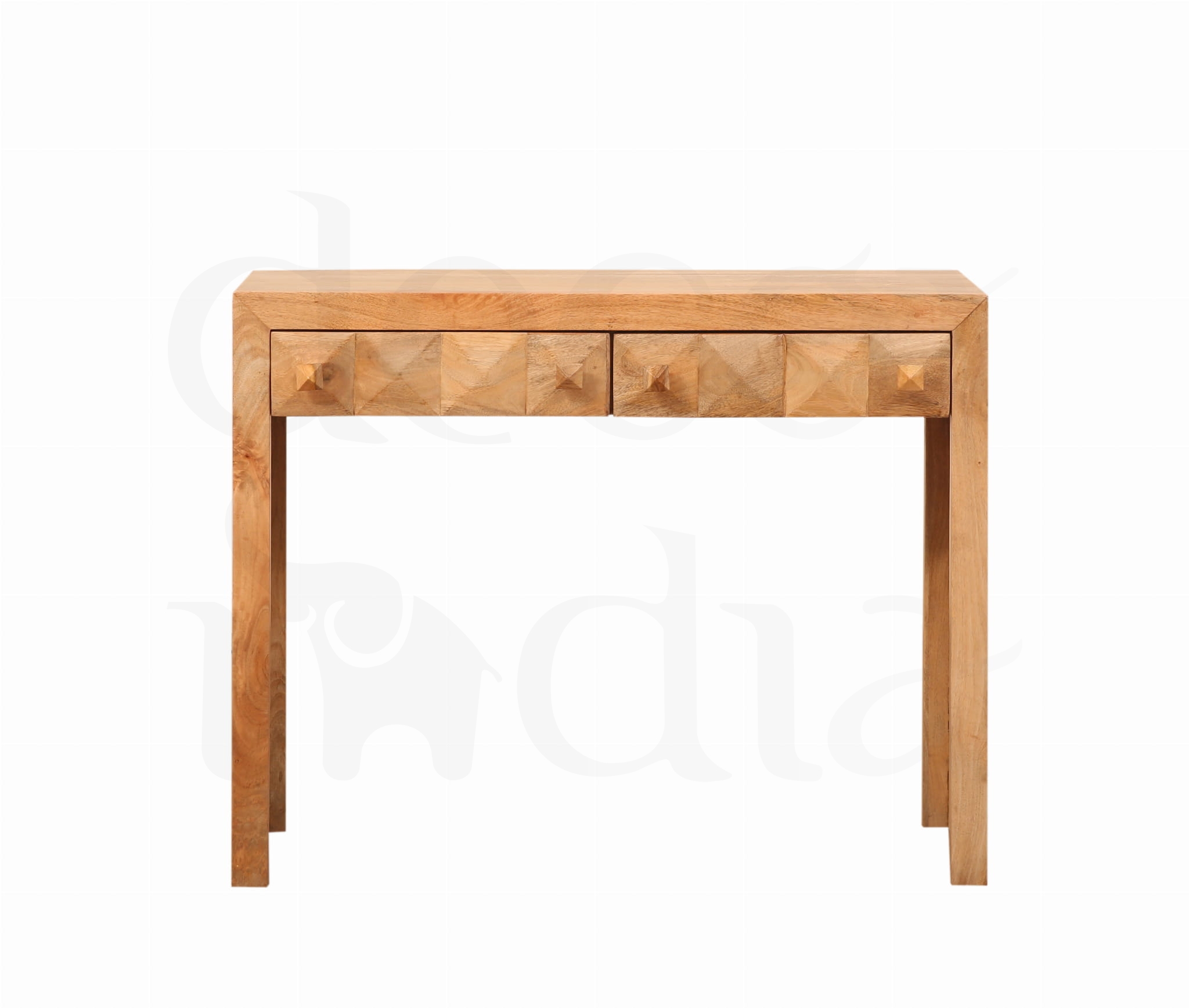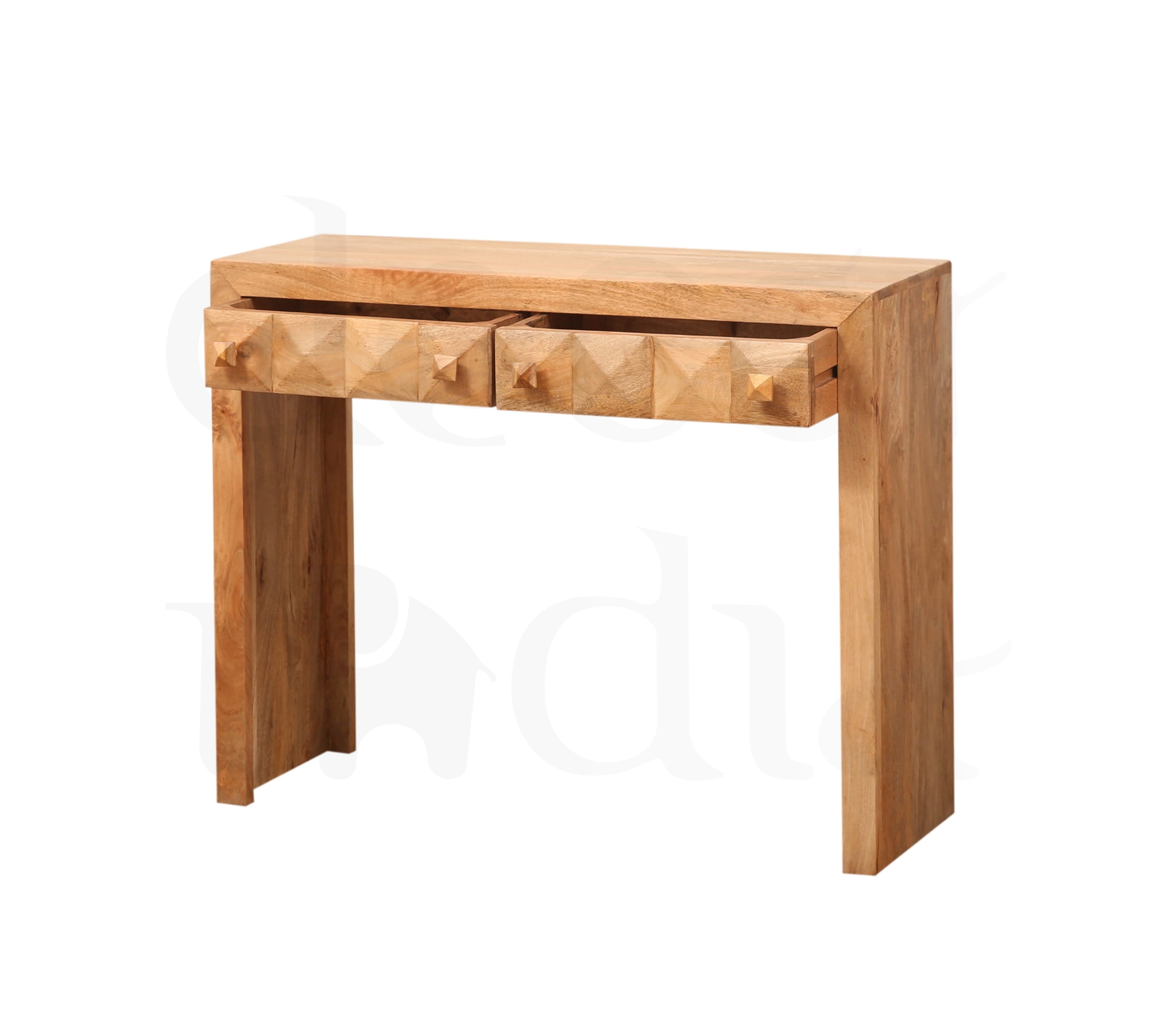 Ta smukła konsola z litego drewna mango zachwyca swoją subtelną formą i wyjątkowym wzornictwem. Front szuflad zdobi elegancki diamentowy motyw, który dodaje meblowi charakteru i nowoczesnego stylu.