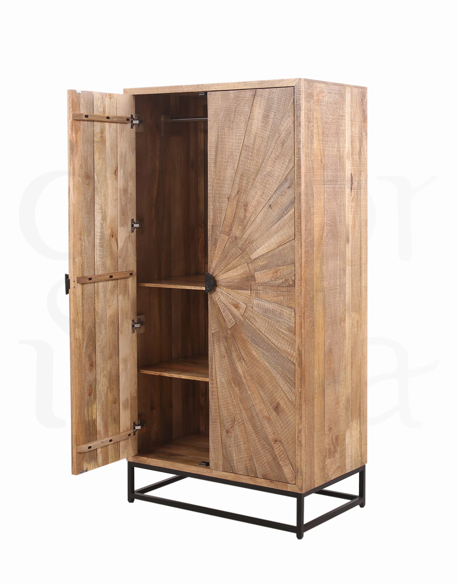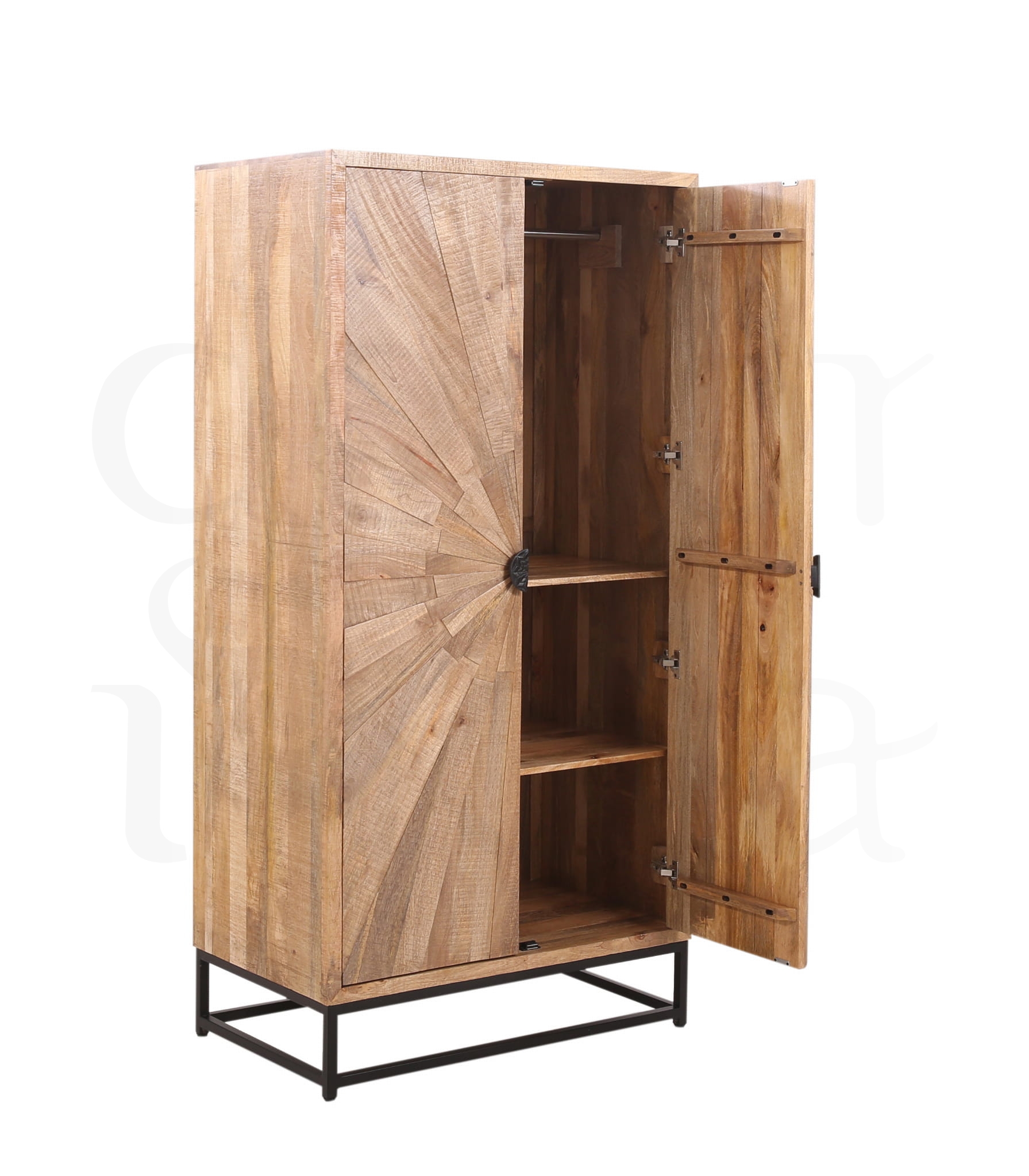 "Szafa Sun Rays z drewna mango w stylu loft to połączenie surowego uroku industrialnego designu z ciepłem naturalnego drewna. Jej ekskluzywne wykończenie i przestronność sprawiają, że idealnie wpasuje się w nowoczesne wnętrza, dodając im wyjątkowego charakteru. Funkcjonalność spotyka się tutaj z elegancją, tworząc mebel, który nie tylko przechowa Twoje rzeczy, ale także stanie się ozdobą każdej przestrzeni."