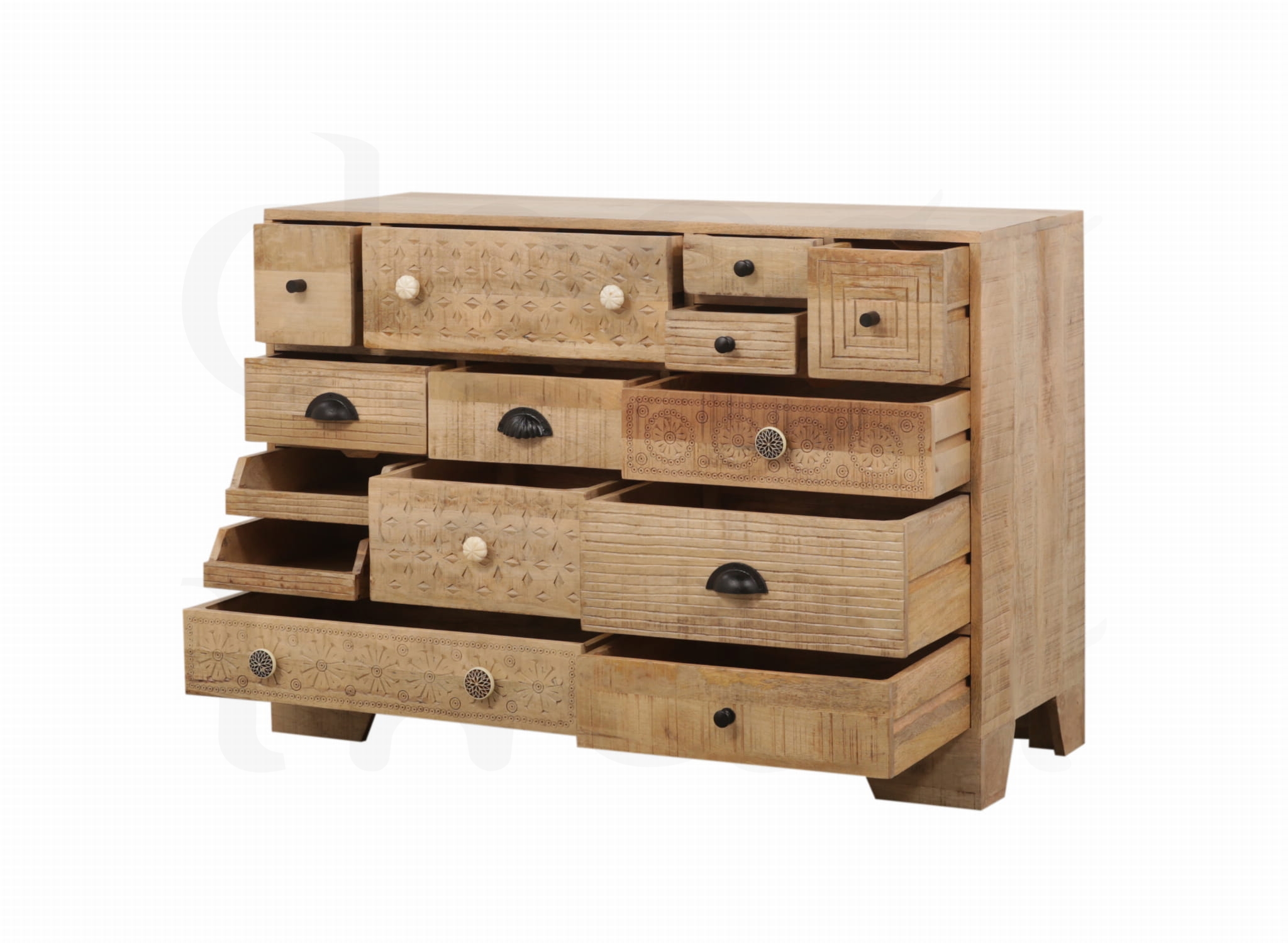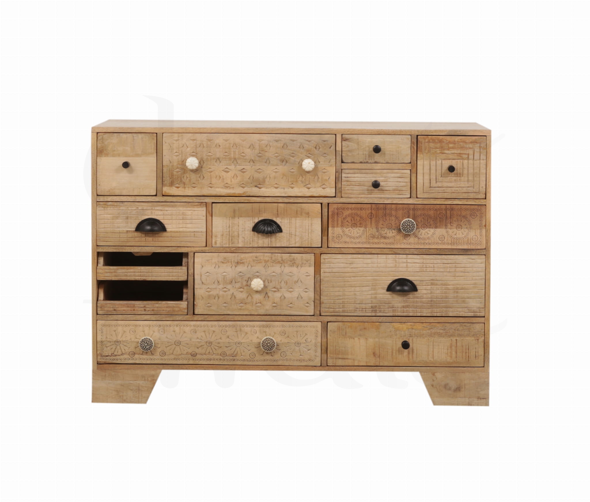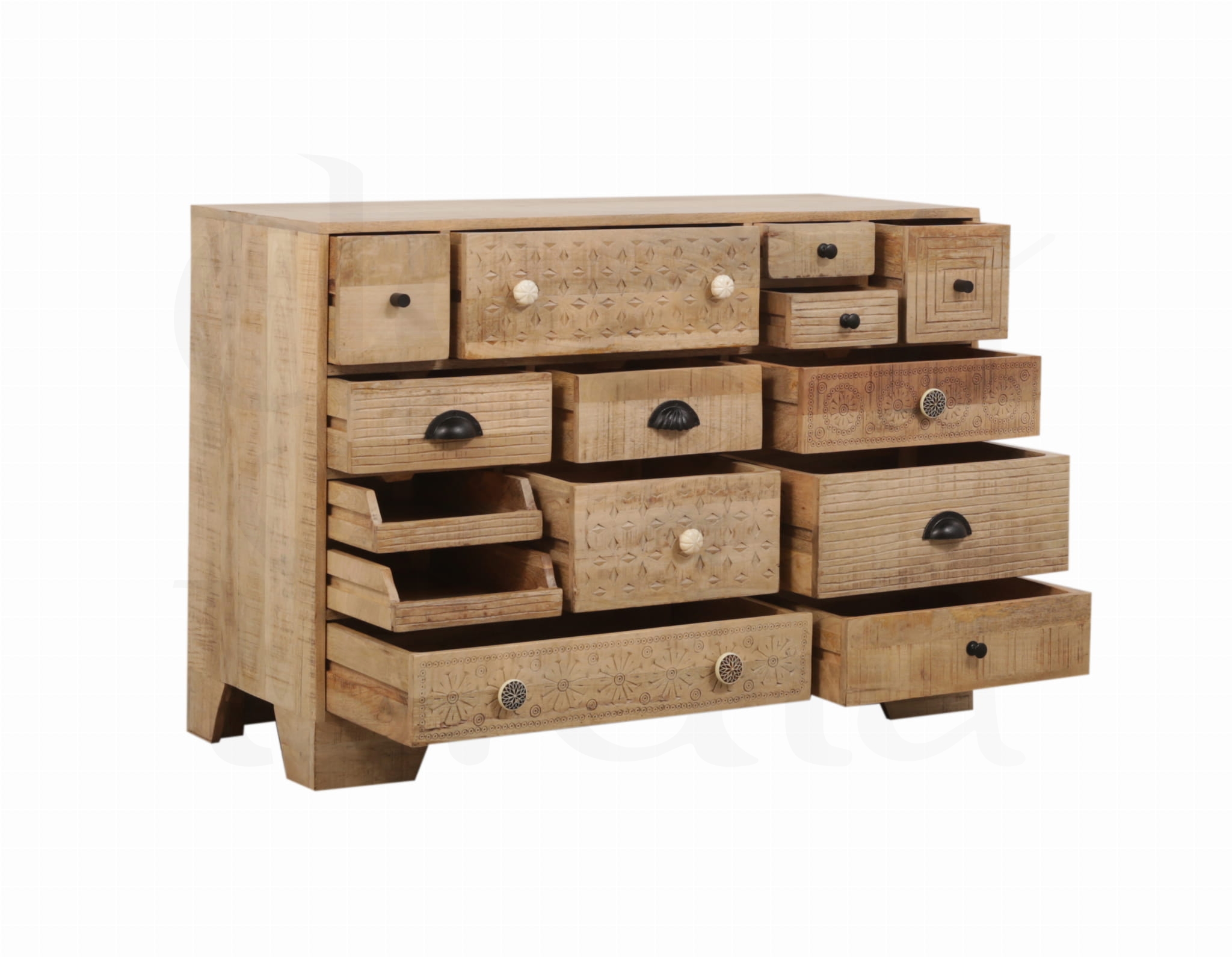 Elegancka, kompaktowa komoda mistrzowsko wykonana z litego drewna mango w loftowym stylu. Zachwyca precyzją rzemieślniczego wykończenia oraz naturalnym usłojeniem drewna, które nadaje każdemu egzemplarzowi unikalny charakter. Przemyślana forma łączy nowoczesny design z praktycznością, oferując wygodną przestrzeń do przechowywania bez zajmowania dużo miejsca. To stylowy akcent, który doskonale dopełni każde wnętrze.