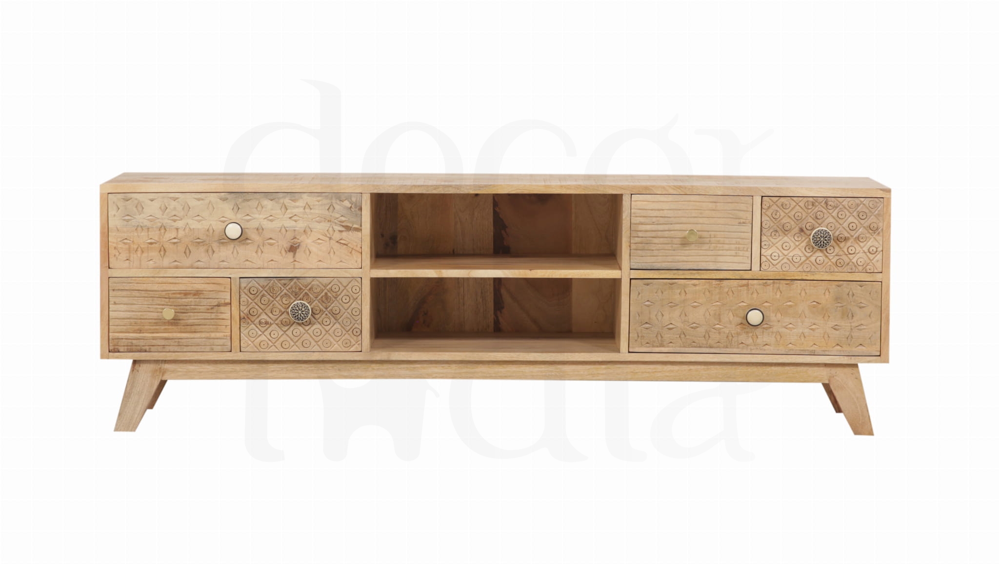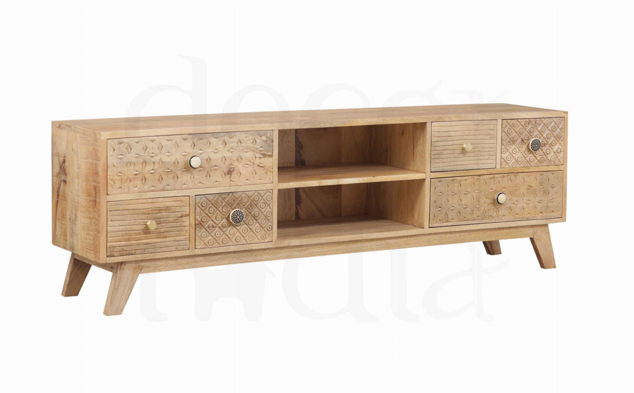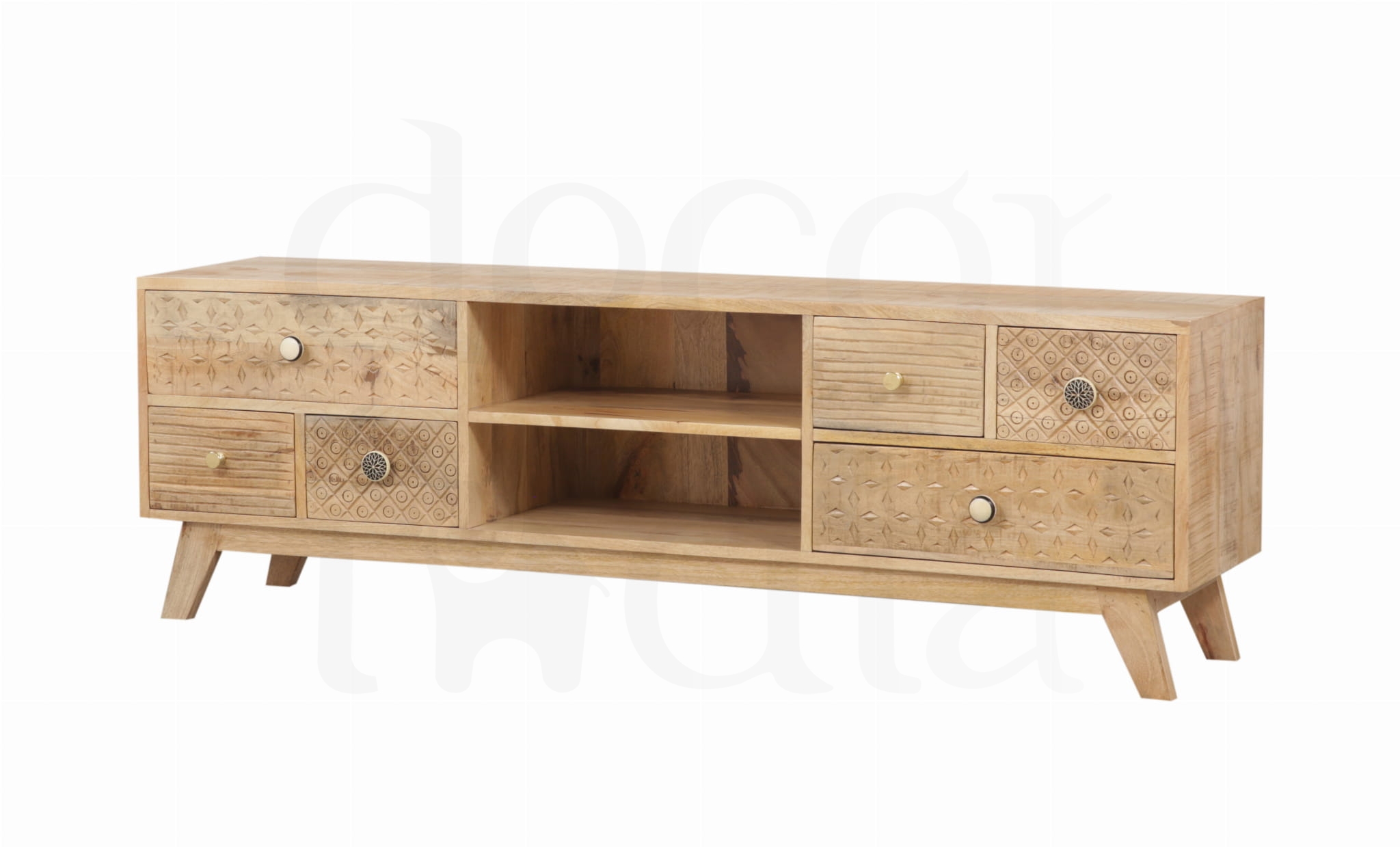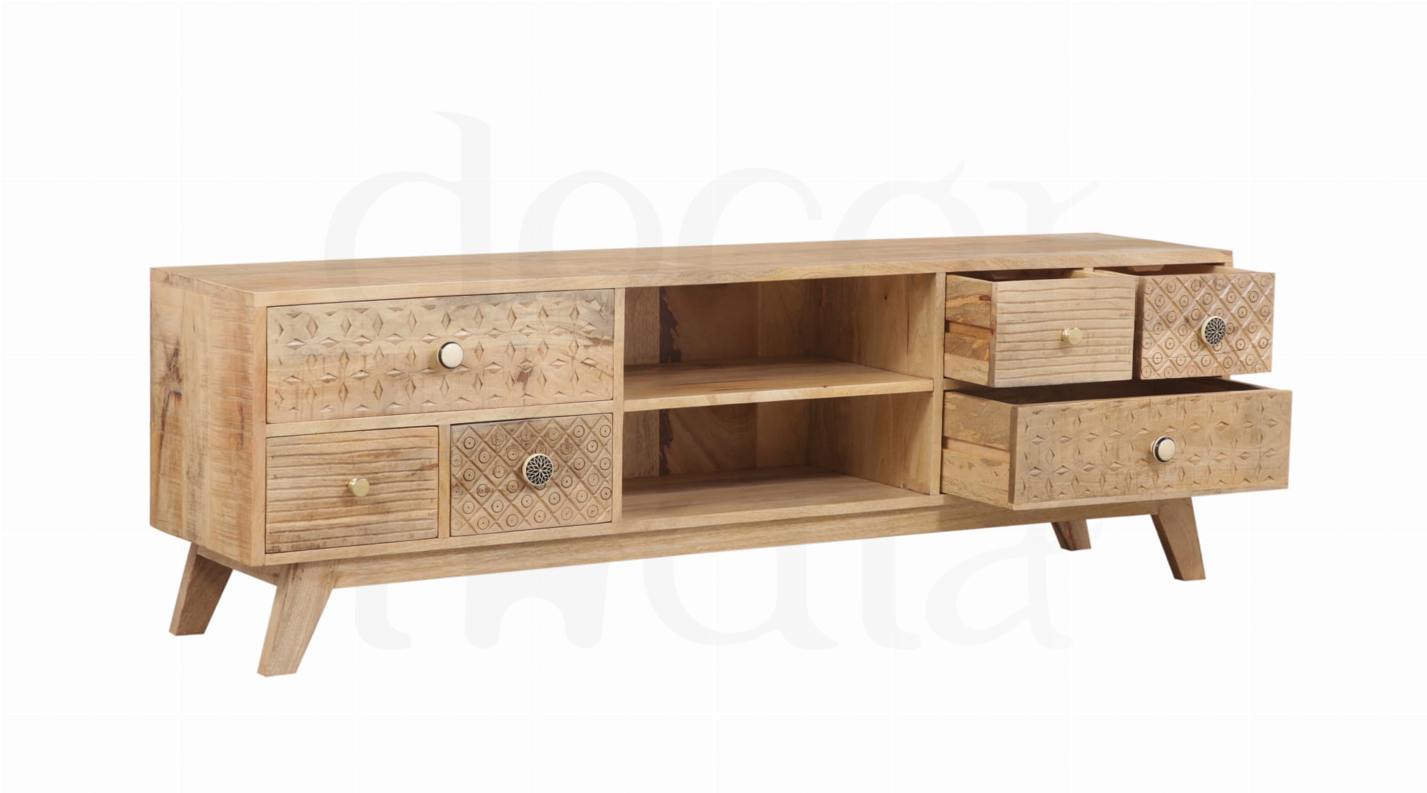 Elegancka szafka RTV wykonana ręcznie z litego drewna mango w loftowym stylu. Każdy detal został starannie dopracowany, co podkreśla rzemieślniczy charakter mebla i jego unikalny wygląd. Naturalne usłojenie drewna nadaje całości ciepła i autentyczności, a solidna konstrukcja zapewnia trwałość na lata. To stylowe połączenie funkcjonalności i designu, które doskonale uzupełni nowoczesne oraz industrialne wnętrza