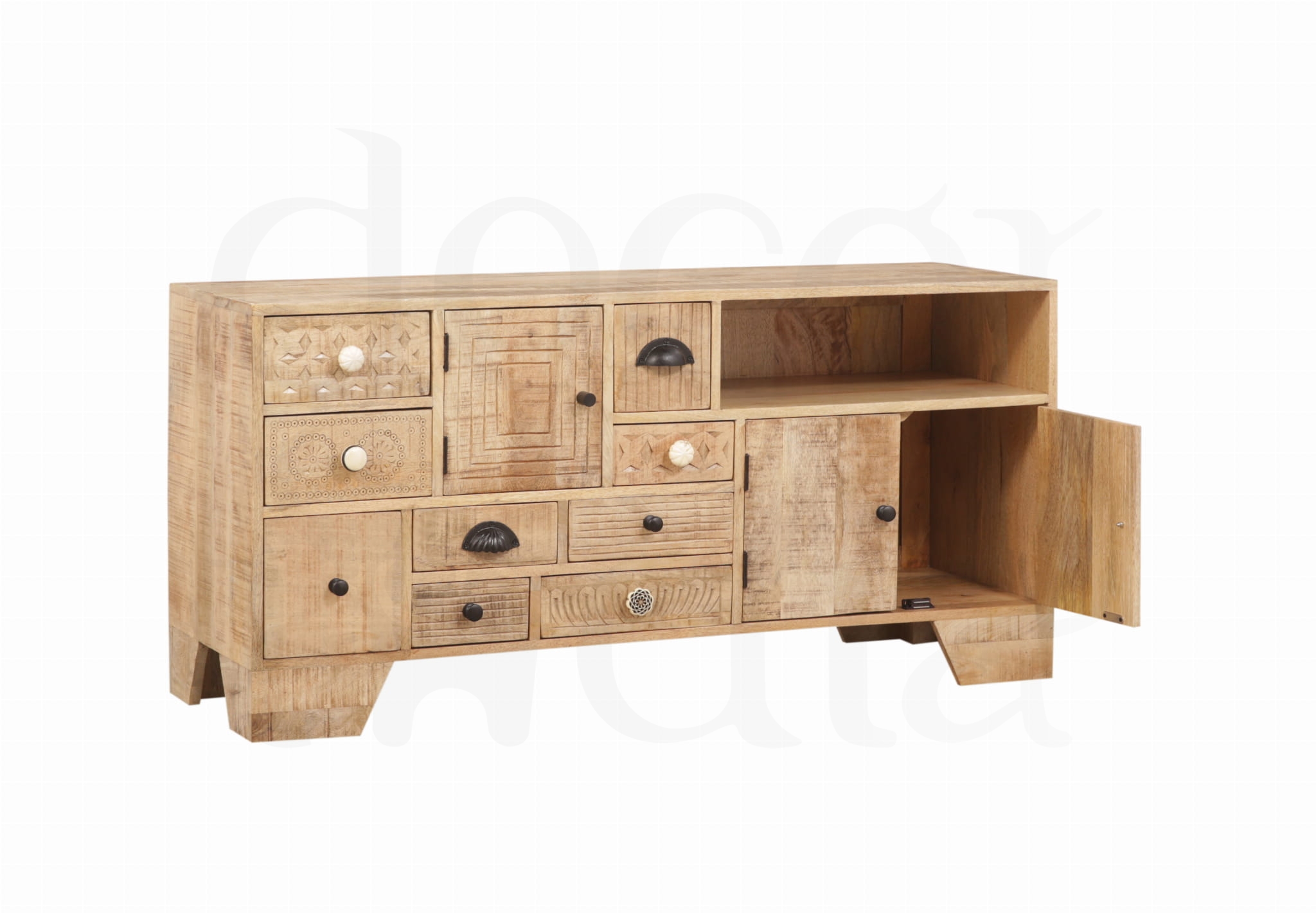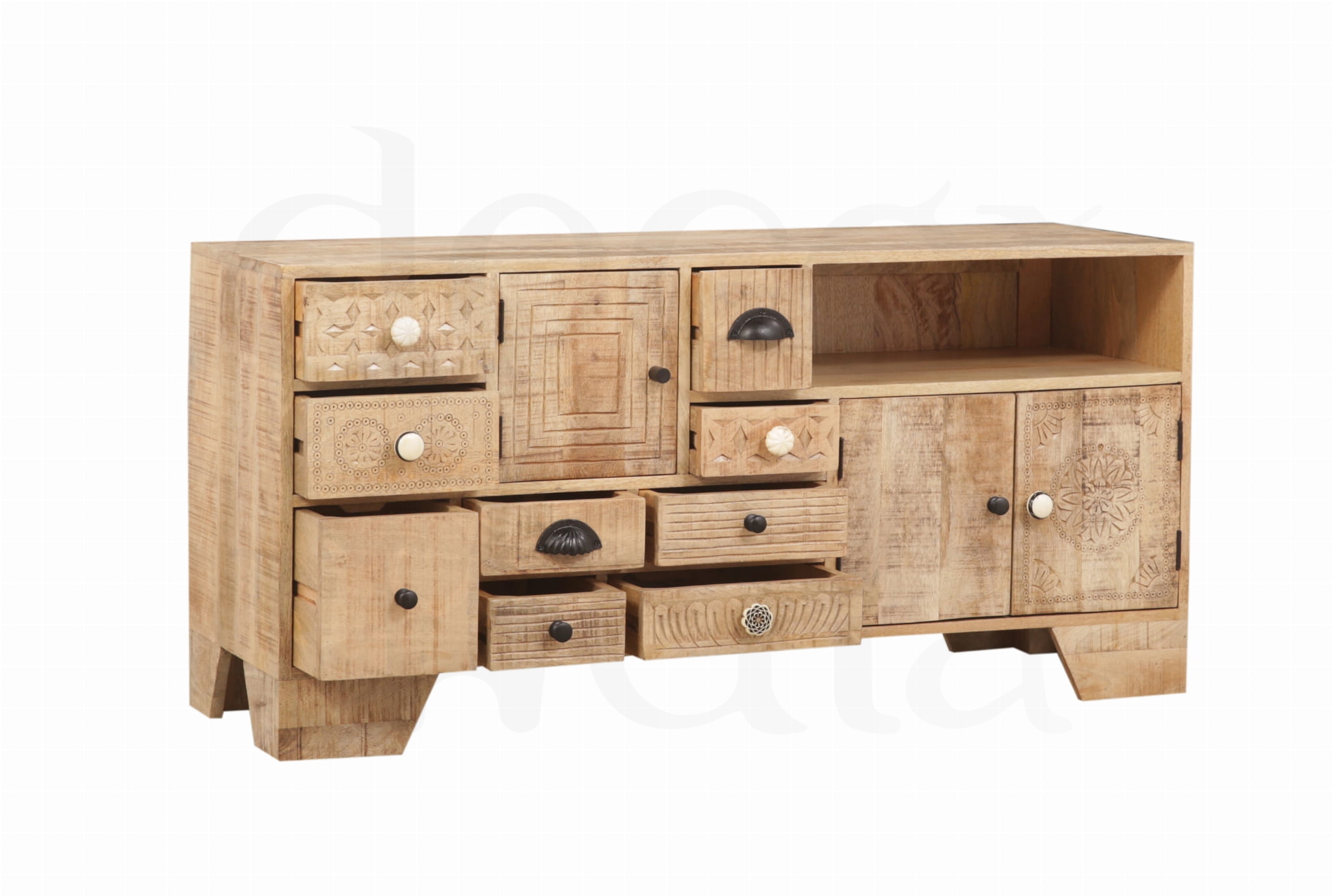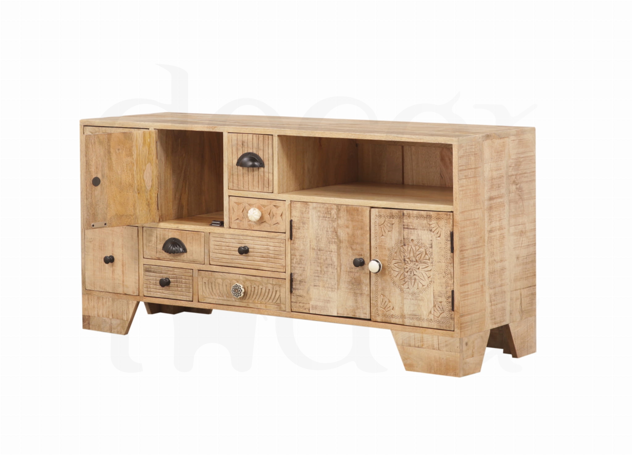 Elegancka szafka RTV wykonana z litego drewna mango w stylu loftowym. Zachwyca nowoczesnym, a jednocześnie ciepłym designem, który doskonale podkreśla charakter wnętrza. Starannie zaprojektowana forma łączy estetykę z funkcjonalnością – liczne, pojemne szuflady zapewniają wygodne miejsce do przechowywania i pomagają utrzymać porządek. To wyjątkowy mebel, który przyciąga wzrok i nadaje przestrzeni stylowy, wyrafinowany wygląd.
