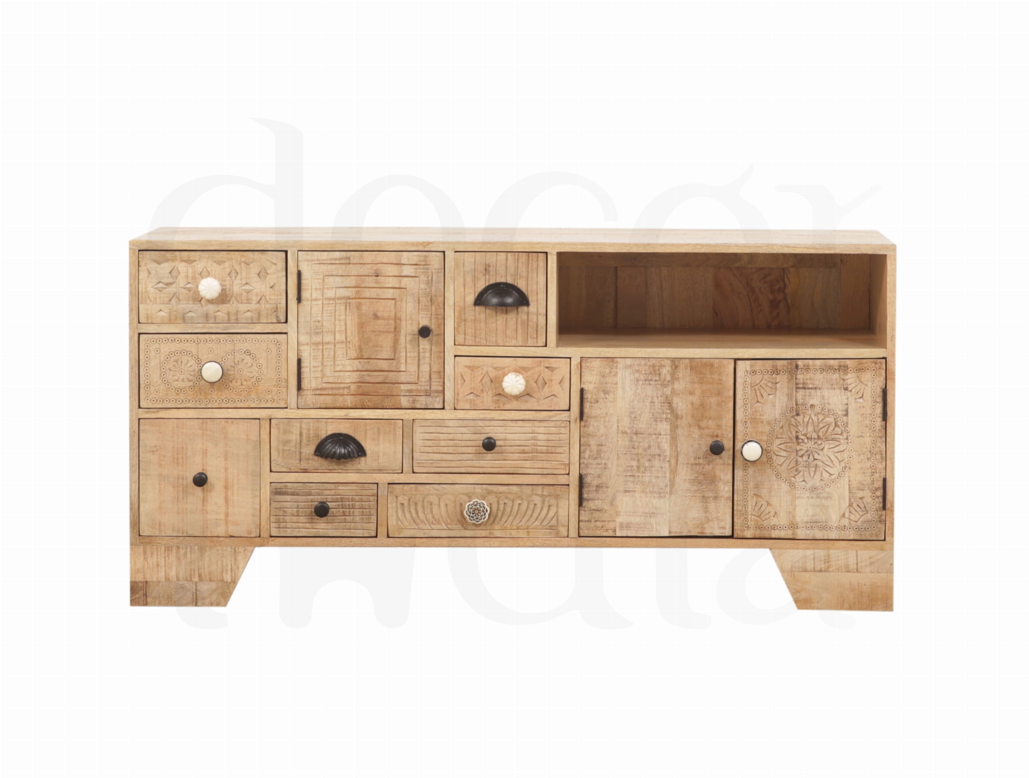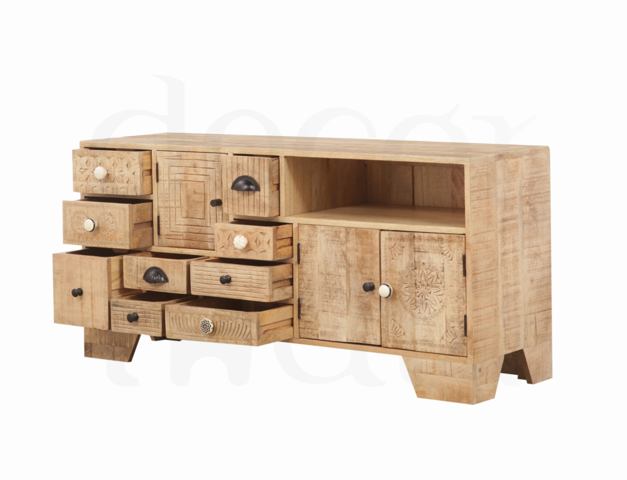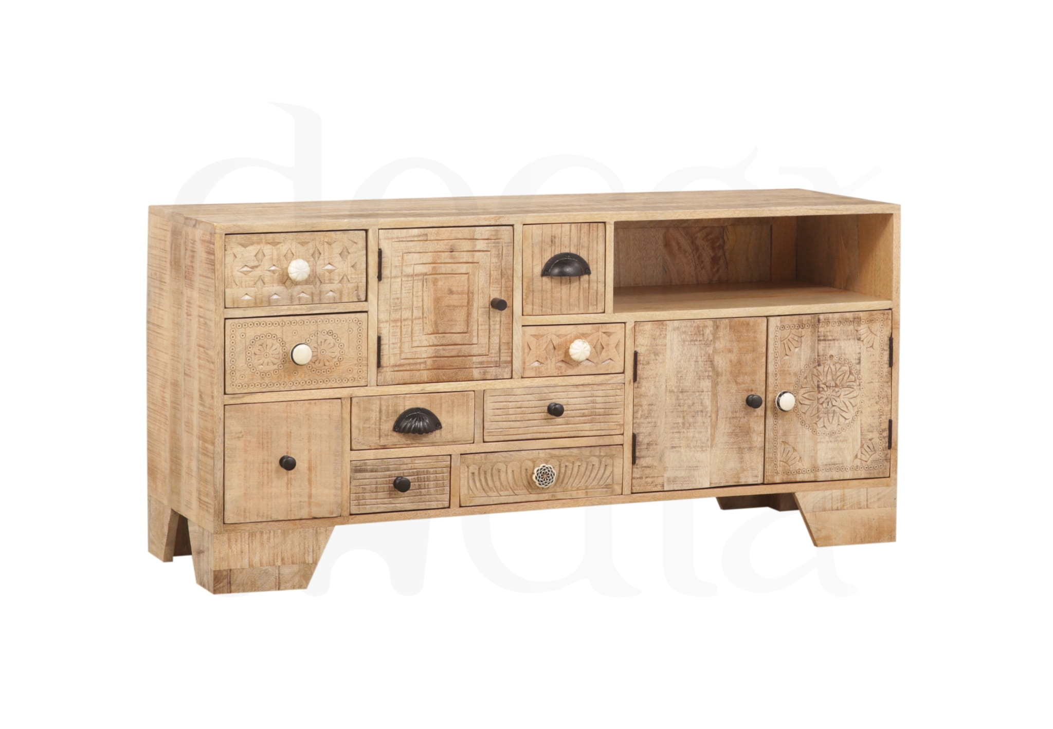 Elegancka szafka RTV wykonana z litego drewna mango w stylu loftowym. Zachwyca nowoczesnym, a jednocześnie ciepłym designem, który doskonale podkreśla charakter wnętrza. Starannie zaprojektowana forma łączy estetykę z funkcjonalnością – liczne, pojemne szuflady zapewniają wygodne miejsce do przechowywania i pomagają utrzymać porządek. To wyjątkowy mebel, który przyciąga wzrok i nadaje przestrzeni stylowy, wyrafinowany wygląd.