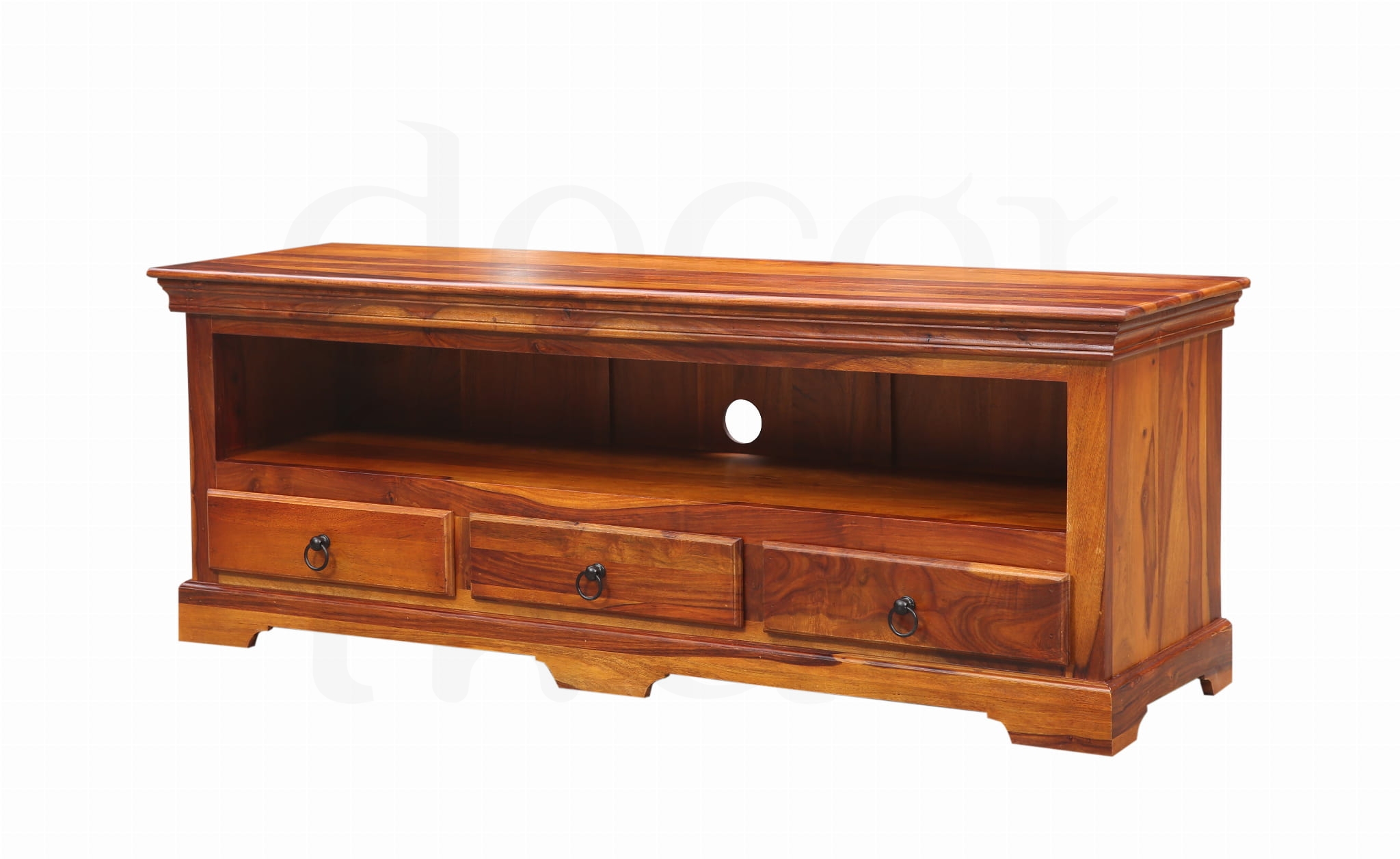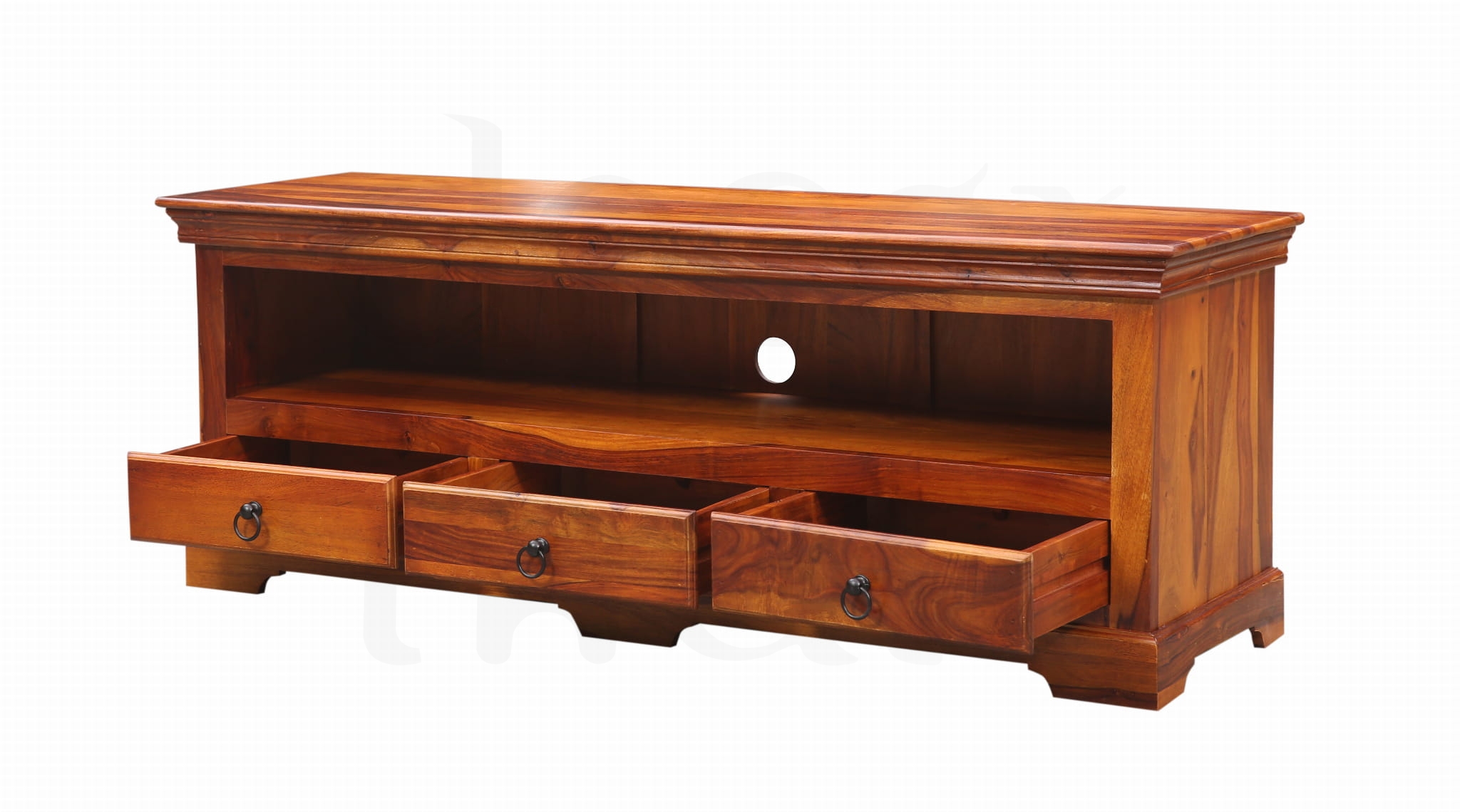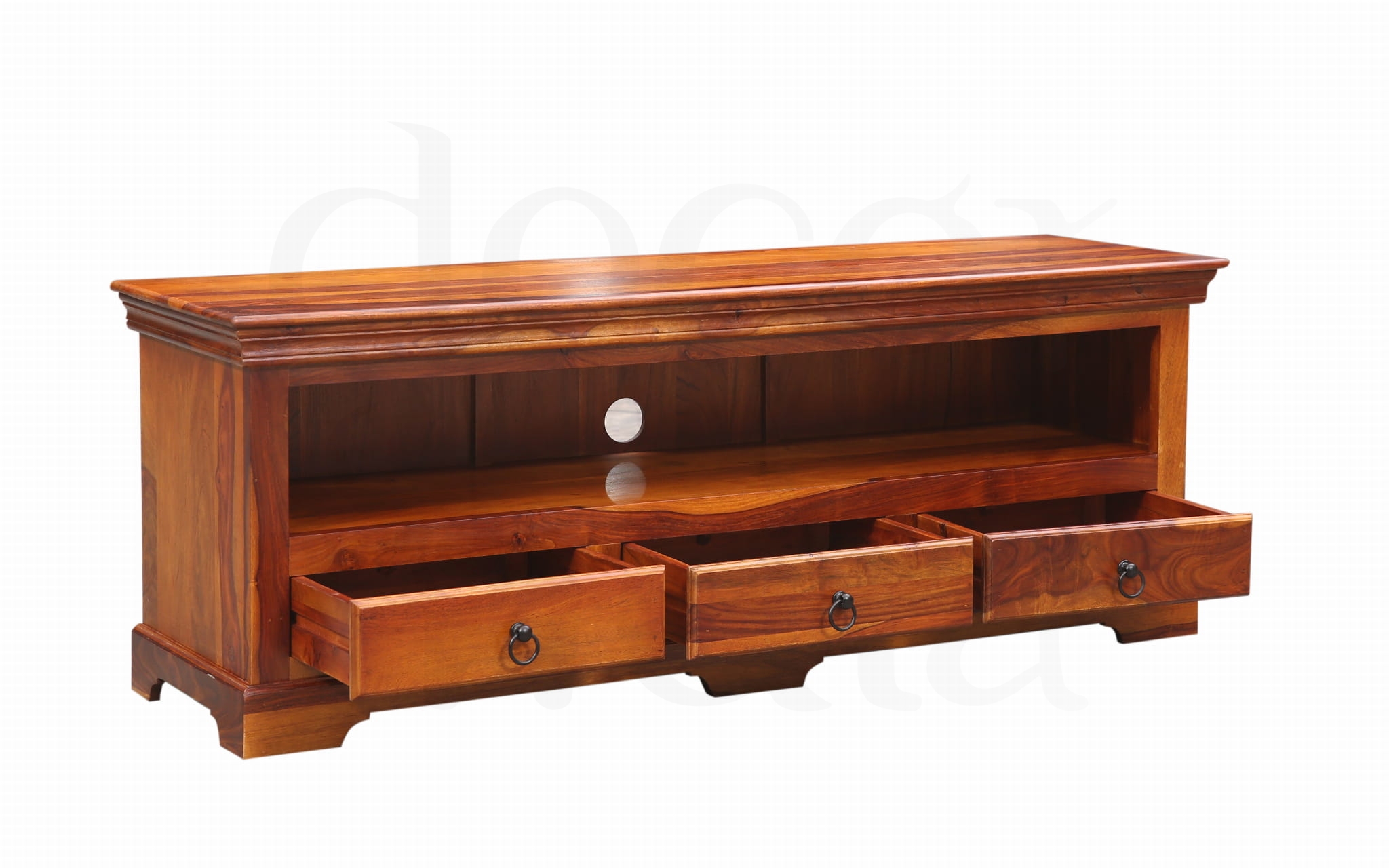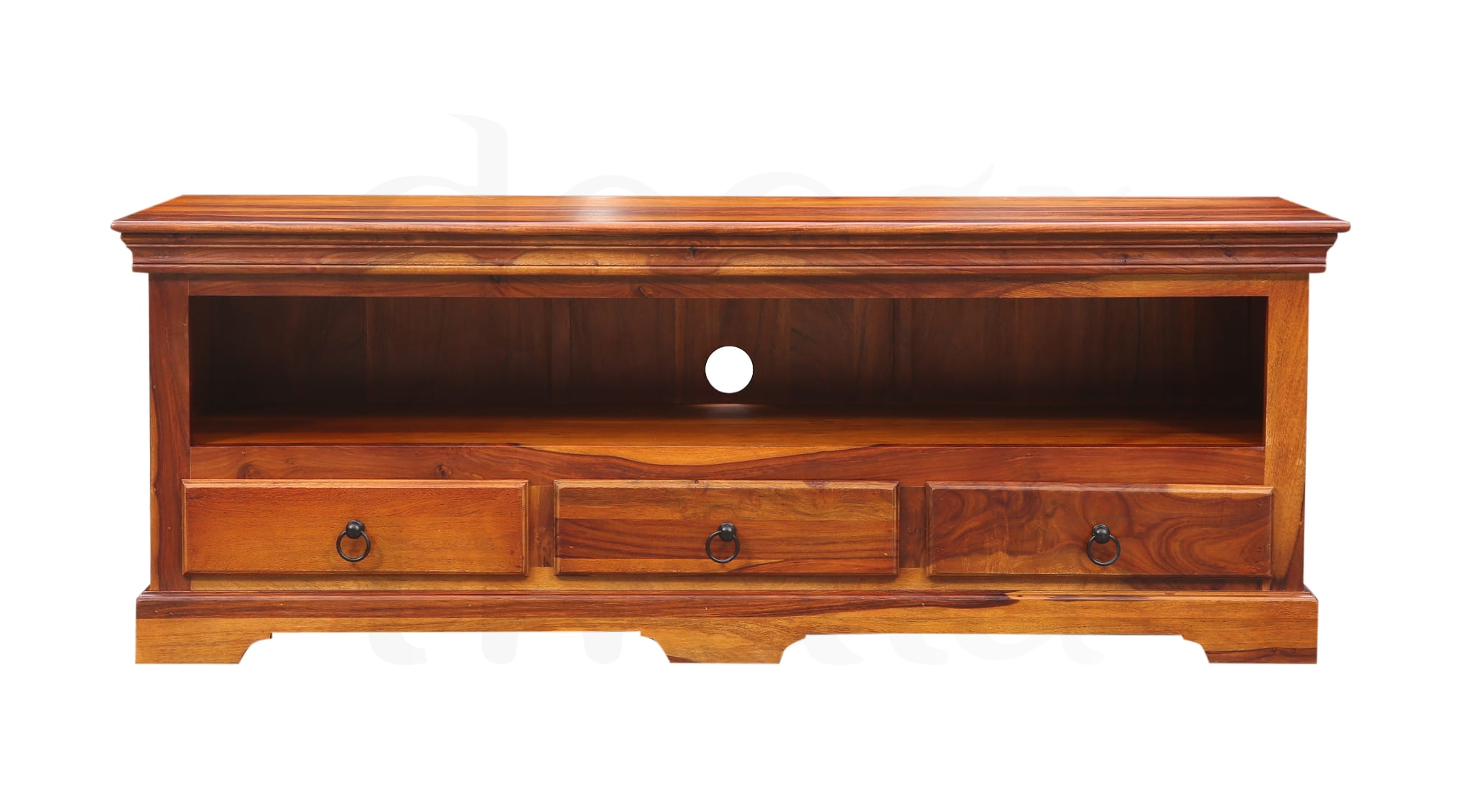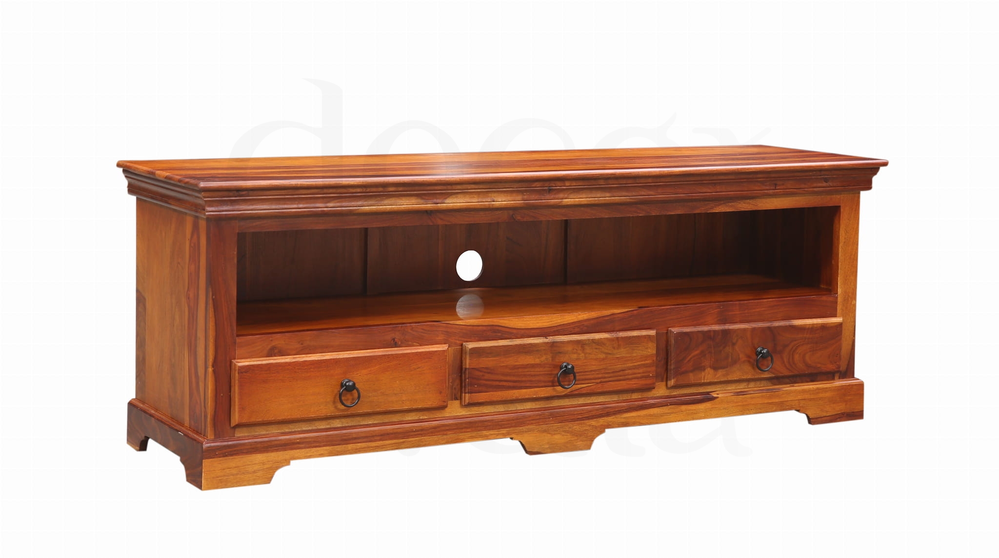 Dodaj swojemu wnętrzu klasy dzięki eleganckiej szafce RTV wykonanej z palisandru indyjskiego – drewna o głębokim kolorze, pięknym usłojeniu i wyjątkowej trwałości.