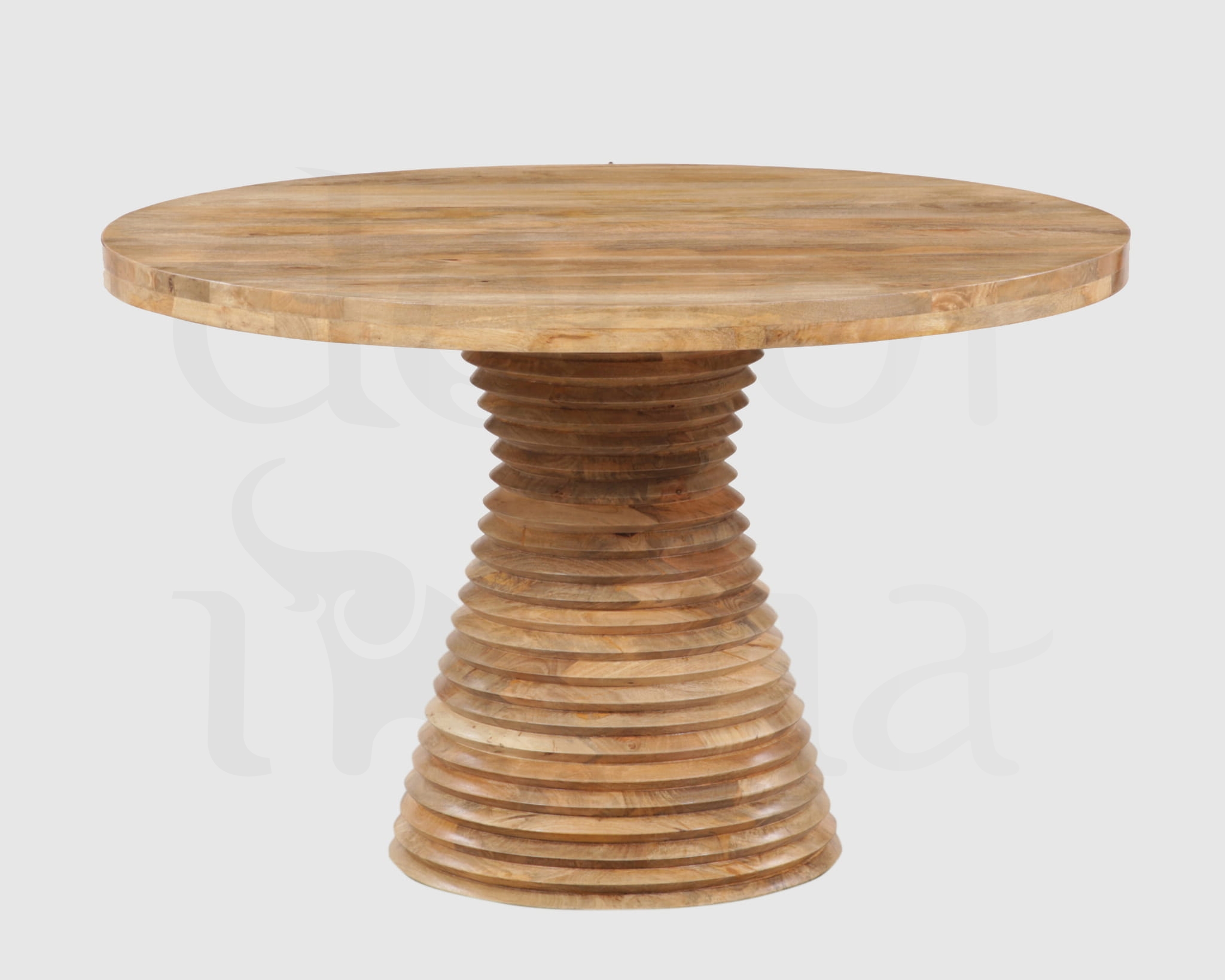 Elegancki okrągły stół jadalniany wykonany z litego drewna mango, wyróżniający się wyjątkowym designem nóg w formie stylowych pierścieni. Naturalna struktura drewna oraz staranne rzemiosło nadają meblowi szlachetny i ponadczasowy charakter. Okrągła forma sprzyja wspólnym spotkaniom przy stole, a solidna konstrukcja łączy funkcjonalność z wyrafinowaną estetyką, wprowadzając do jadalni ciepło, harmonię i elegancję.