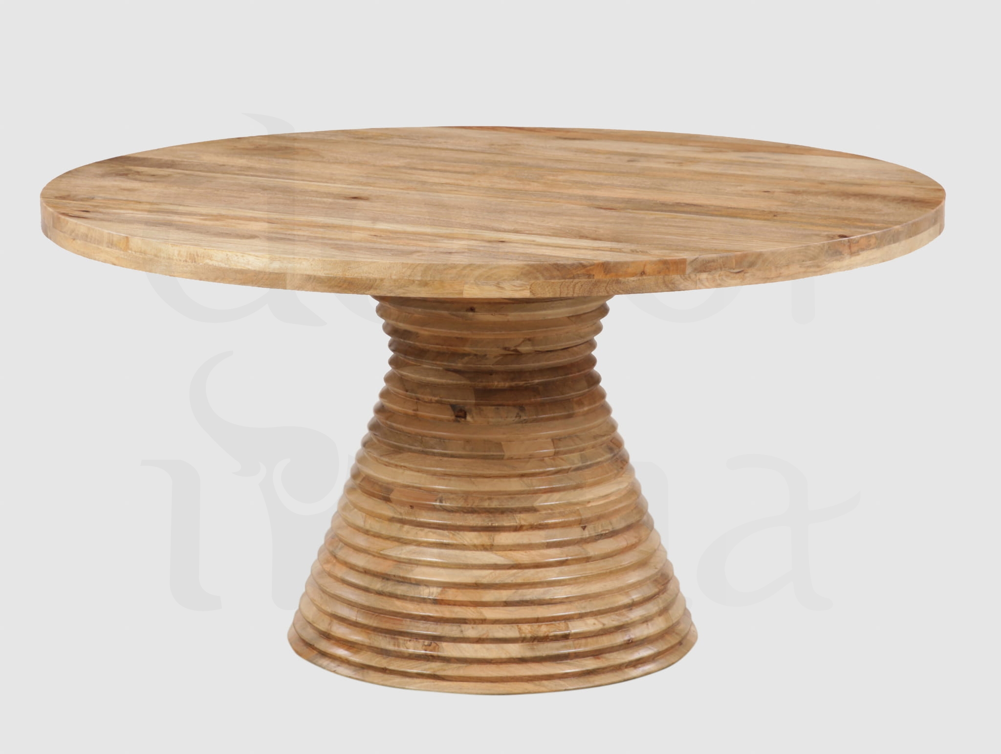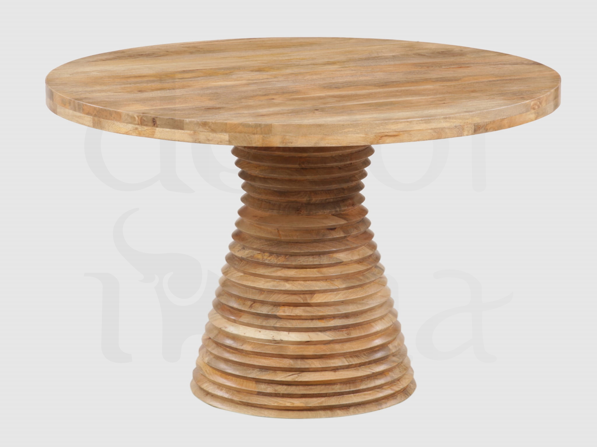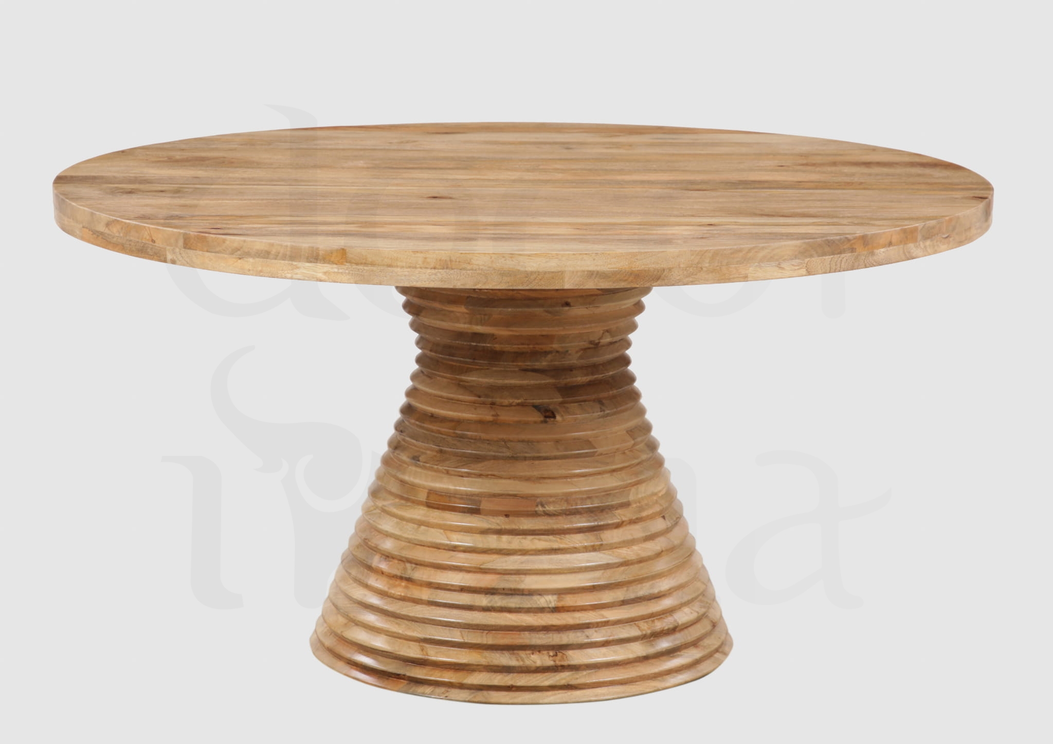 Elegancki okrągły stół jadalniany wykonany z litego drewna mango, wyróżniający się wyjątkowym designem nóg w formie stylowych pierścieni. Naturalna struktura drewna oraz staranne rzemiosło nadają meblowi szlachetny i ponadczasowy charakter. Okrągła forma sprzyja wspólnym spotkaniom przy stole, a solidna konstrukcja łączy funkcjonalność z wyrafinowaną estetyką, wprowadzając do jadalni ciepło, harmonię i elegancję.