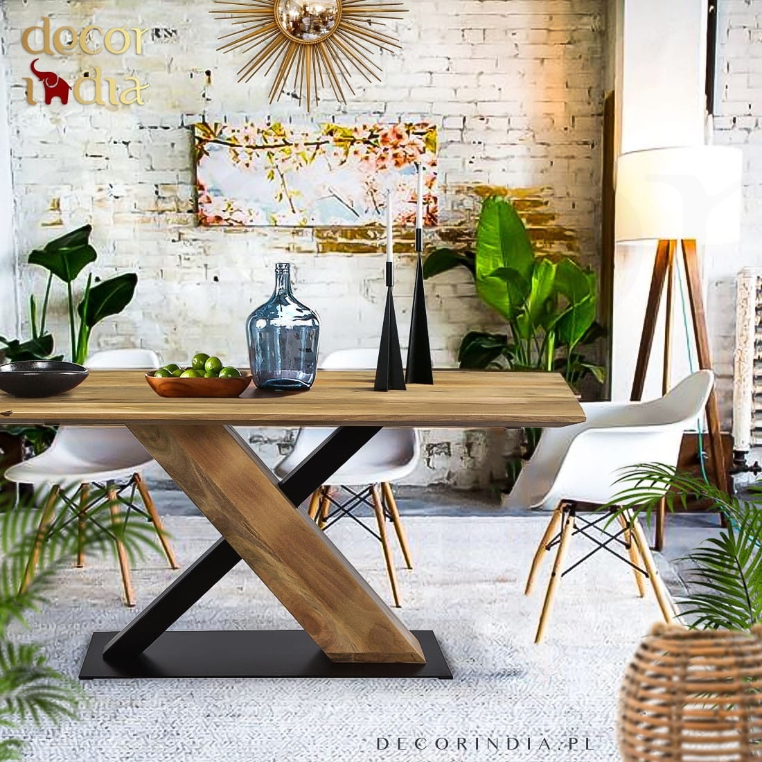 Elegancki stół jadalniany z włoskim designem z drewna mango i metalową podstawą