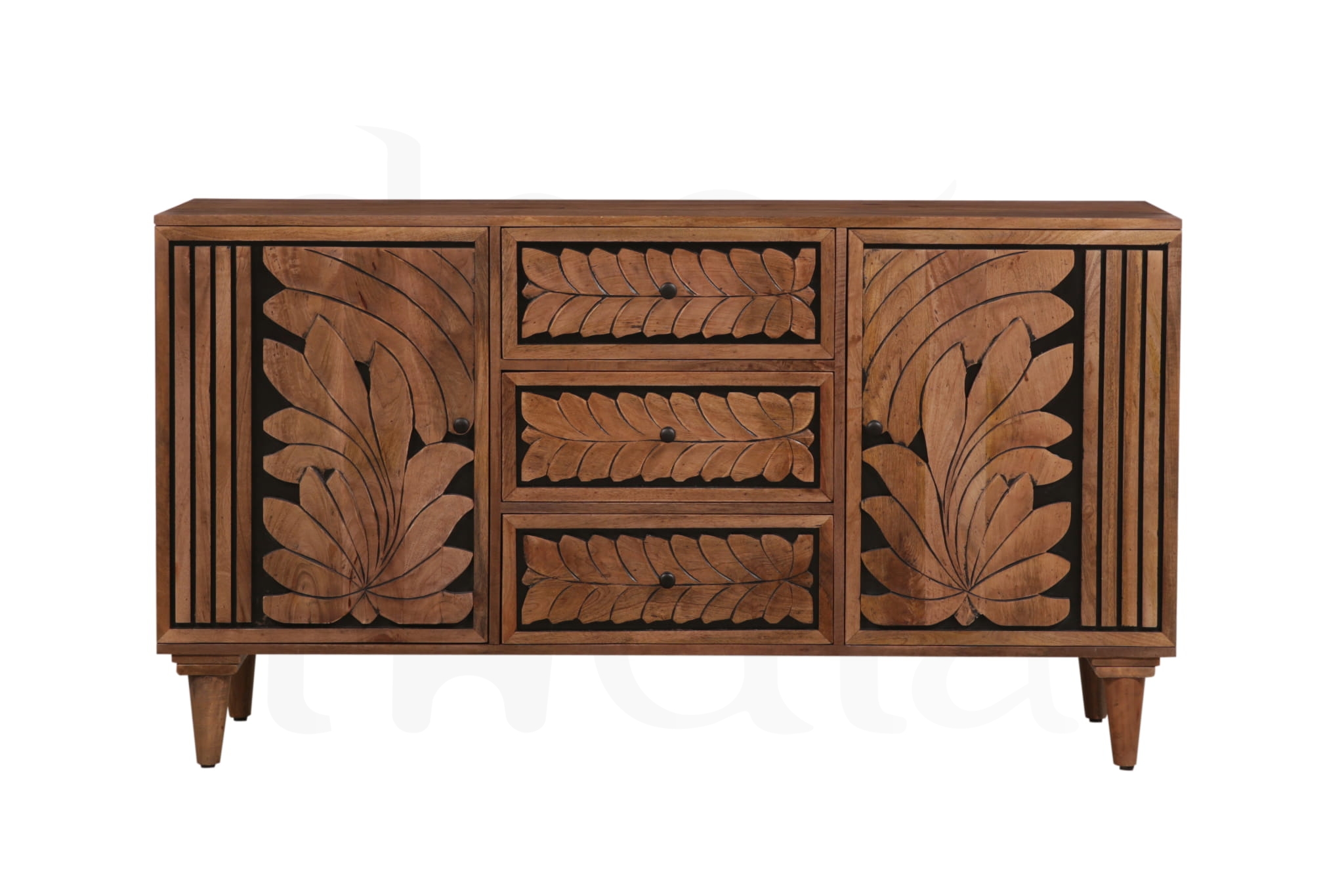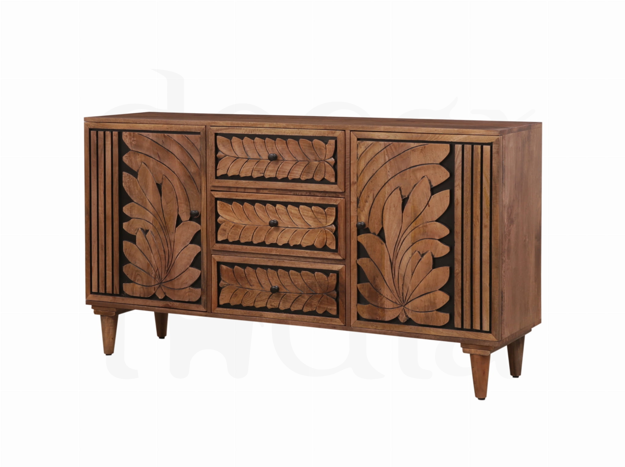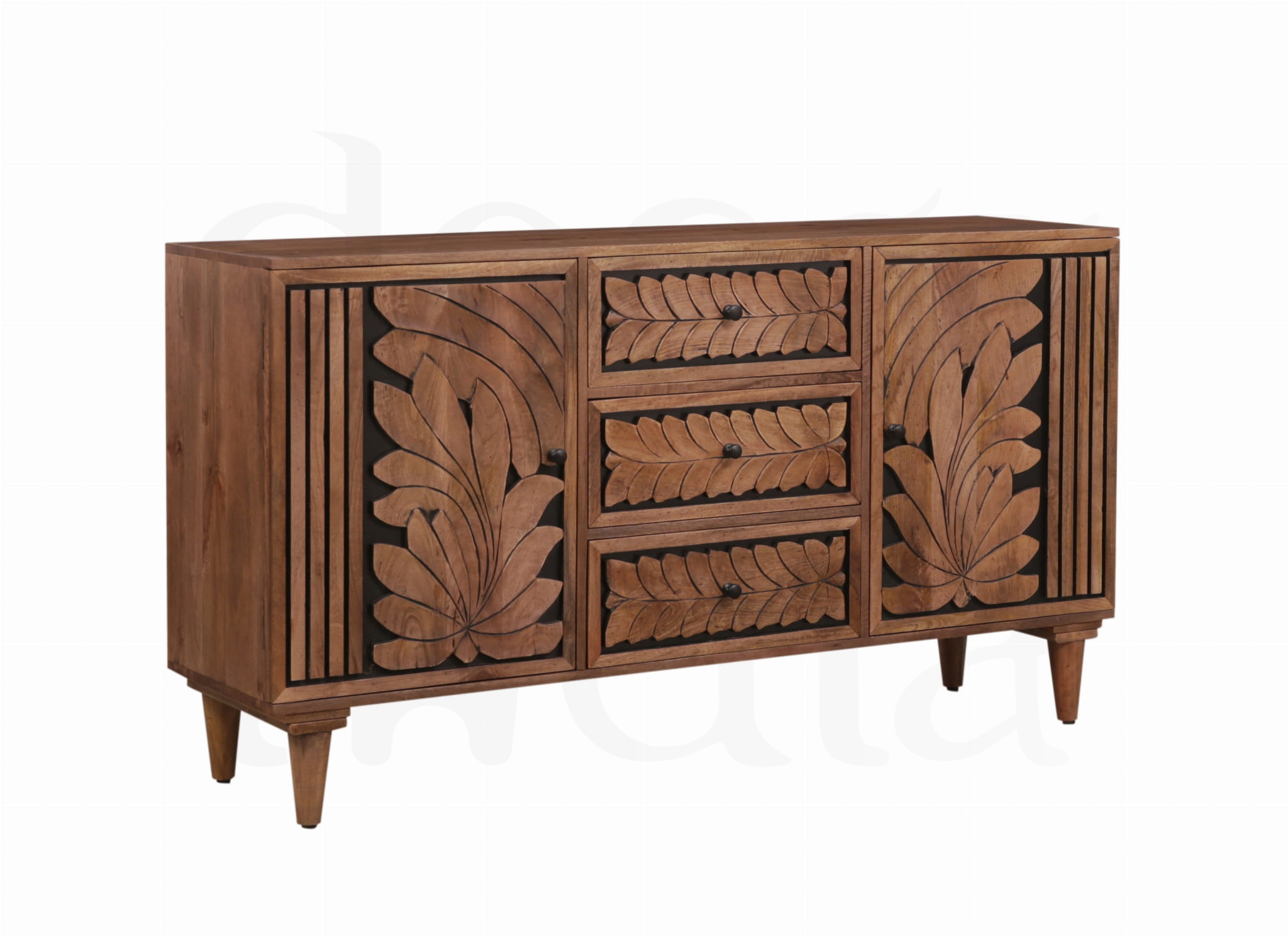 Ta Rzeźbione drewniana indyjska komoda mango to doskonały przykład, jak połączyć prostotę z elegancją. Wykonana z wyselekcjonowanego drewna mango, mebel ten zachwyca swoją trwałością i subtelnym, naturalnym pięknem. Rzeźbione drzwi komody z motywem liści są nie tylko piękne, ale również symboliczne, przywodząc na myśl bliskość z naturą, która jest tak ceniona w indyjskiej kulturze.