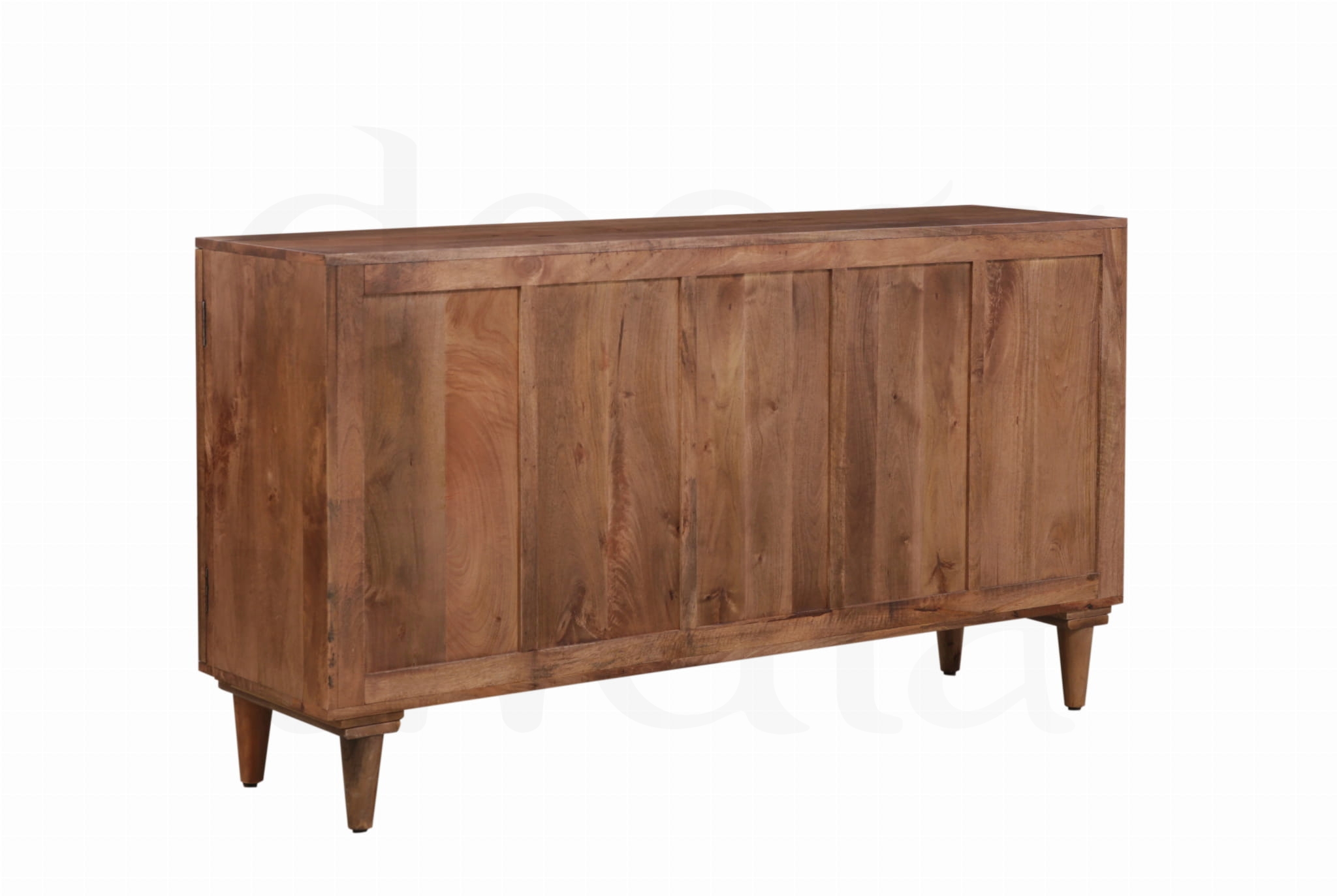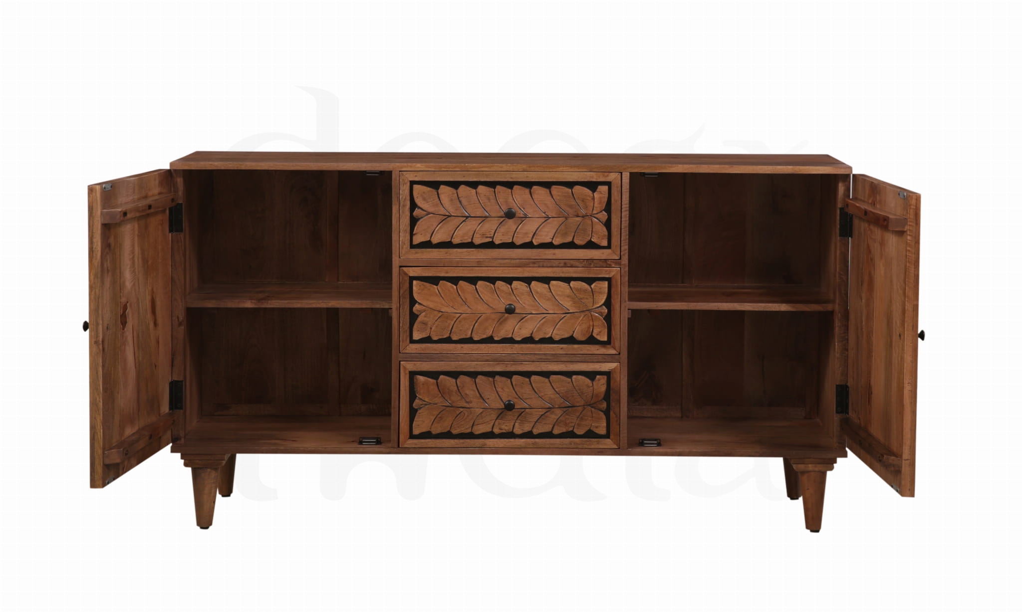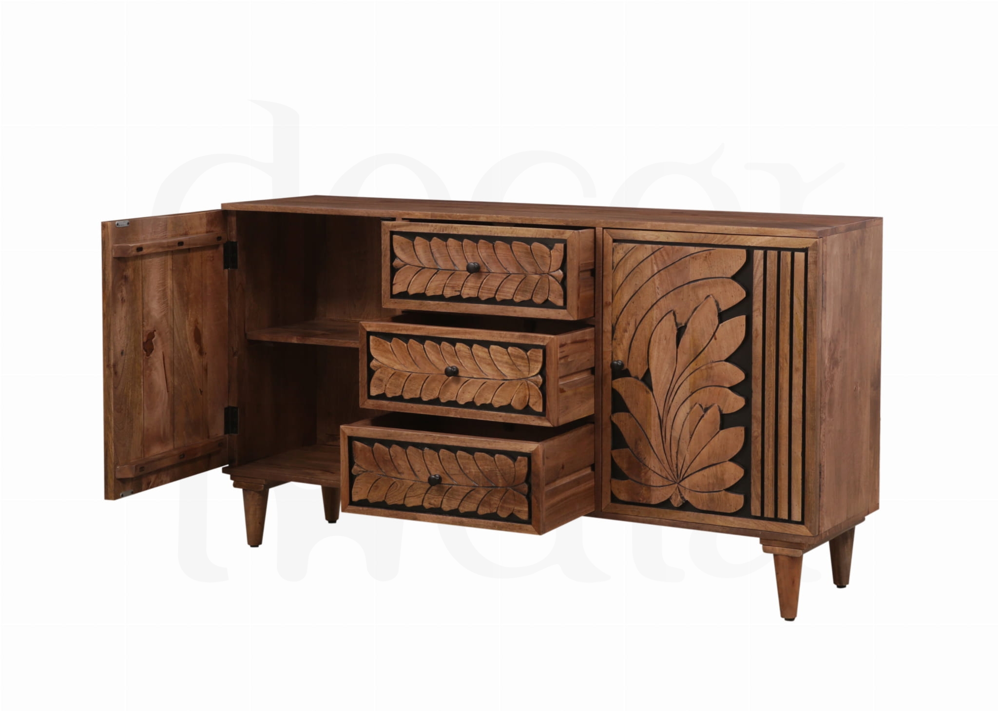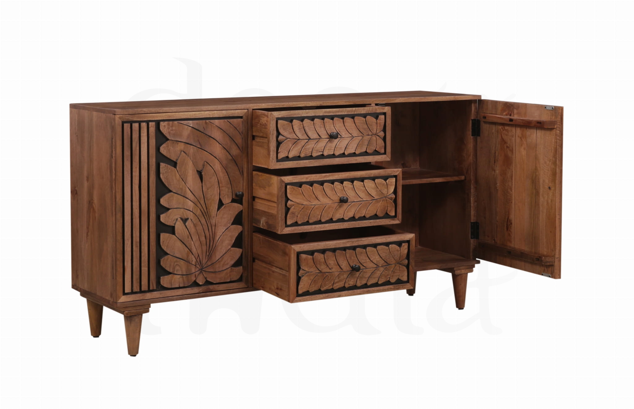Ta Rzeźbione drewniana indyjska komoda mango to doskonały przykład, jak połączyć prostotę z elegancją. Wykonana z wyselekcjonowanego drewna mango, mebel ten zachwyca swoją trwałością i subtelnym, naturalnym pięknem. Rzeźbione drzwi komody z motywem liści są nie tylko piękne, ale również symboliczne, przywodząc na myśl bliskość z naturą, która jest tak ceniona w indyjskiej kulturze.
