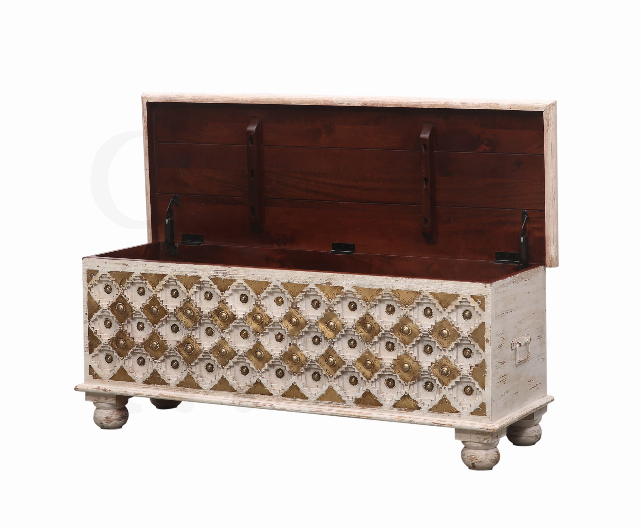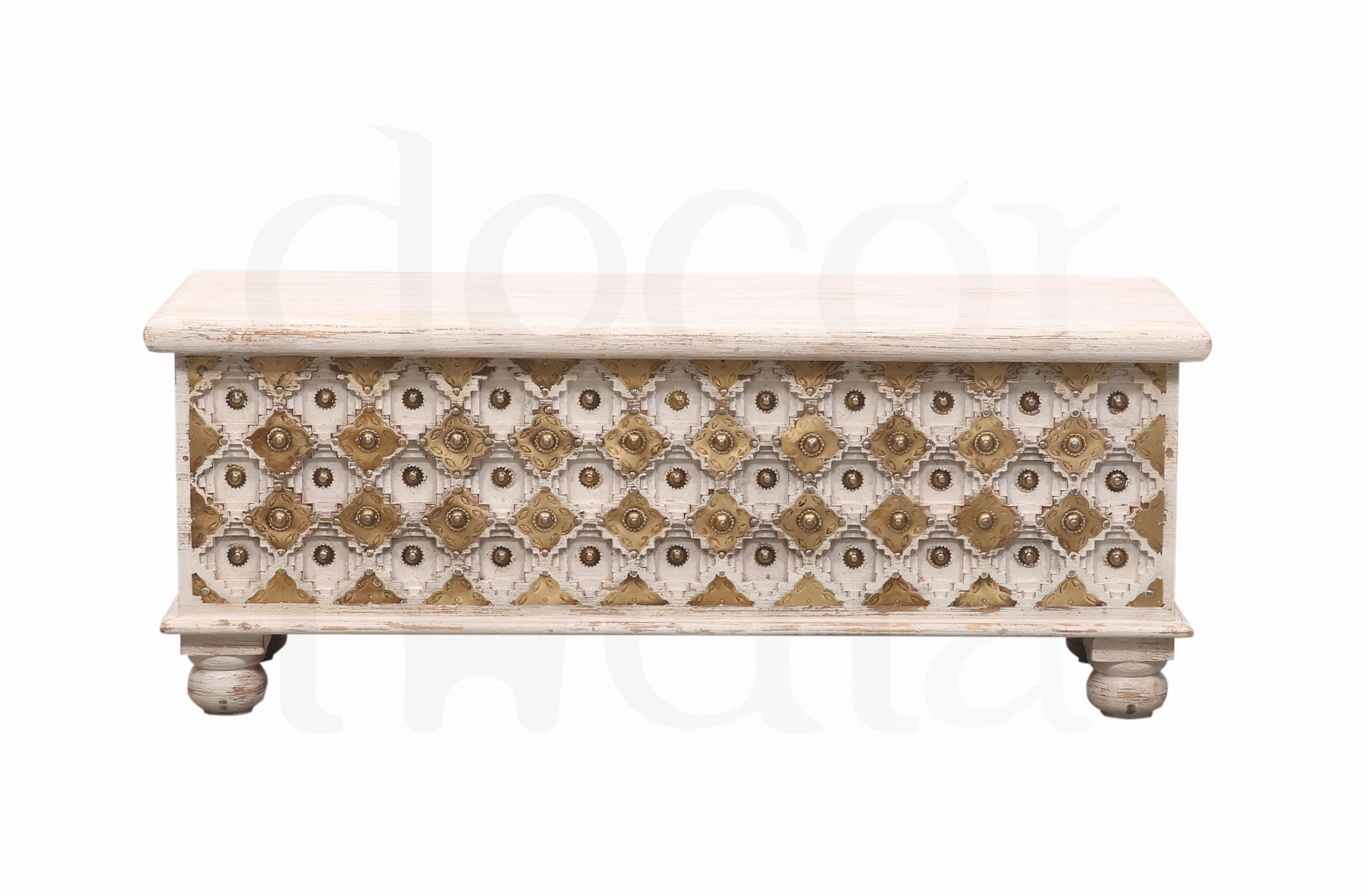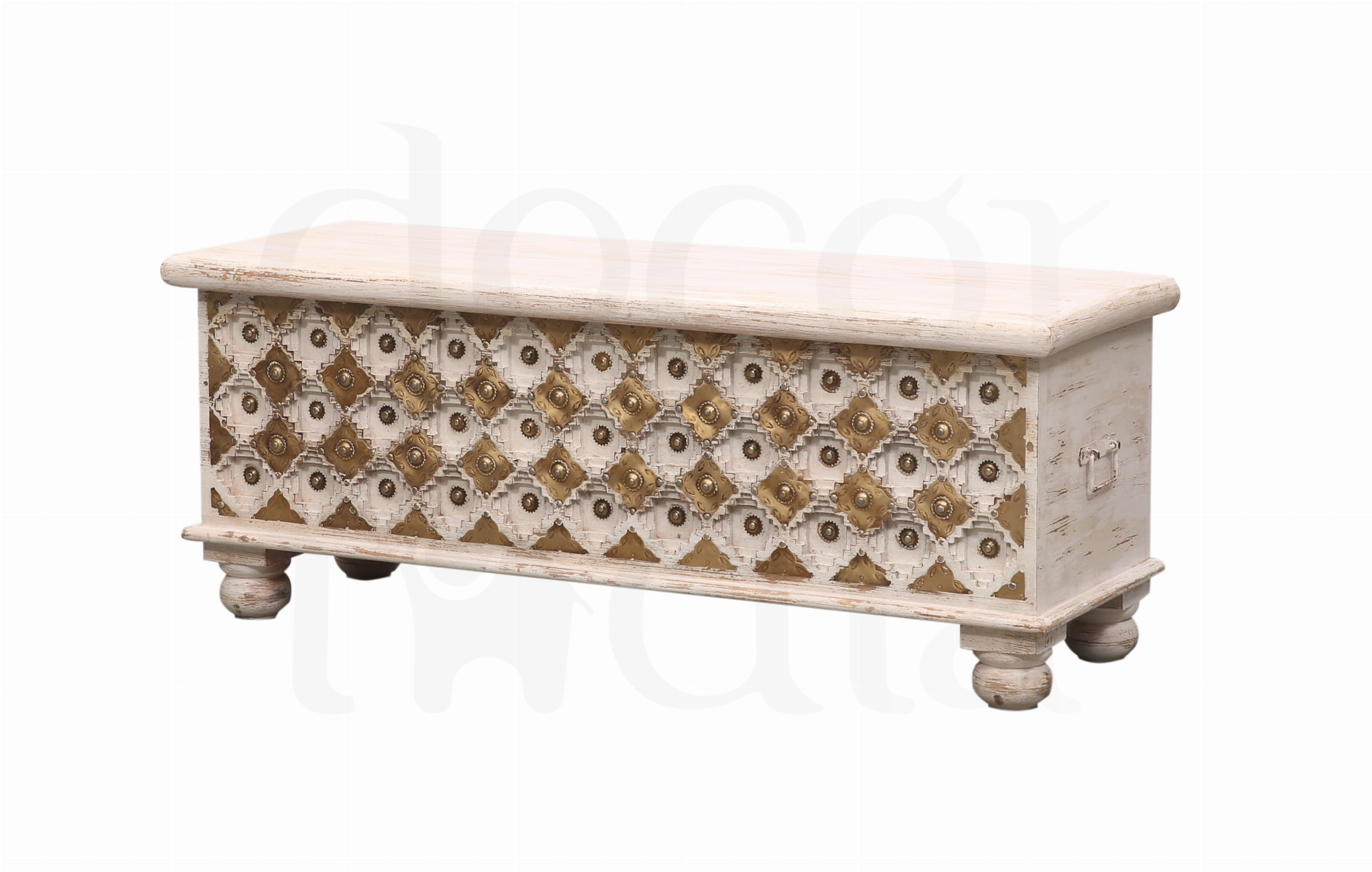Ta wyjątkowa indyjska skrzynia zachwyca subtelnym połączeniem złota i beżu, tworząc harmonijny, luksusowy wygląd, który wprowadza do wnętrza ciepło i blask Orientu. Wykonana z naturalnego drewna mango, słynie z trwałości i pięknej, naturalnej struktury.