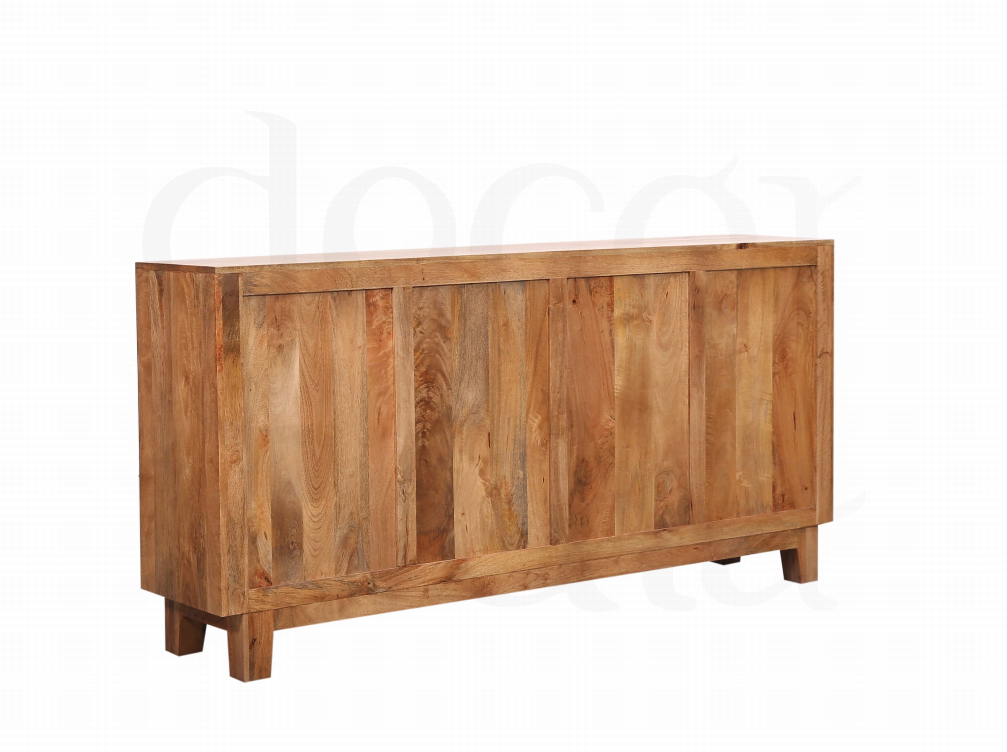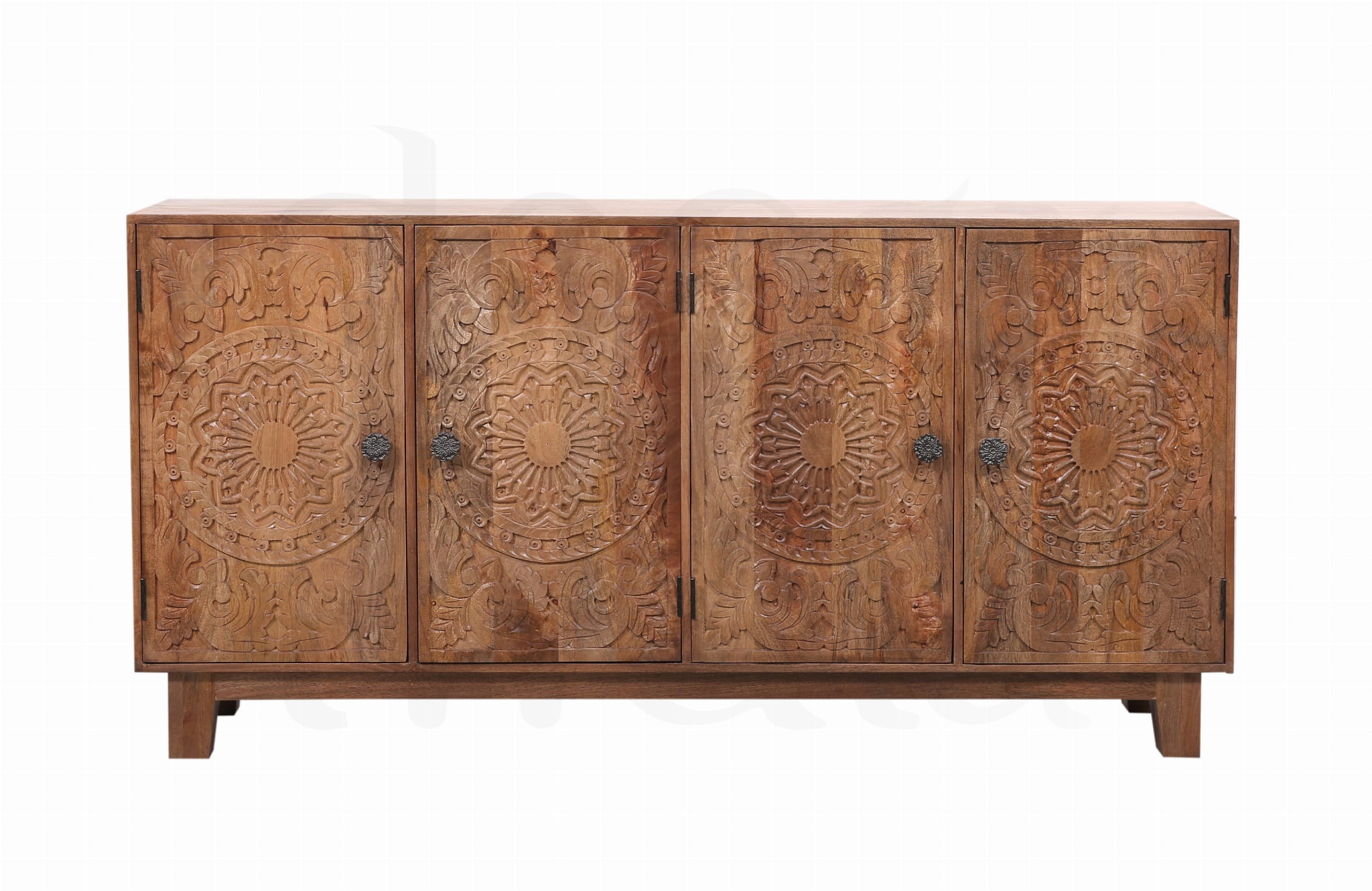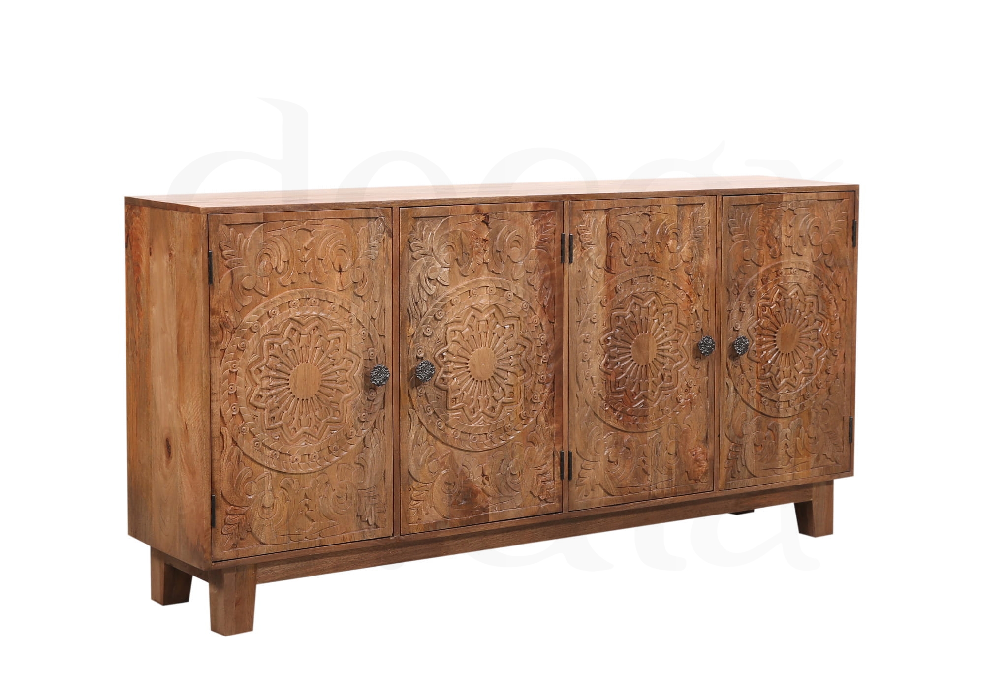 Ta wyjątkowa komoda to prawdziwe dzieło sztuki rzemieślniczej, które przenosi do świata indyjskich tradycji i kunsztu stolarskiego. Wykonana z solidnego drewna mango w naturalnym wybarwieniu, zachwyca unikatowym charakterem i subtelnym urokiem egzotycznego drewna.