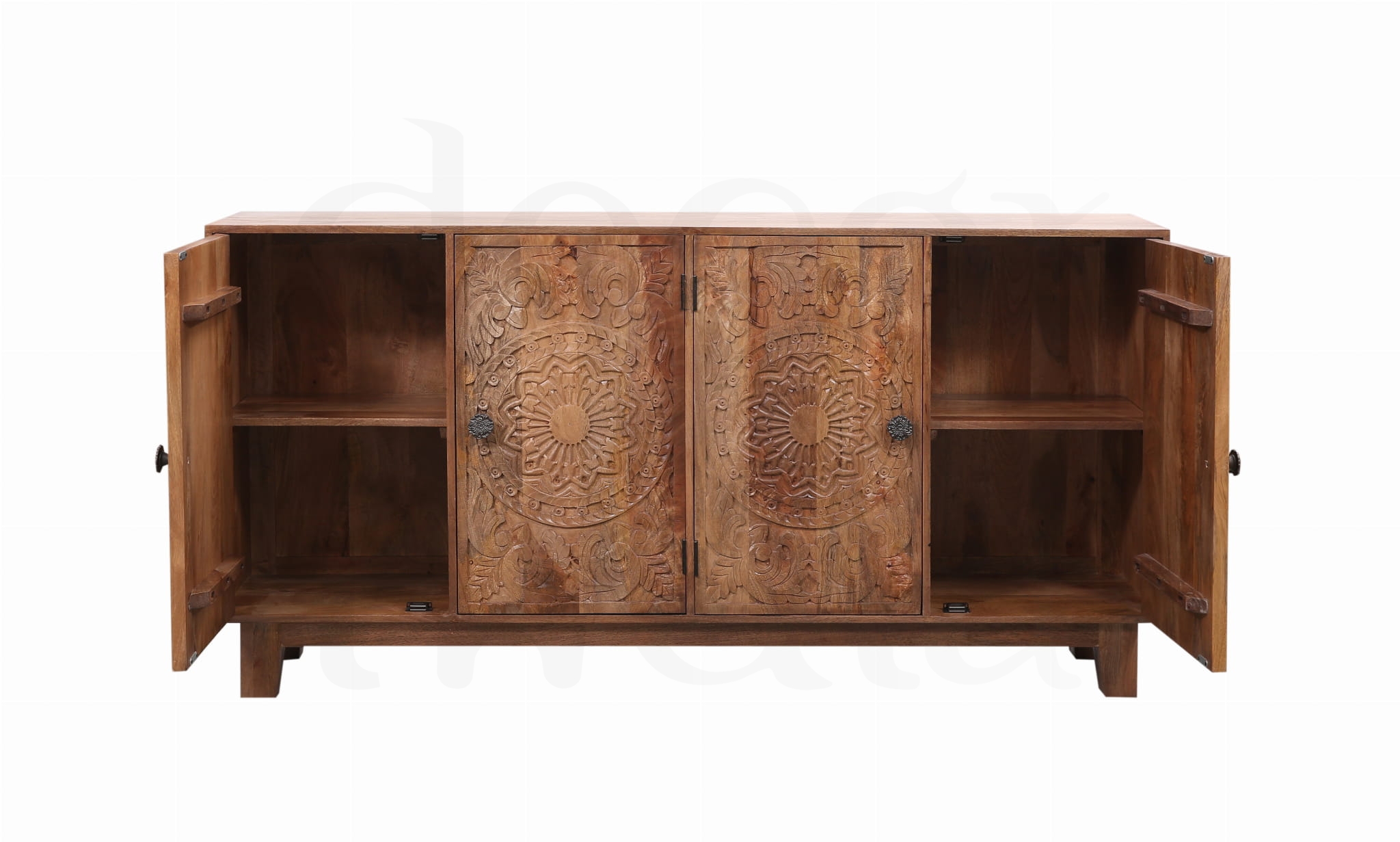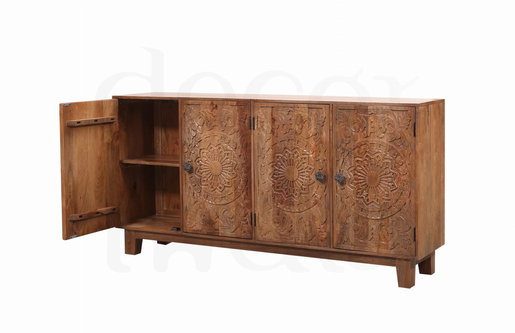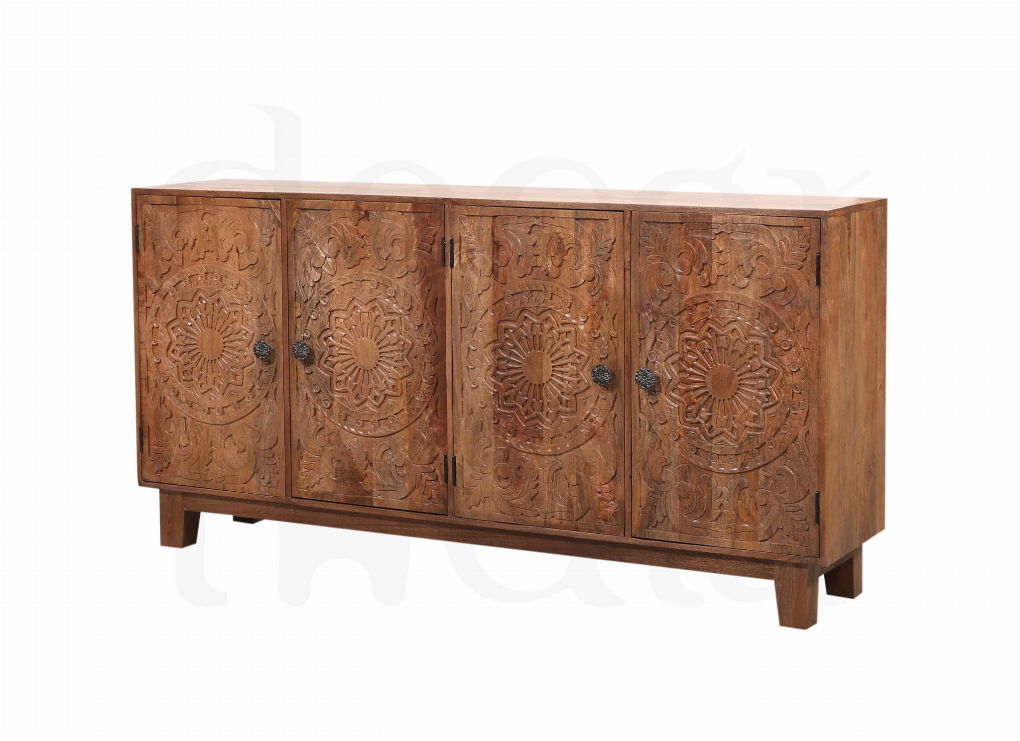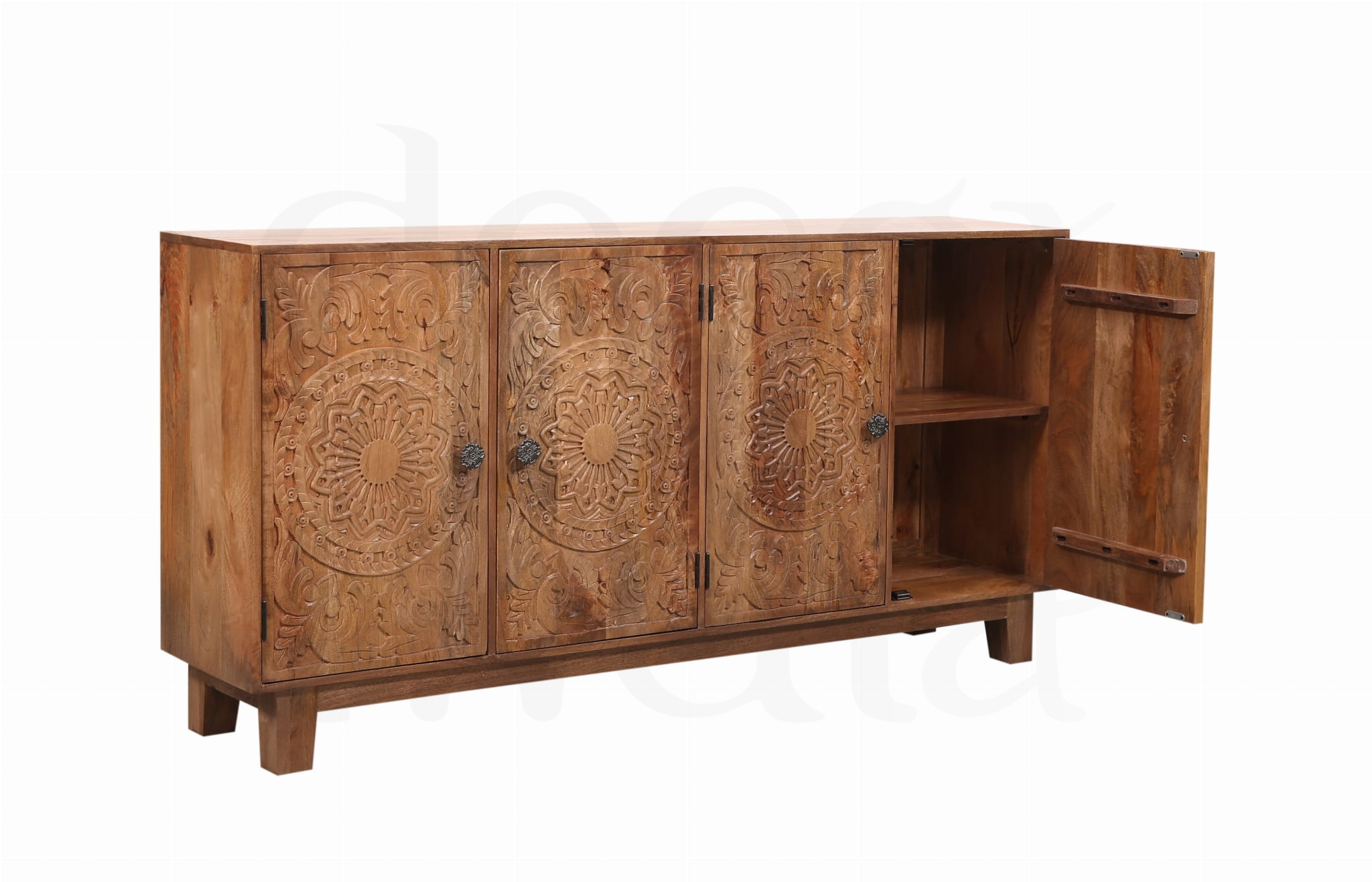 Ta wyjątkowa komoda to prawdziwe dzieło sztuki rzemieślniczej, które przenosi do świata indyjskich tradycji i kunsztu stolarskiego. Wykonana z solidnego drewna mango w naturalnym wybarwieniu, zachwyca unikatowym charakterem i subtelnym urokiem egzotycznego drewna.