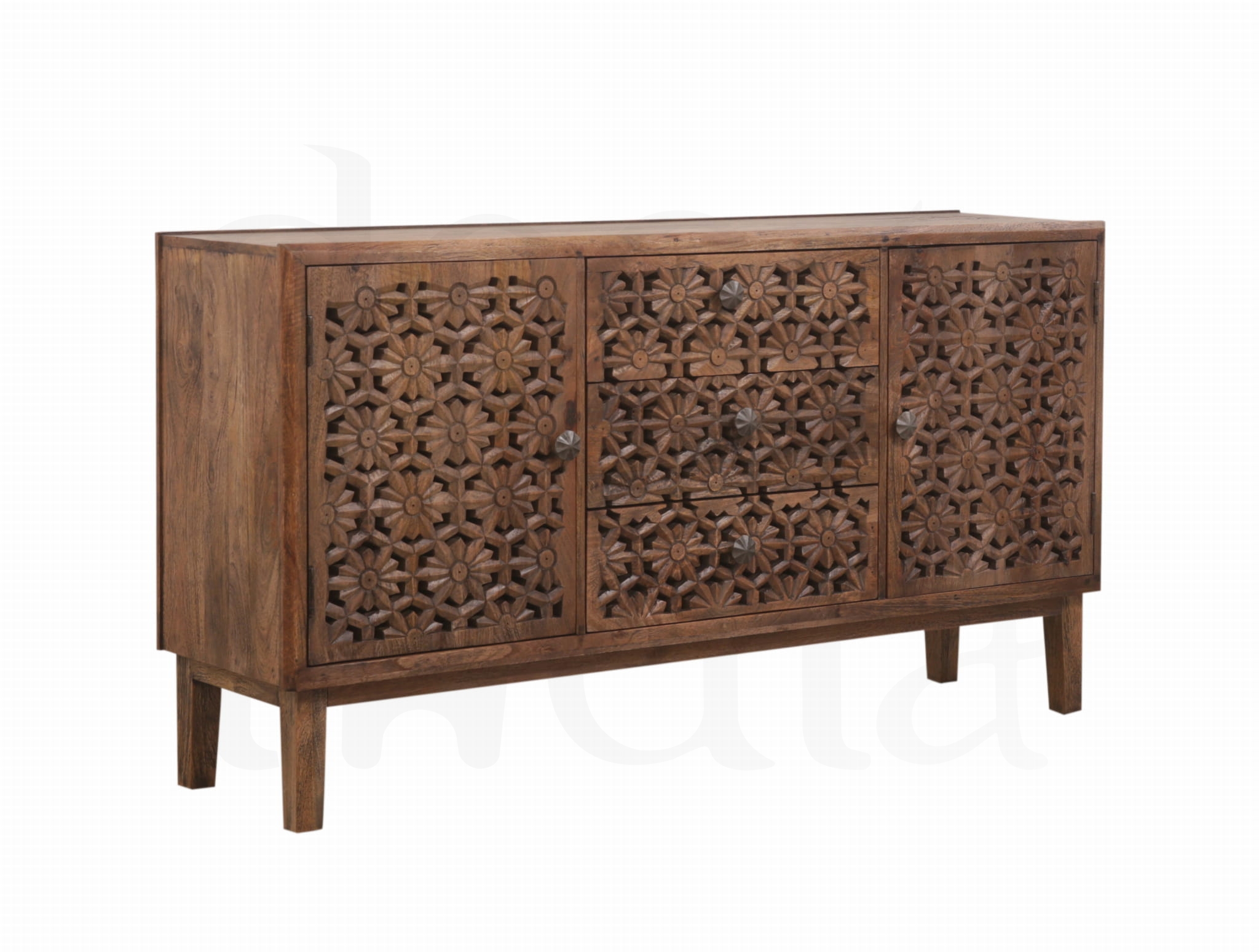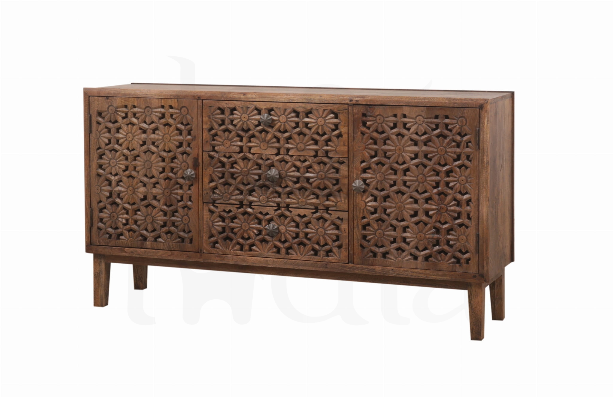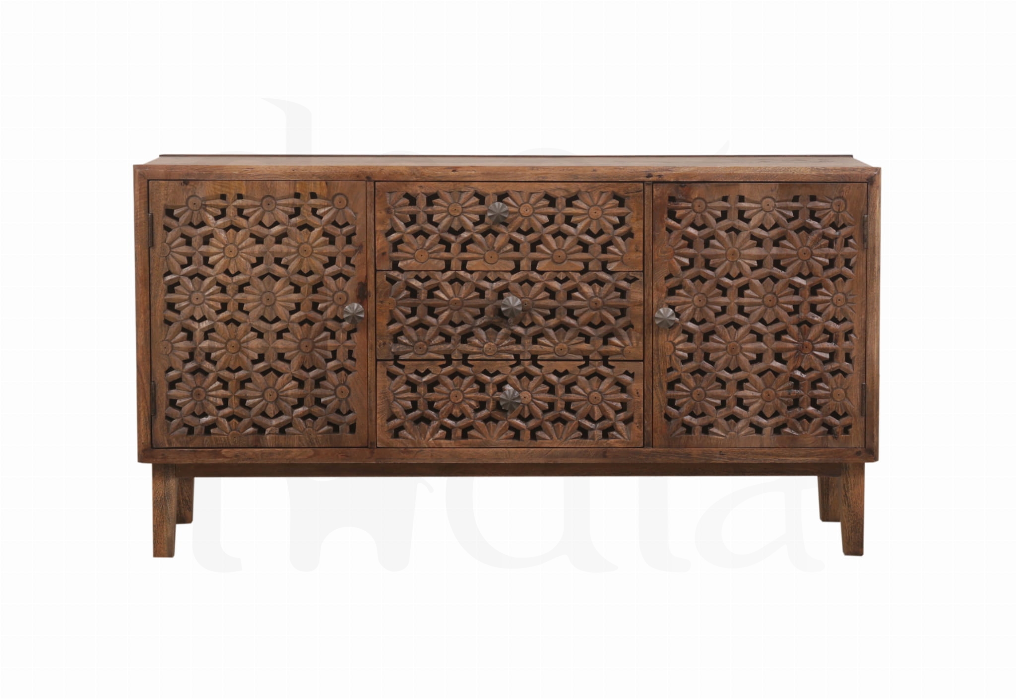 Indyjska komoda ręcznie wykonana z litego drewna mango, zachwycająca oryginalnym ażurowym wzorem typu „net”. Precyzyjna praca rzemieślnicza, naturalna struktura drewna oraz egzotyczny charakter Indii tworzą wyjątkowy mebel, który łączy funkcjonalność z artystycznym designem i nadaje wnętrzu niepowtarzalny styl.