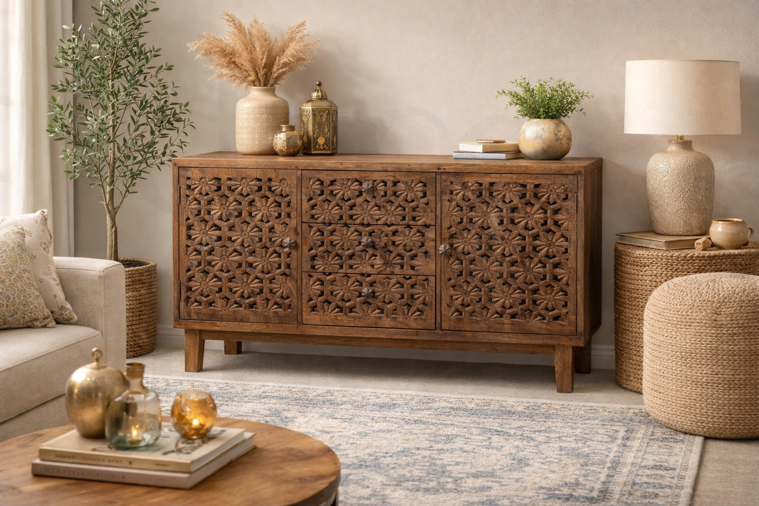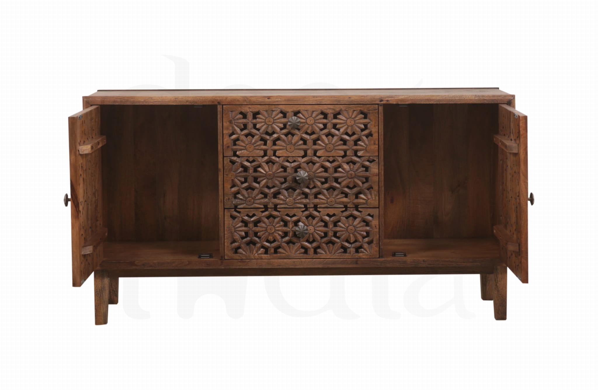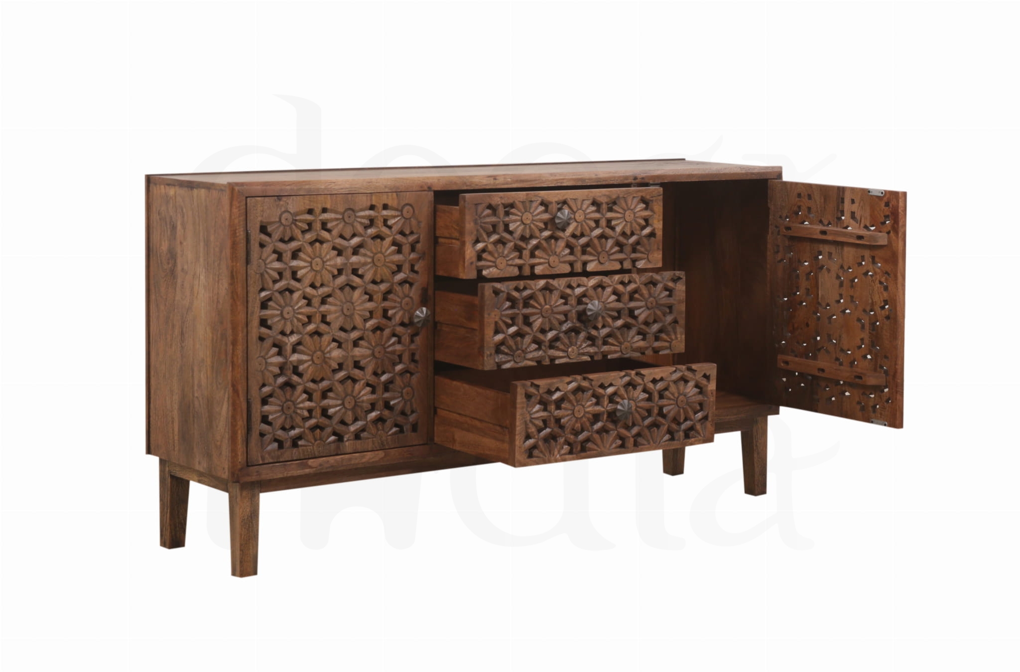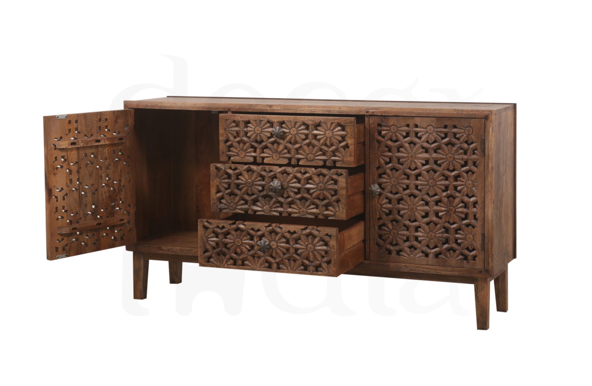 Indyjska komoda ręcznie wykonana z litego drewna mango, zachwycająca oryginalnym ażurowym wzorem typu „net”. Precyzyjna praca rzemieślnicza, naturalna struktura drewna oraz egzotyczny charakter Indii tworzą wyjątkowy mebel, który łączy funkcjonalność z artystycznym designem i nadaje wnętrzu niepowtarzalny styl.