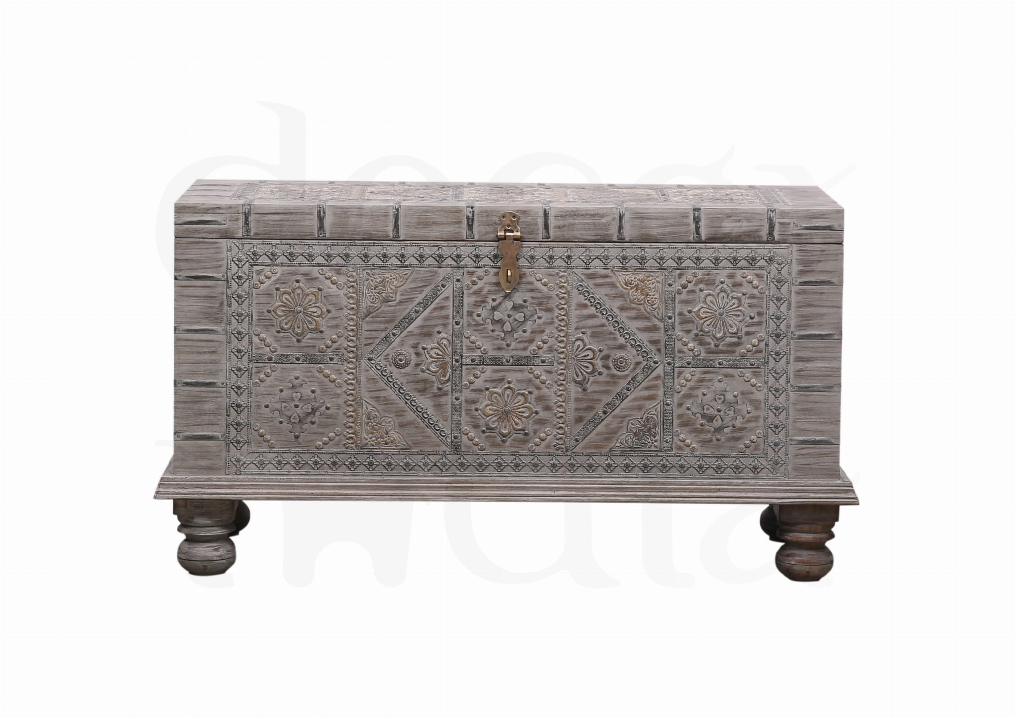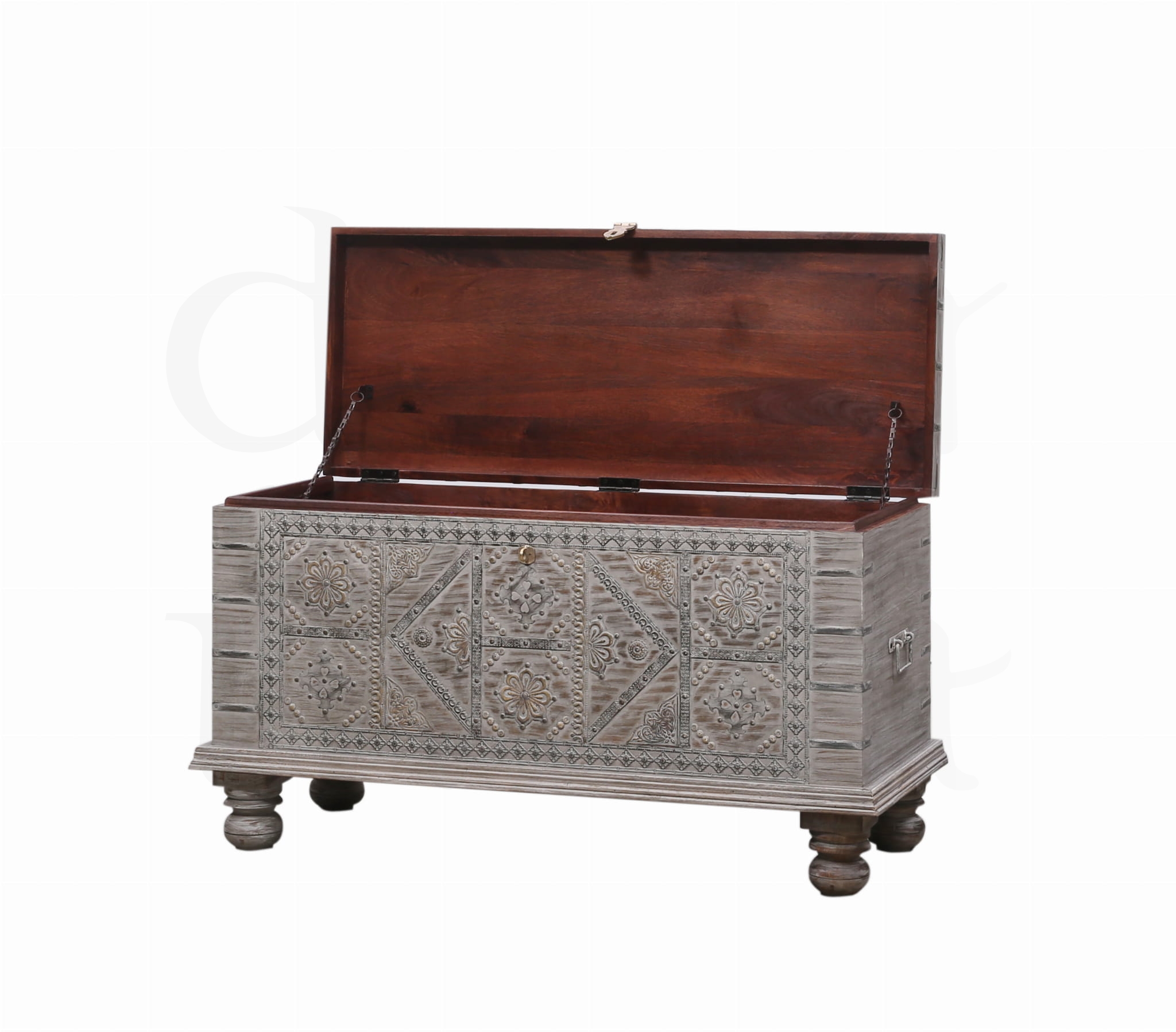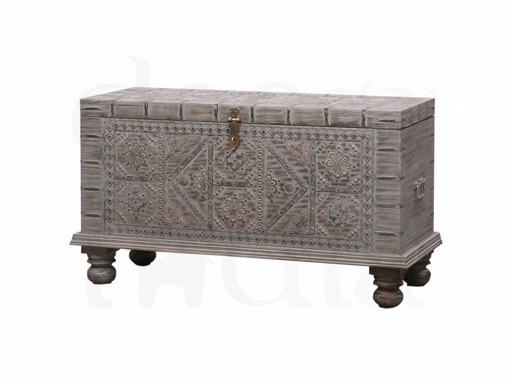 Ta unikatowa skrzynia przybywa prosto z Indii, łącząc w sobie tradycyjne, ręcznie wykonane detale z ponadczasowym urokiem egzotycznego drewna. Solidna konstrukcja, artystyczne metalowe zdobienia i autentyczny charakter sprawiają, że każdy egzemplarz ma własną duszę i historię.