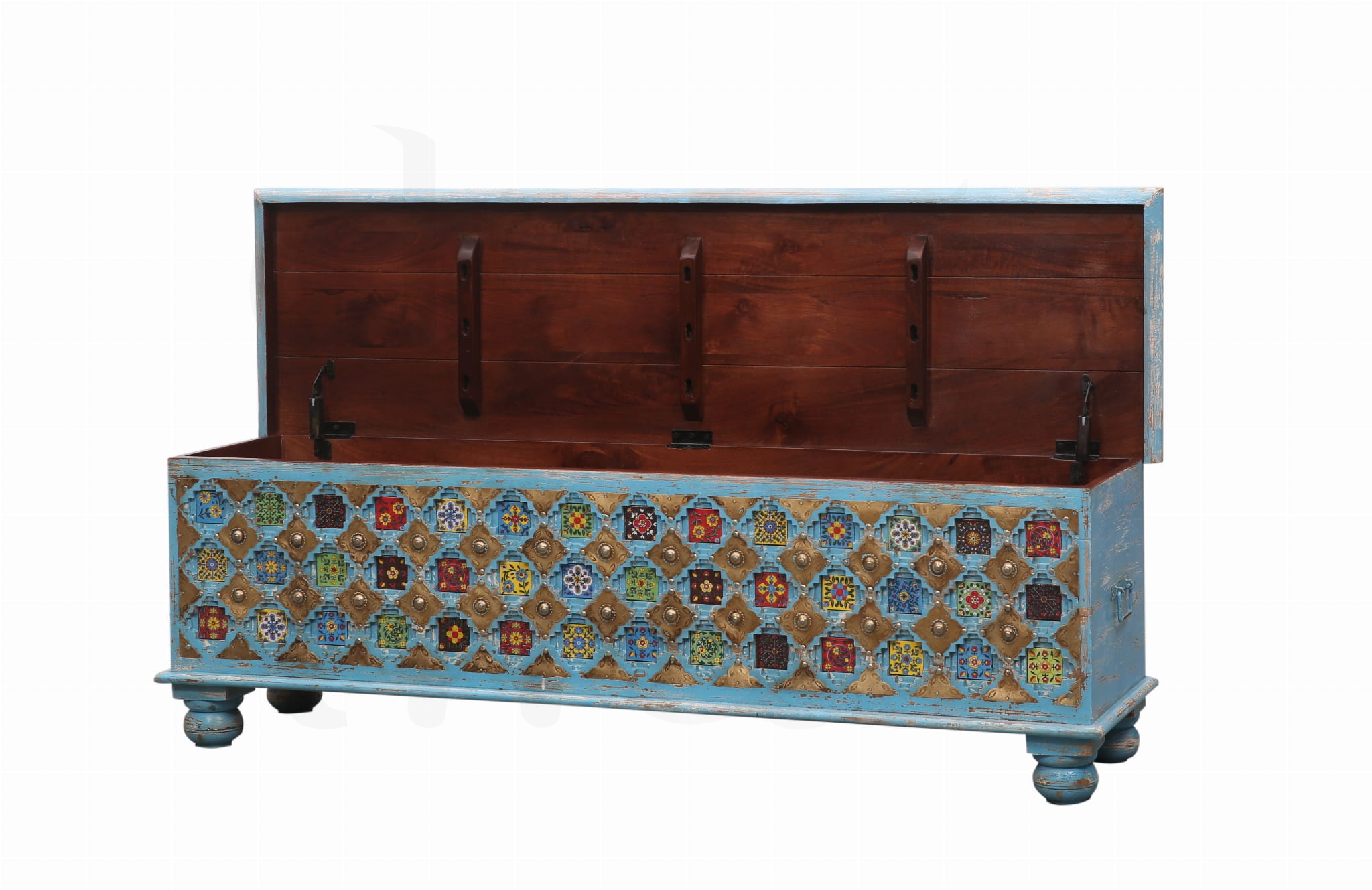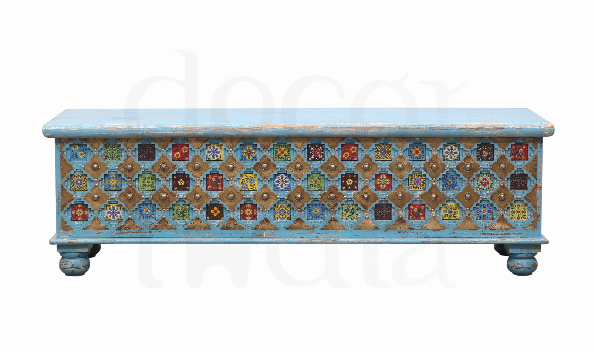 Każdy detal to małe dzieło sztuki – barwne kafelki w orientalnych wzorach rozświetlają przestrzeń, a misternie wykonane metalowe elementy nadają skrzyni elegancji i charakteru. To nie tylko praktyczny mebel, ale prawdziwa ozdoba wnętrza, która przyciąga wzrok i wprowadza ciepło Indii do Twojego domu.