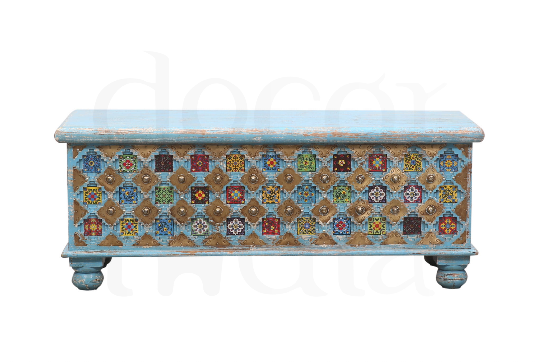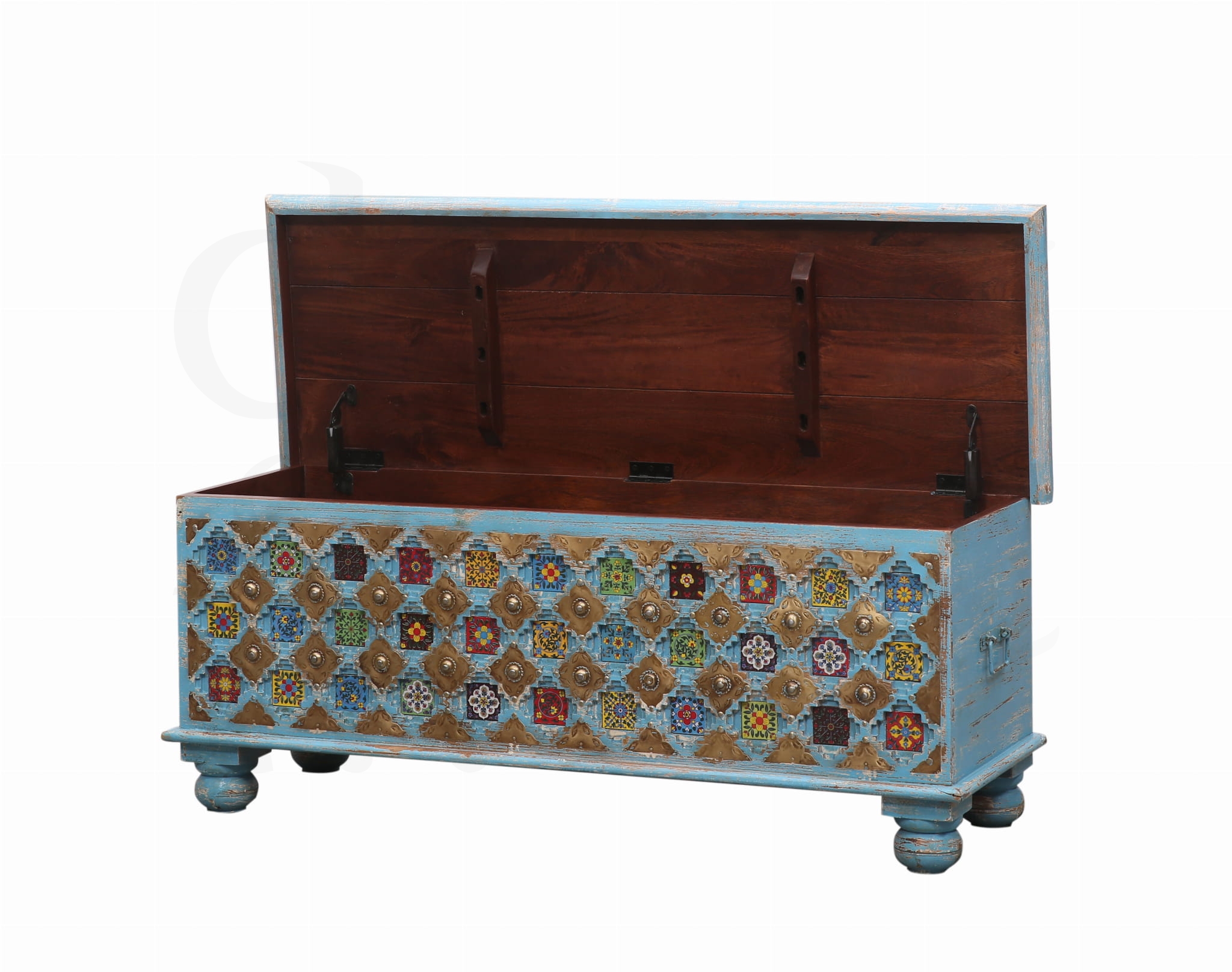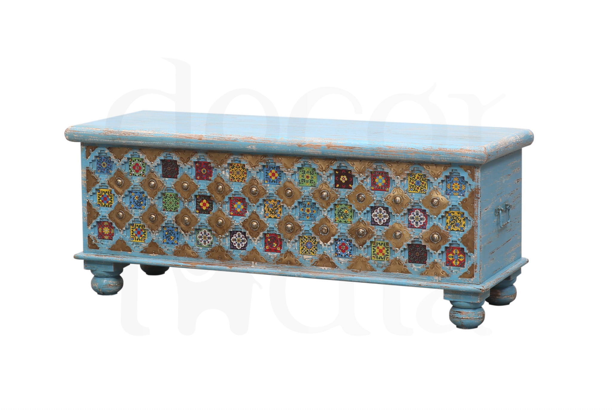 Każdy detal to małe dzieło sztuki – barwne kafelki w orientalnych wzorach rozświetlają przestrzeń, a misternie wykonane metalowe elementy nadają skrzyni elegancji i charakteru. To nie tylko praktyczny mebel, ale prawdziwa ozdoba wnętrza, która przyciąga wzrok i wprowadza ciepło Indii do Twojego domu.
