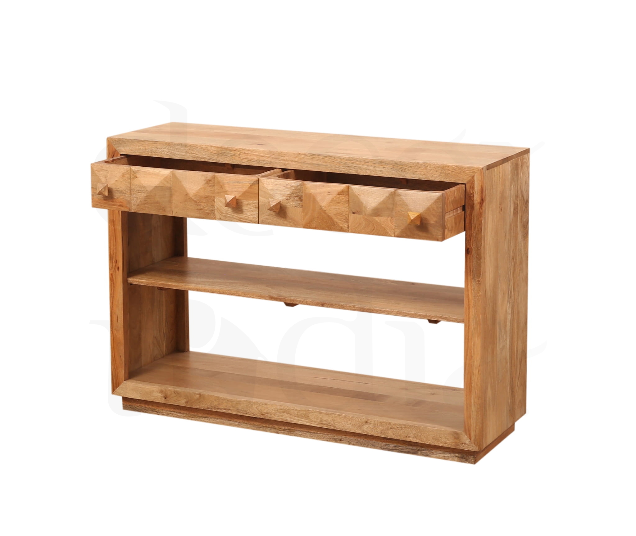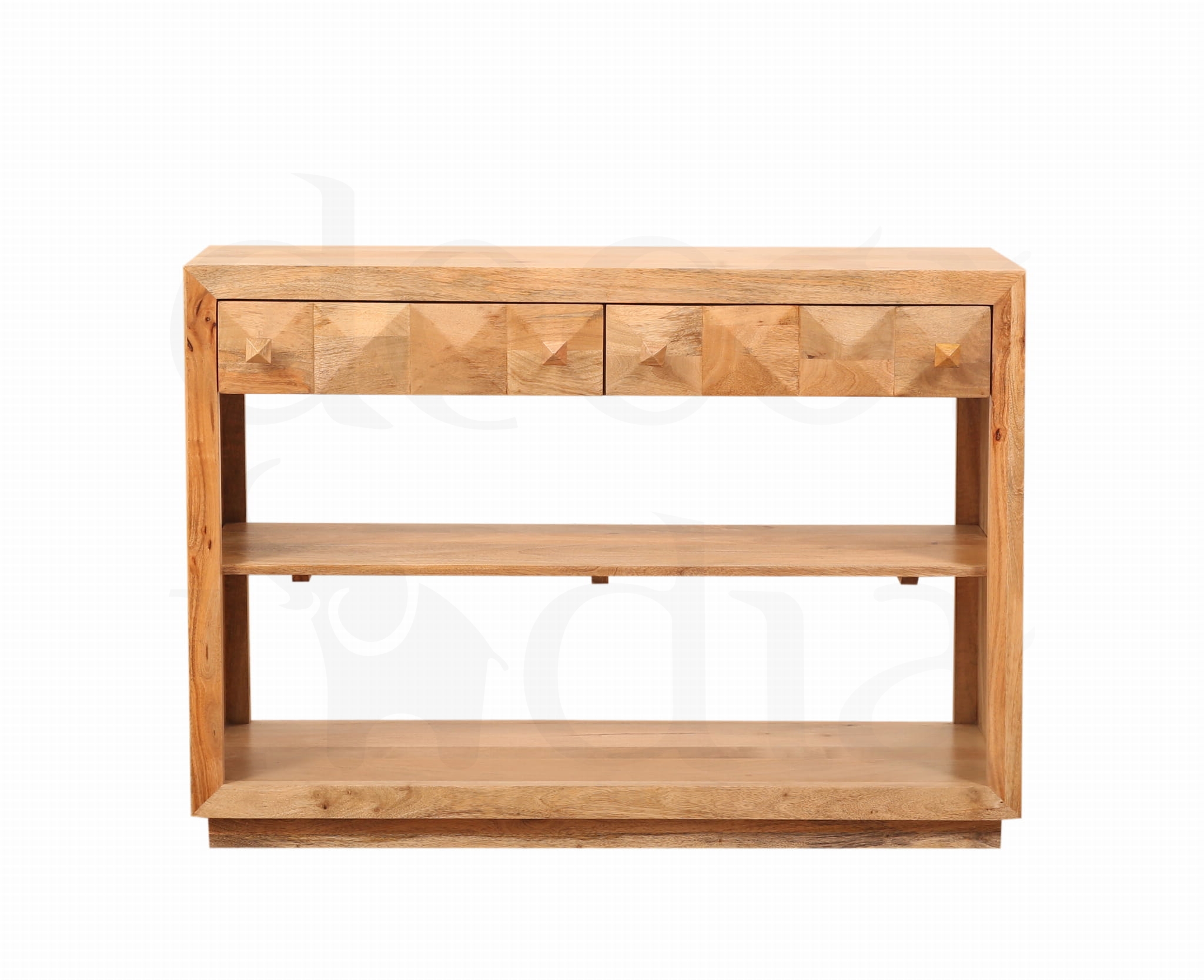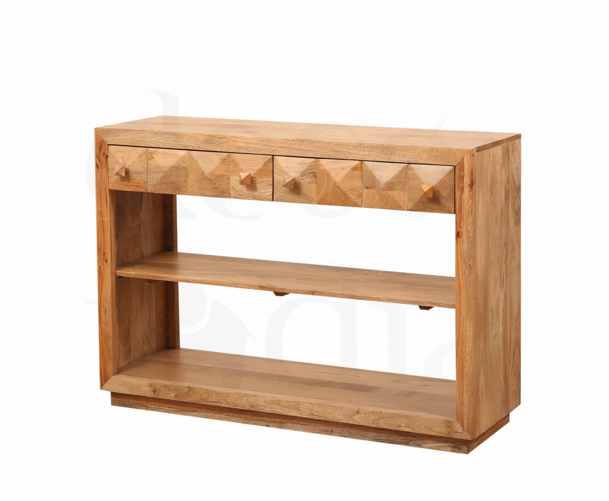 Stylowa konsola wykonana z litego drewna mango, ozdobiona unikalnym diamentowym wzorem na froncie. To mebel, który łączy elegancję z funkcjonalnością — smukła forma sprawia, że idealnie pasuje do przedpokoju, salonu lub sypialni.