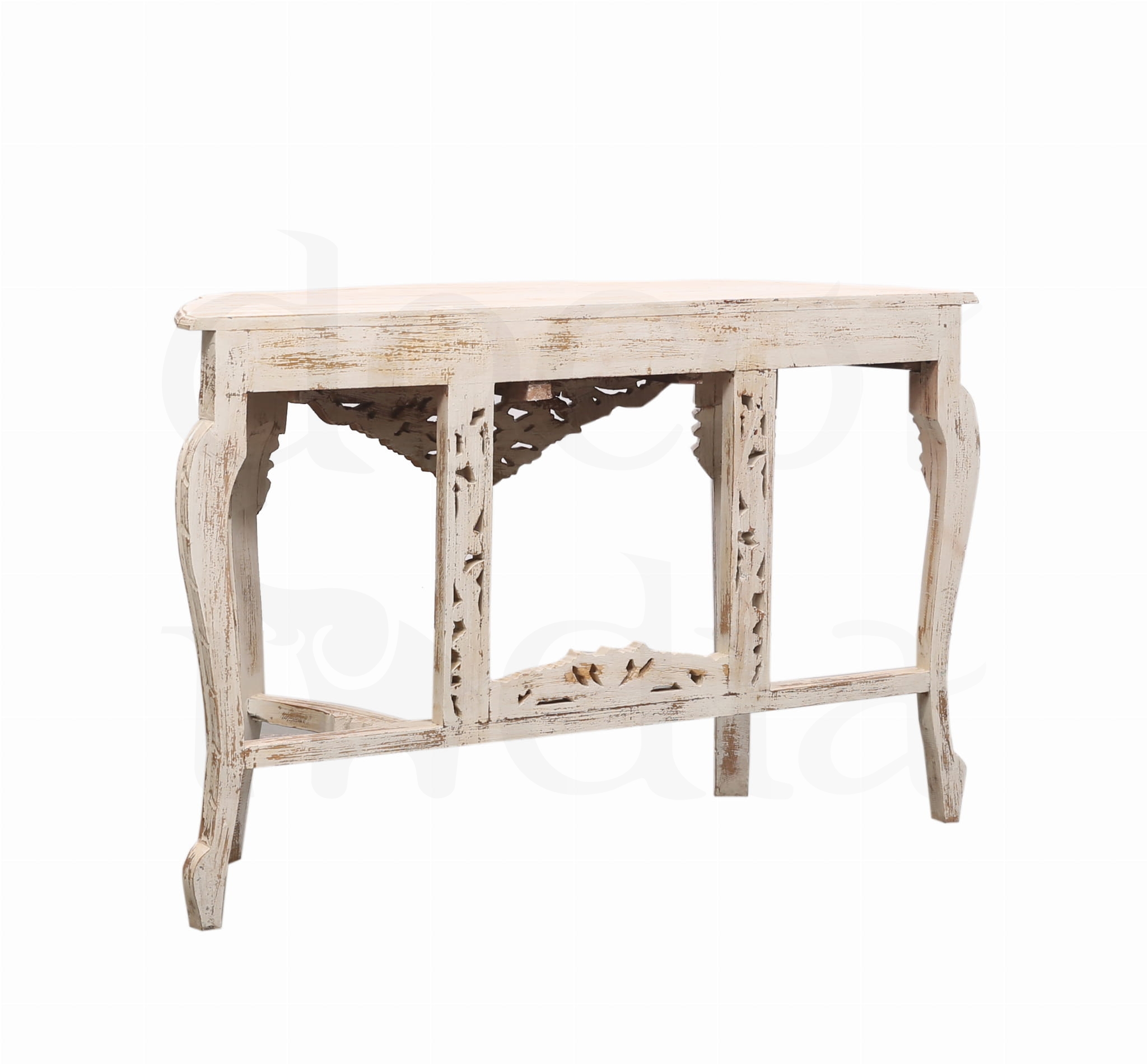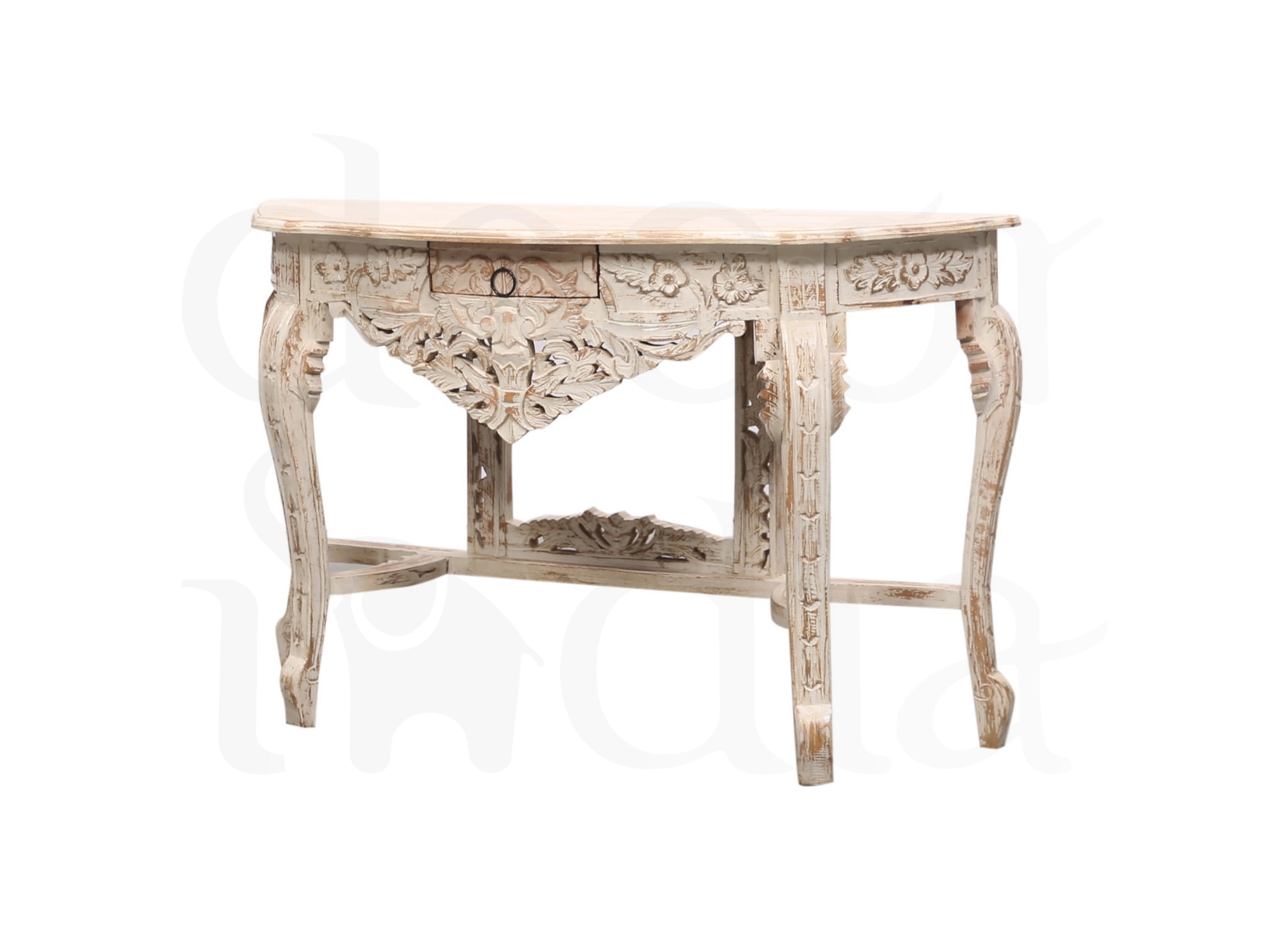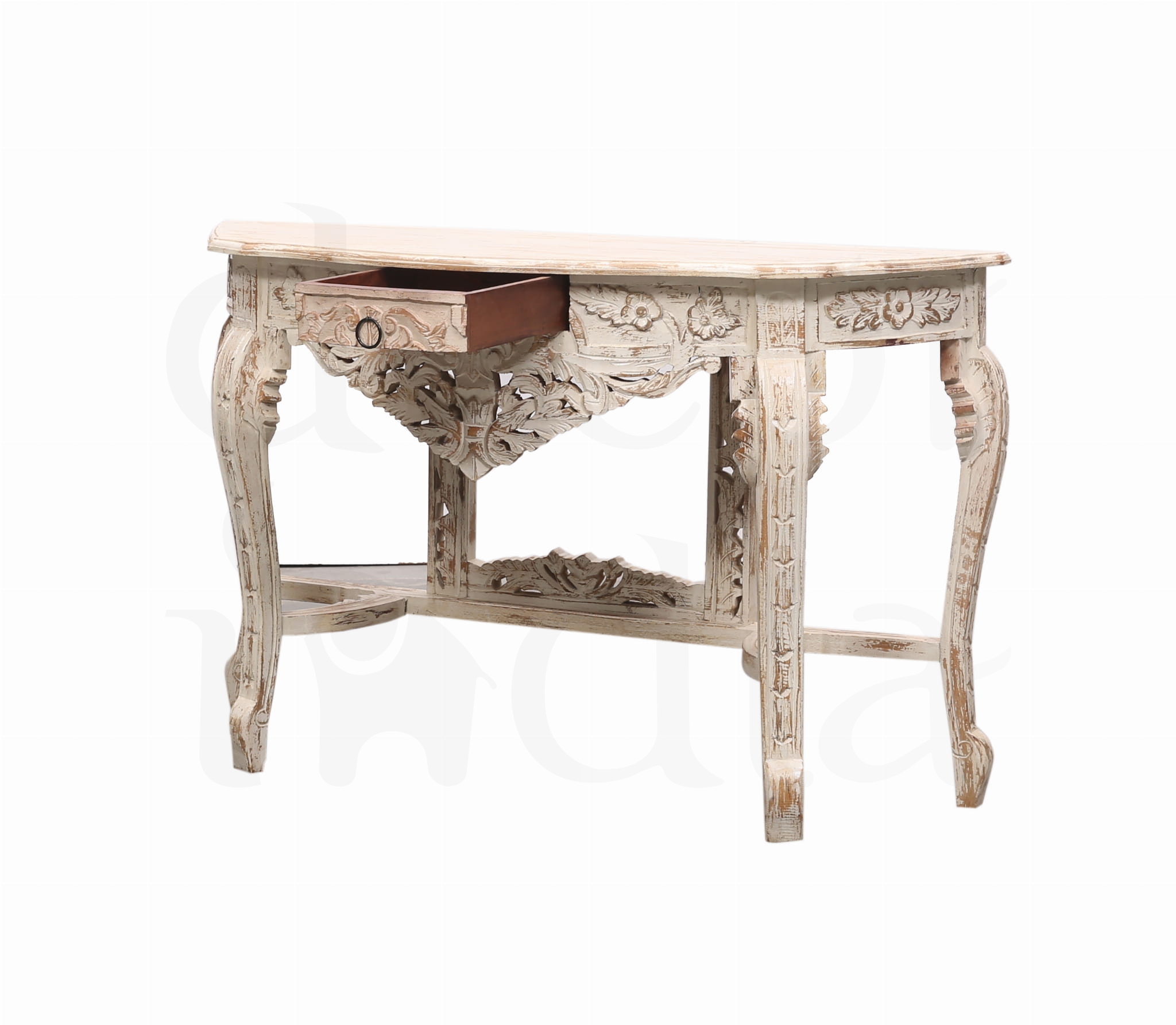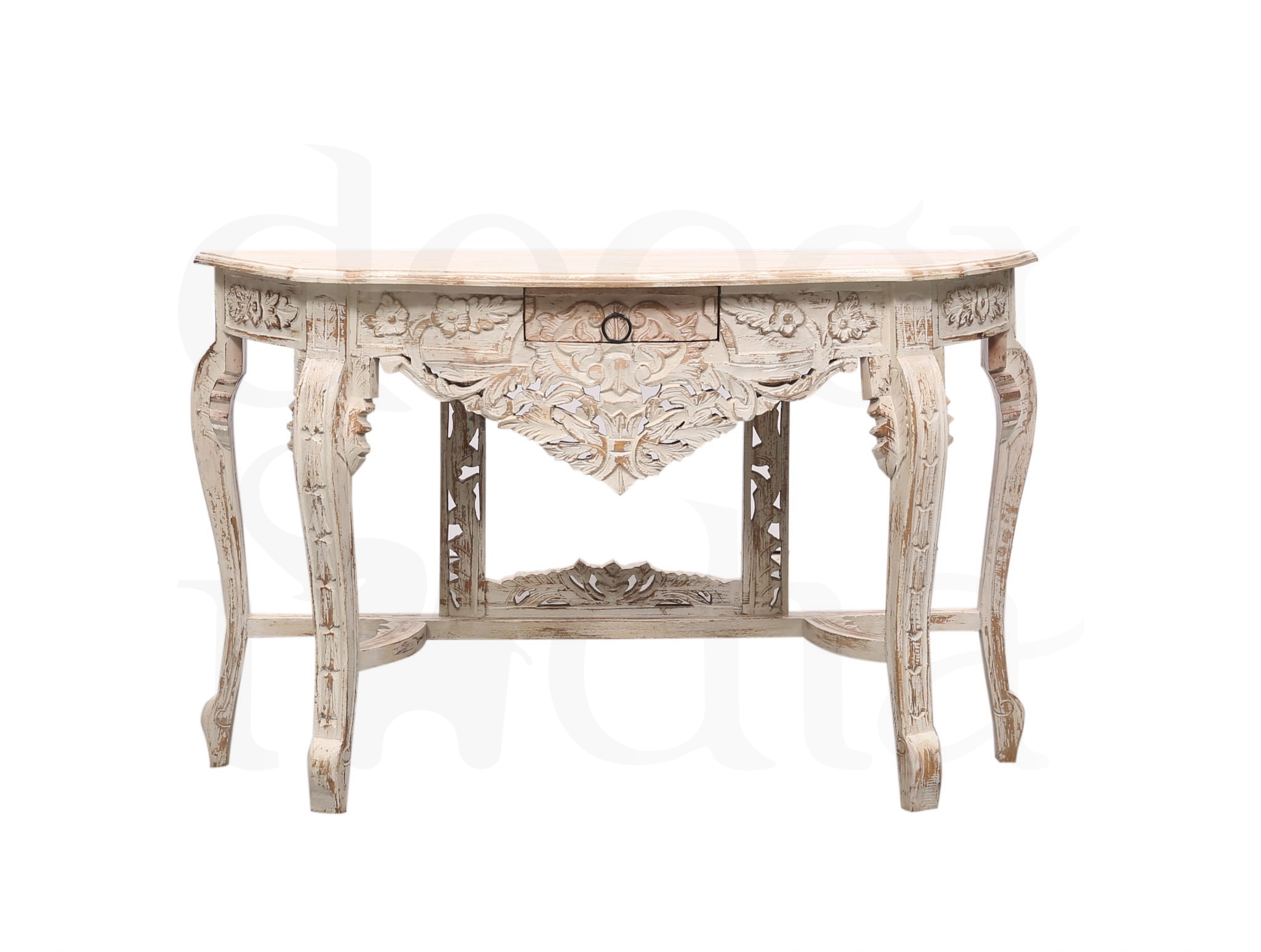 Klasyczna elegancja spotyka naturalne piękno. Ta antyczna konsola wykonana z litego drewna mango w subtelnym odcieniu Acree zachwyca szlachetnym wykończeniem i ręcznie rzeźbionymi detalami. Ciepły ton drewna i delikatne postarzenie nadają jej wyjątkowy charakter – pełen historii, stylu i harmonii.