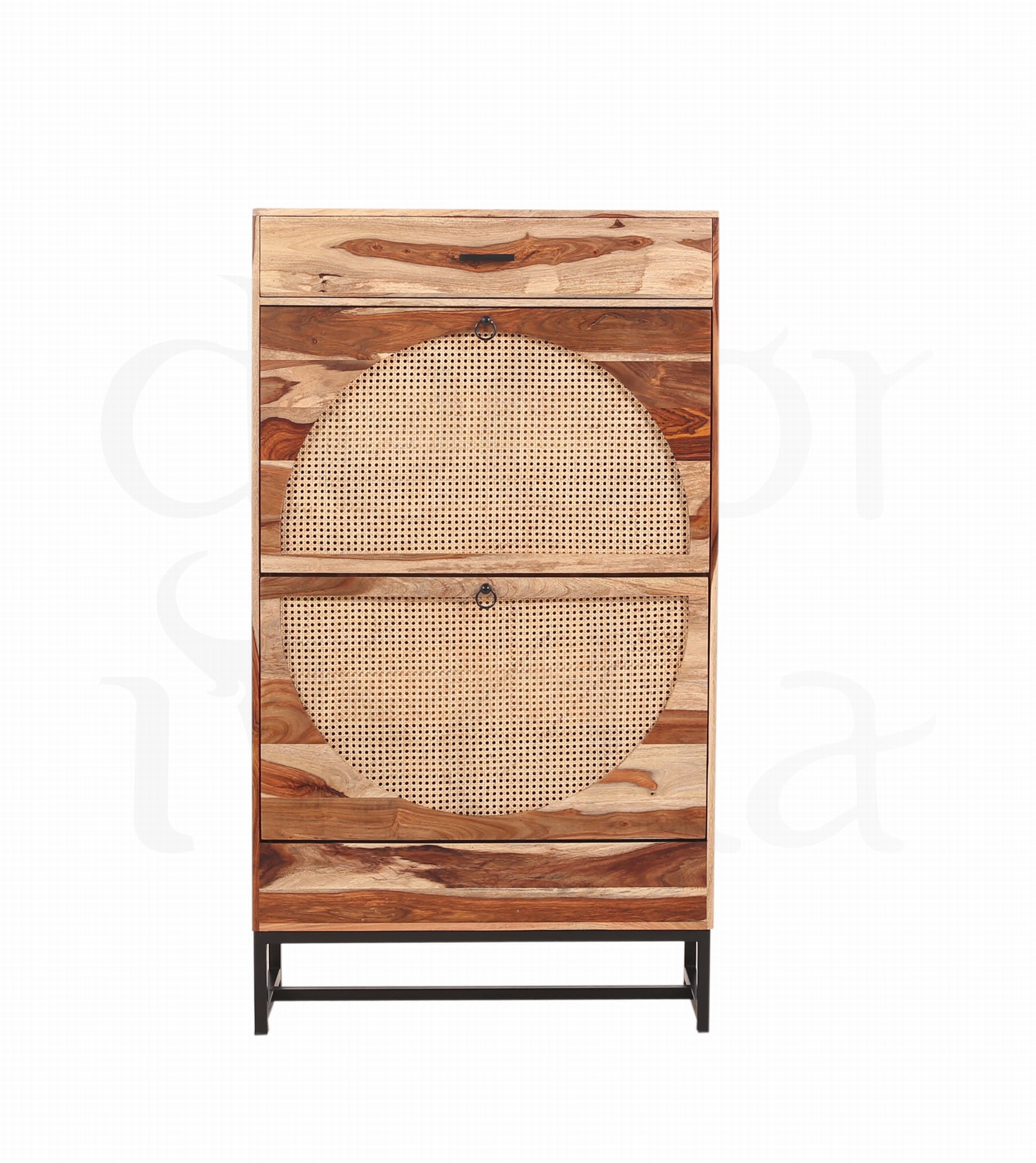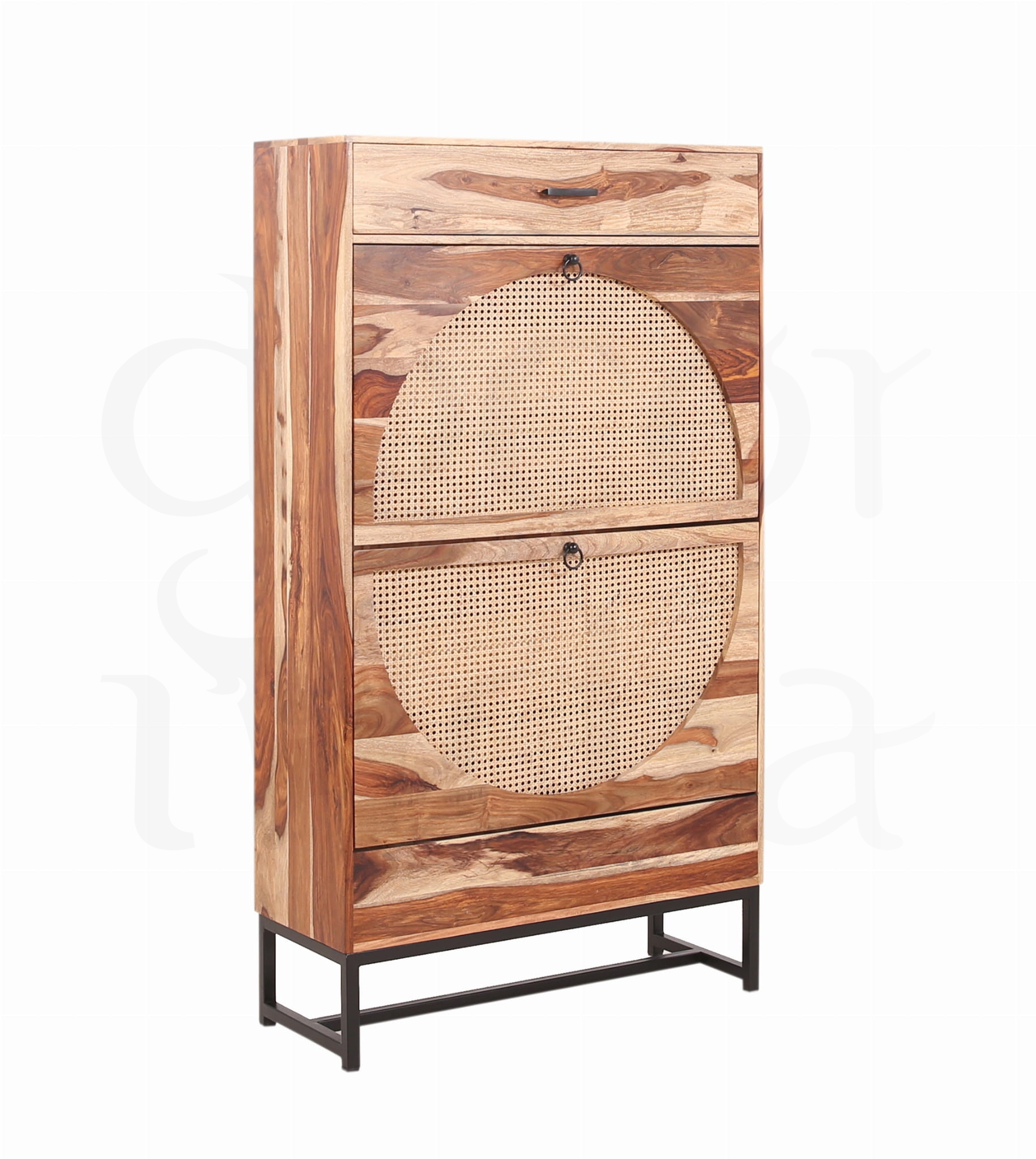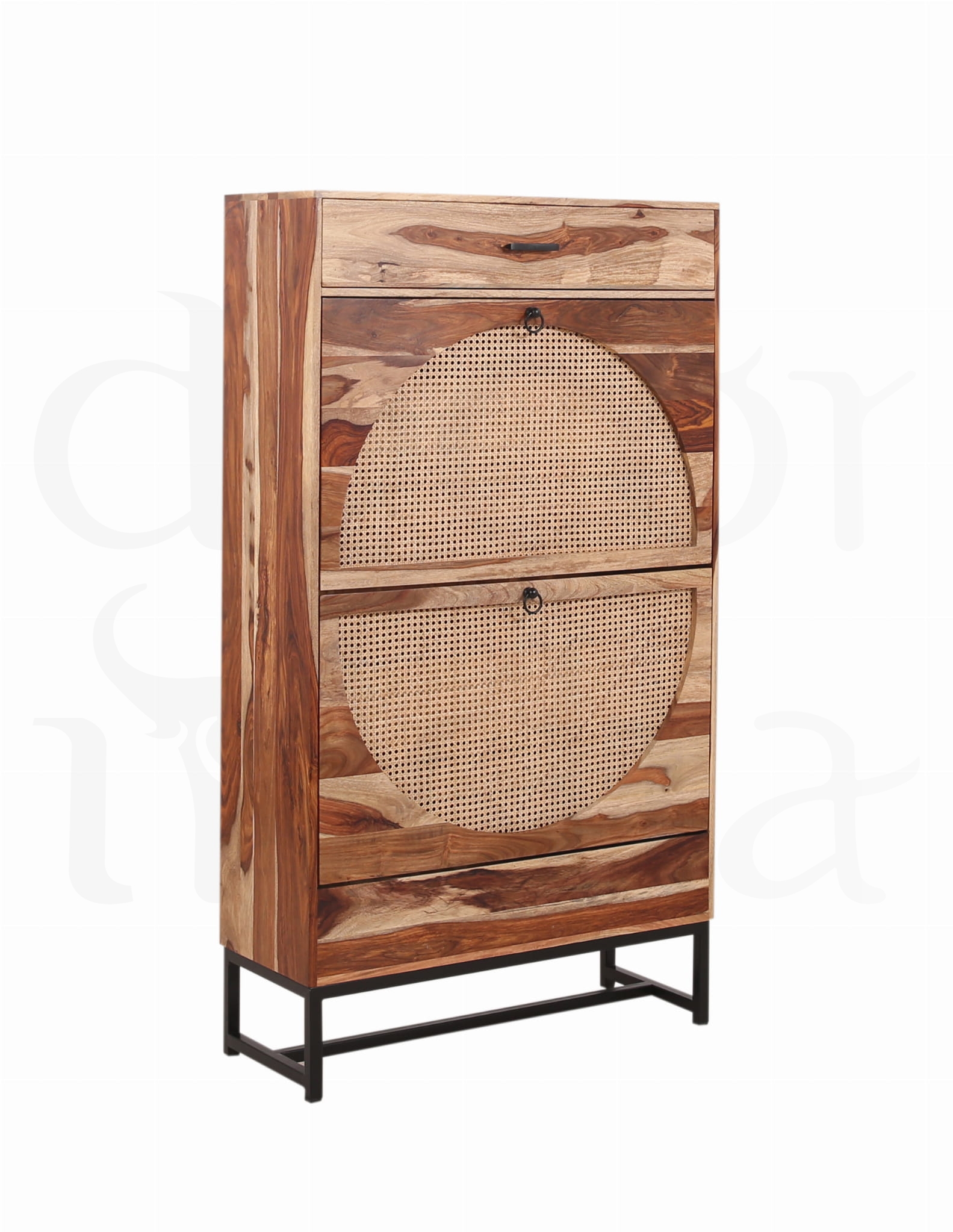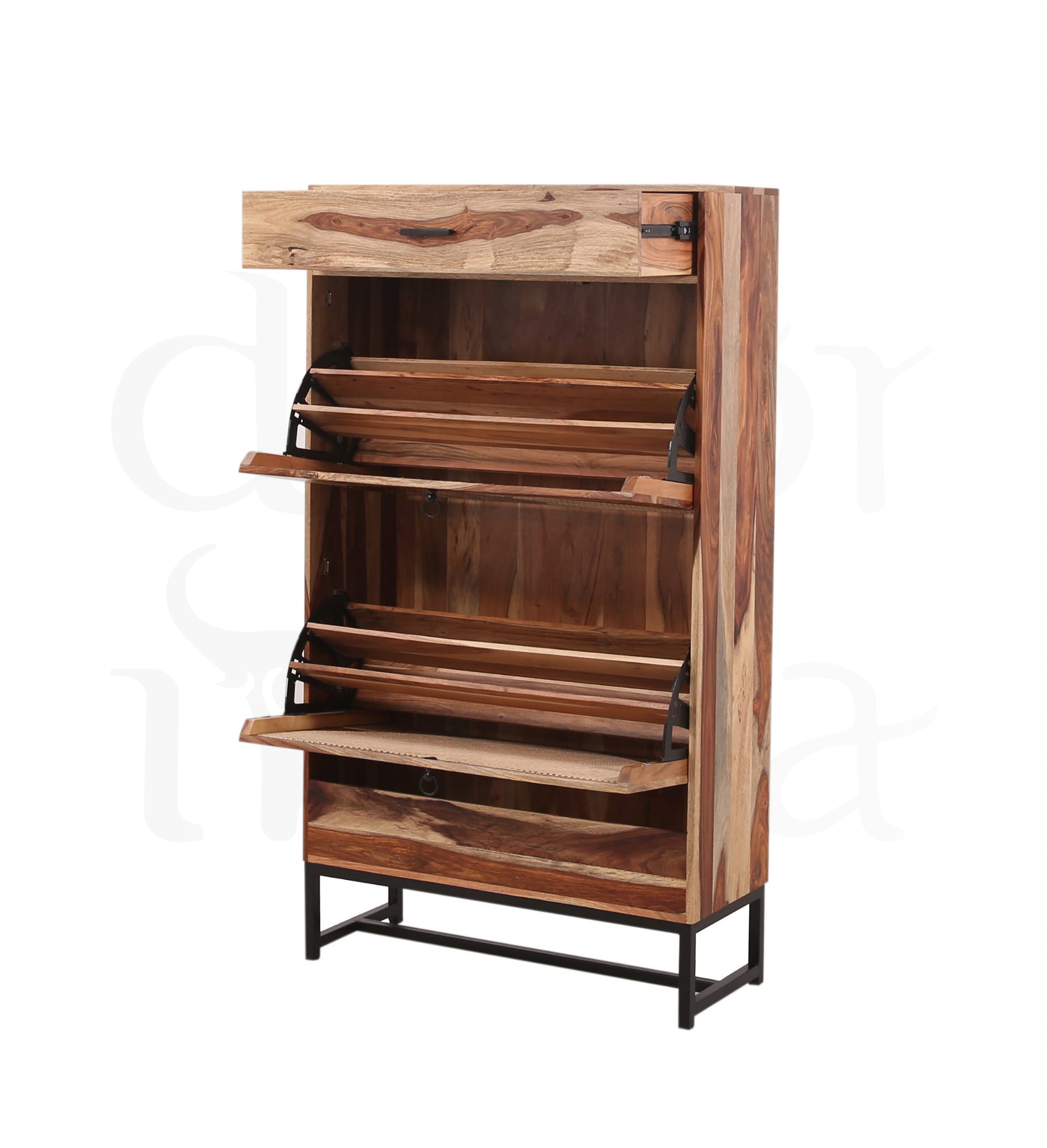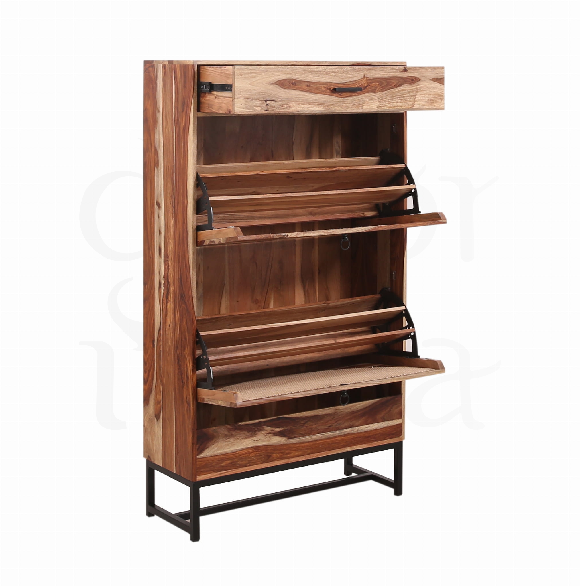 Elegancka i solidna szafka na buty wykonana z wysokiej jakości drewna palisandrowego (sheesham) to połączenie wyjątkowego rzemiosła i naturalnego piękna. Cechą charakterystyczną palisandru jest jego unikalne usłojenie oraz ciepły, głęboki kolor drewna w naturalnym wykończeniu, który dodaje wnętrzu klasy i charakteru.