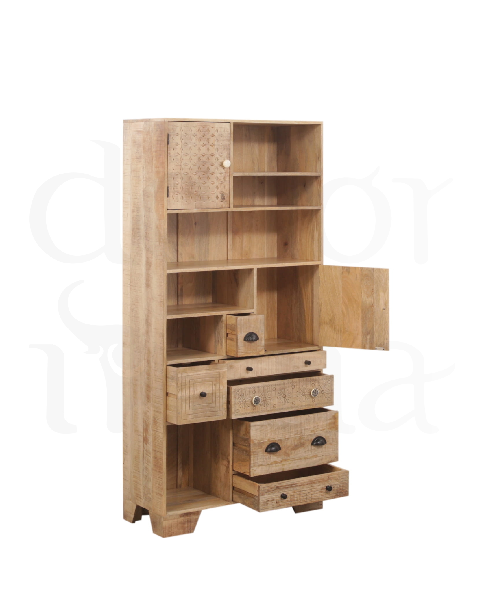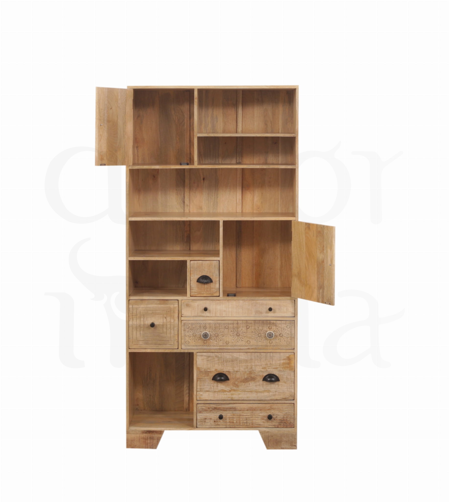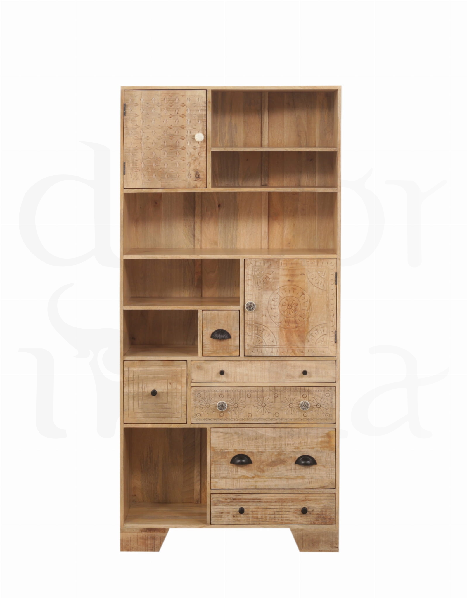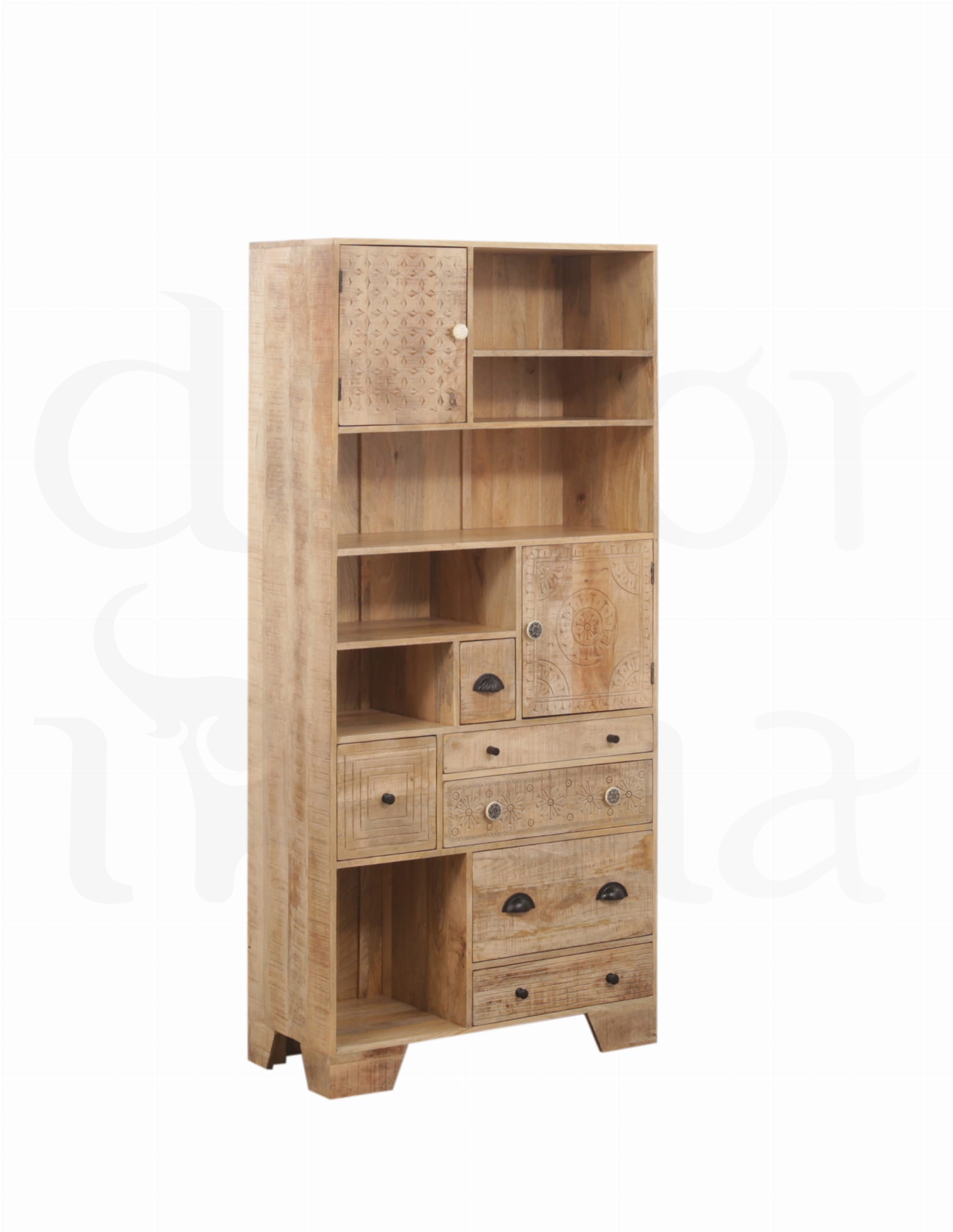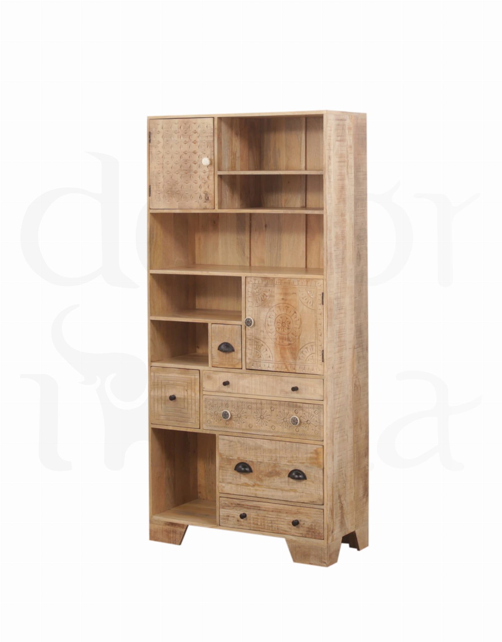 Stylowy regał połączony z witryną wykonany z litego drewna mango