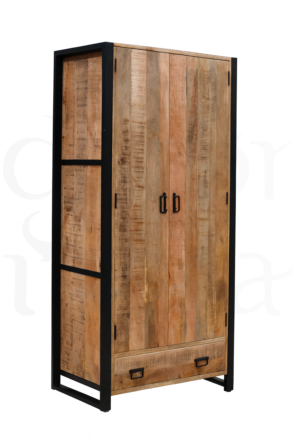 Ta stylowa szafa została wykonana z naturalnego drewna mango, które charakteryzuje się pięknym, ciepłym odcieniem oraz wyraźnym rysunkiem słojów. Fronty i boki zachowują surowy, rustykalny wygląd, podkreślony przez delikatne różnice kolorystyczne typowe dla litego drewna.